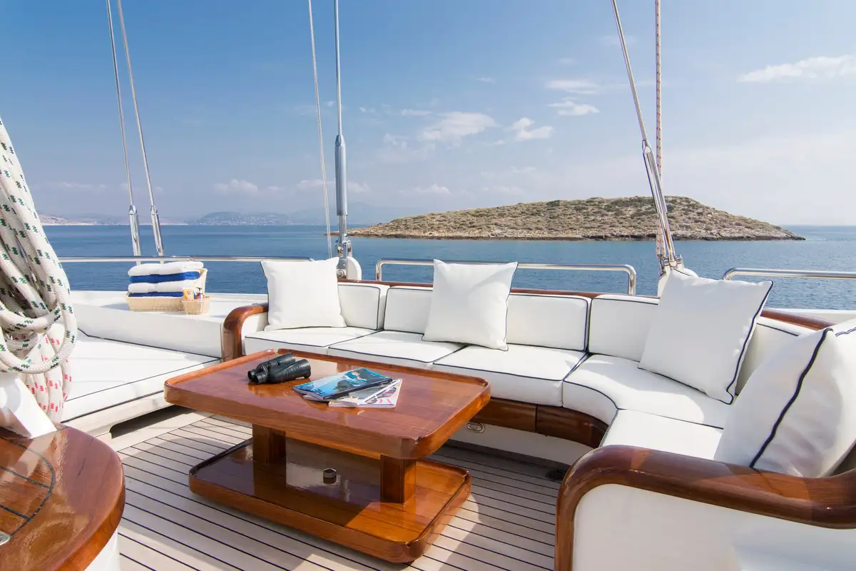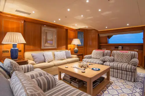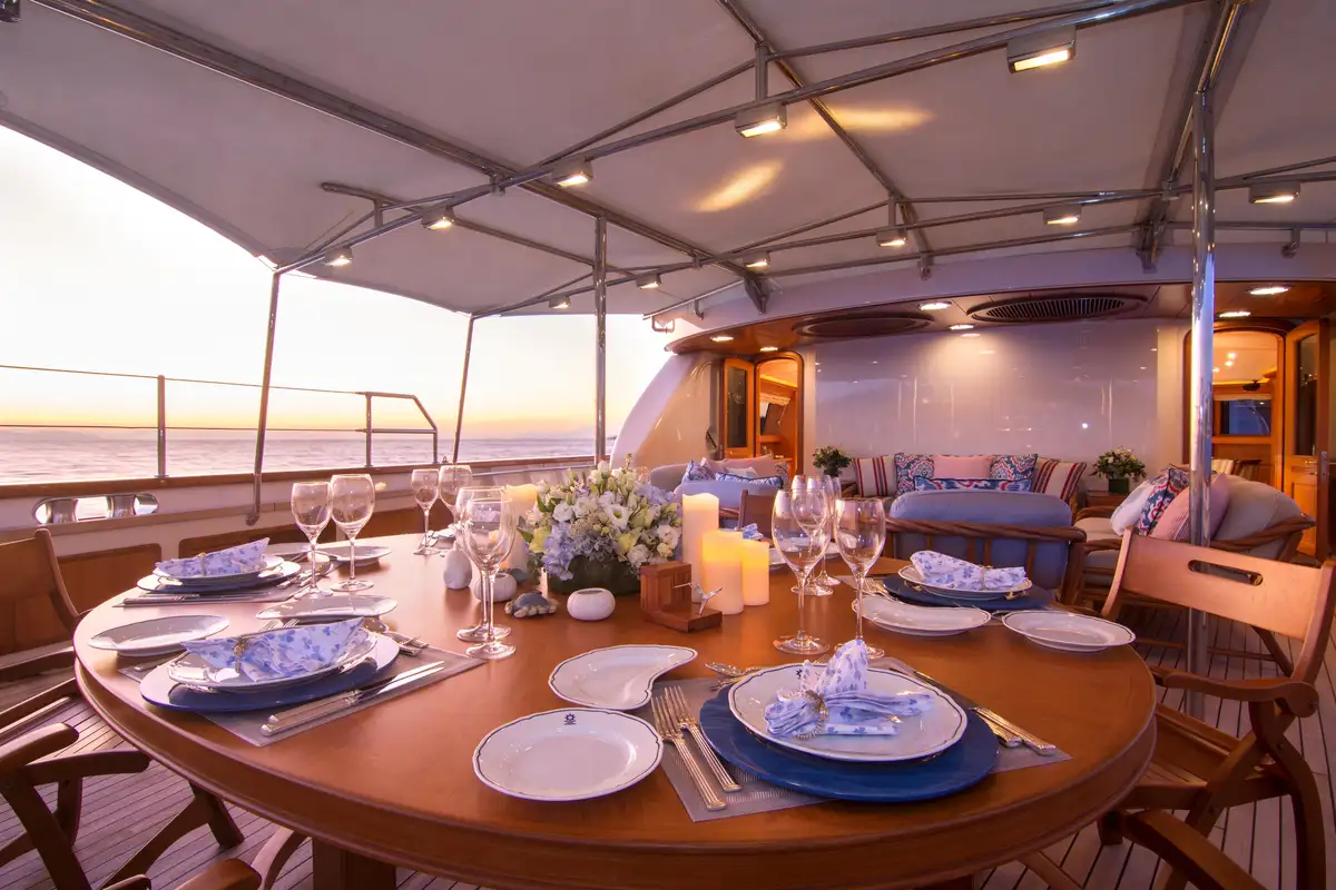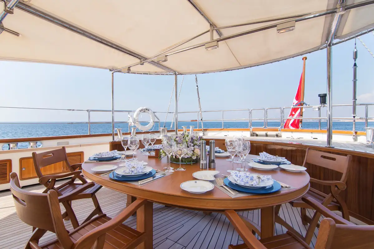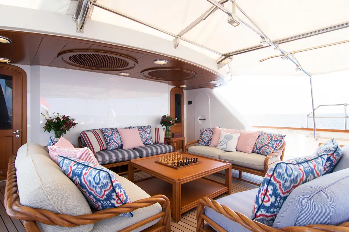 On the main deck aft, a large round dining table seats 12 guests in a shaded setting, whilst a low seating sofa arrangement compliments the charming feel of this area.