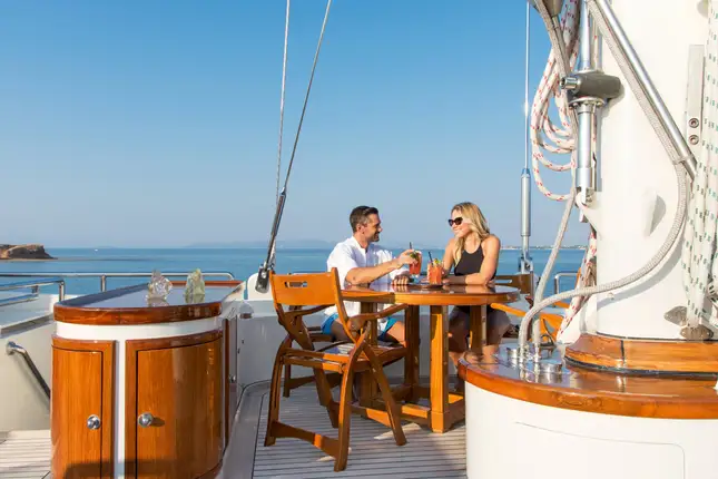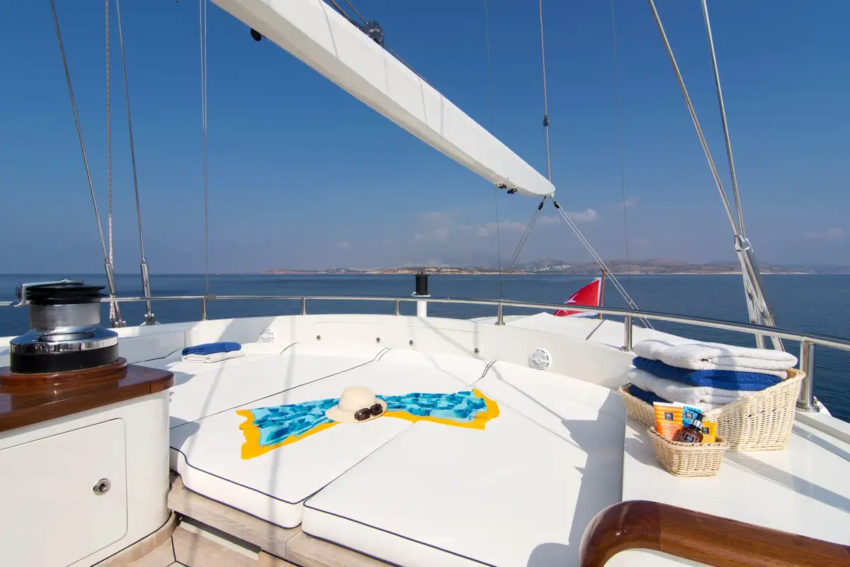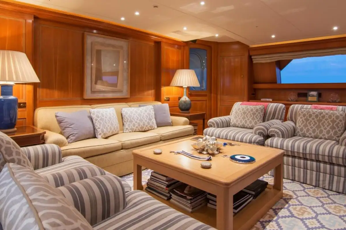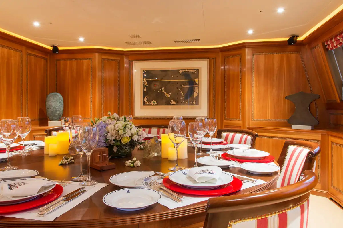 On the main deck aft, a large round dining table seats 12 guests in a shaded setting, whilst a low seating sofa arrangement compliments the charming feel of this area.