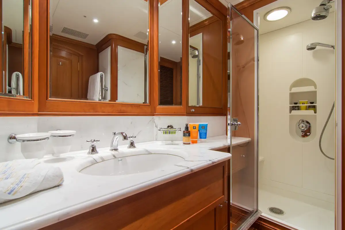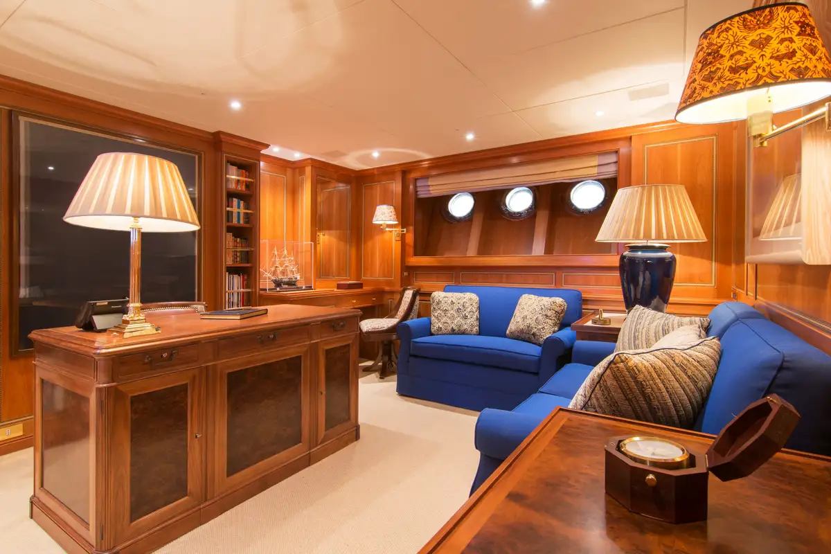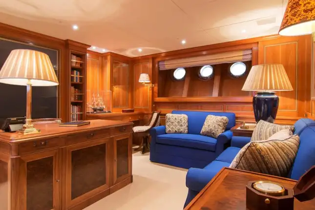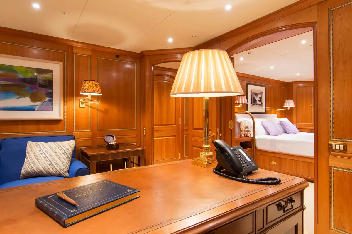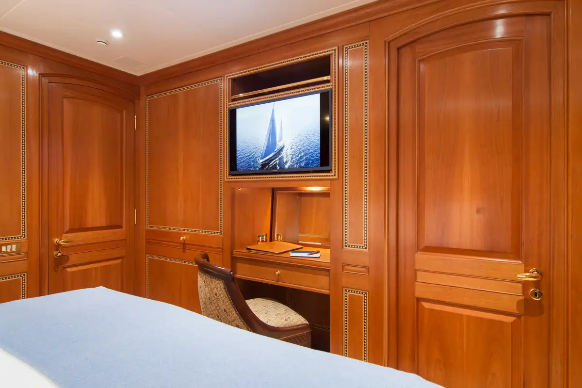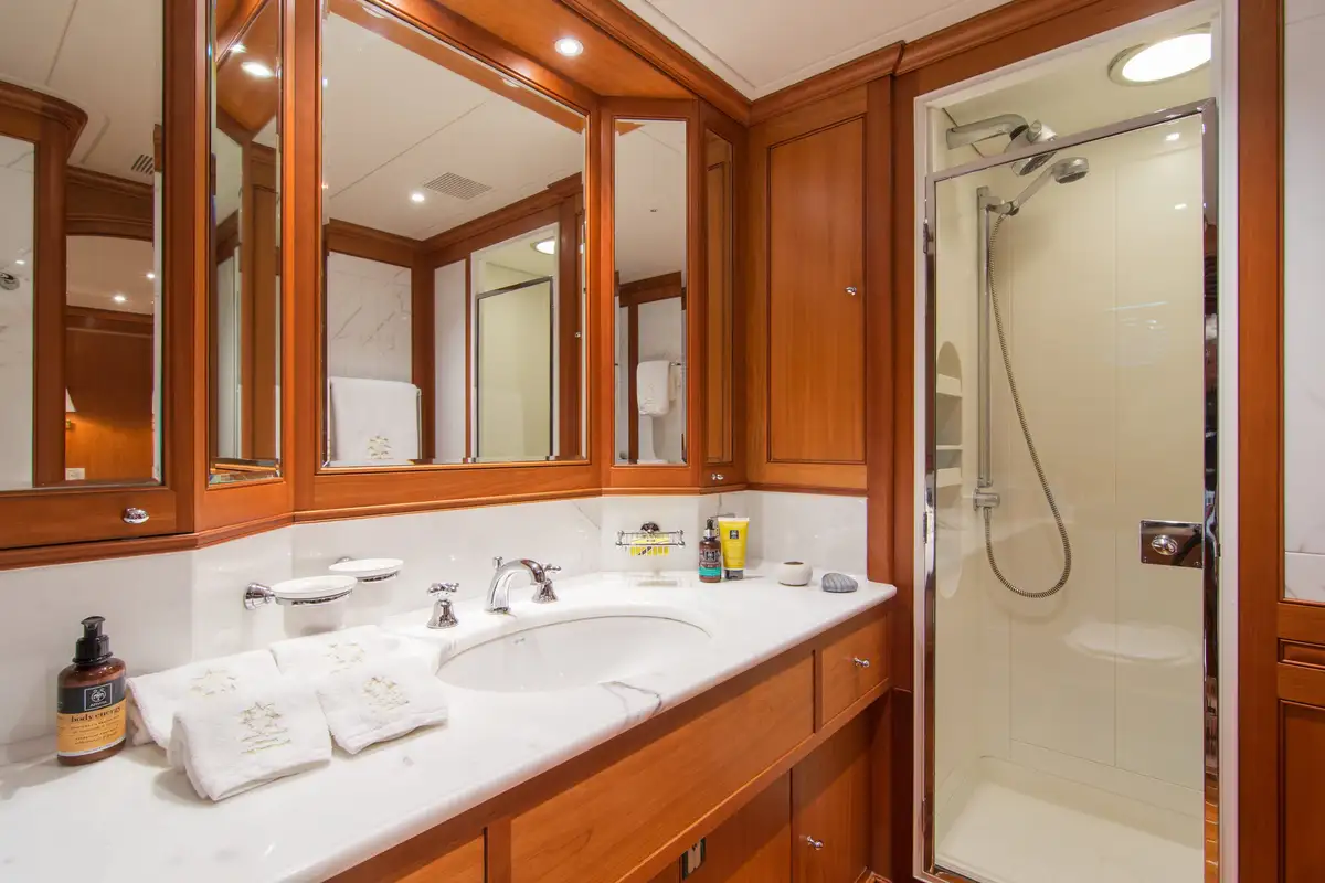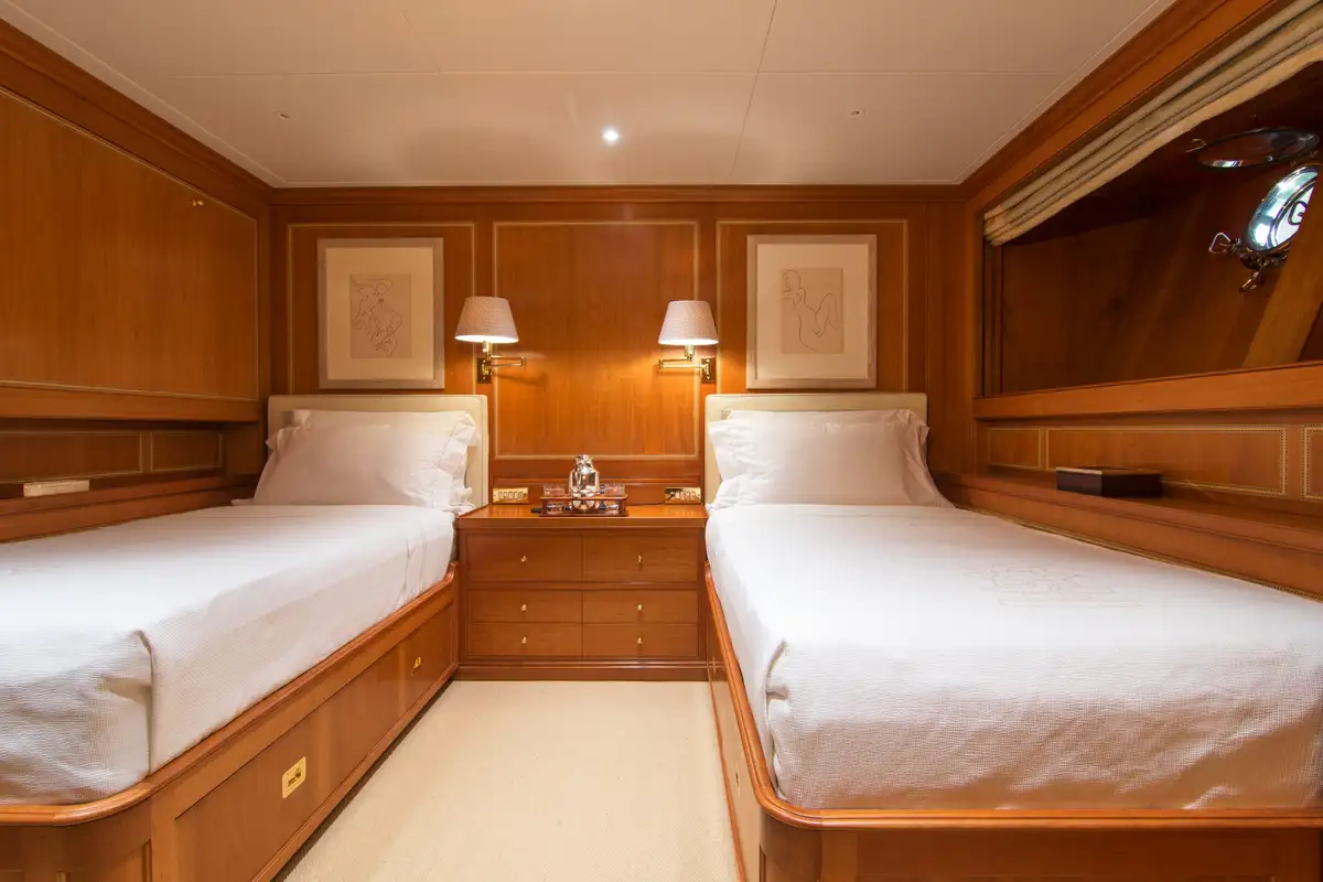 Five large guest cabins are located on the lower deck. The spacious full beam owner's suite has an adjoining lounge and study together with ensuite his/her bathrooms, one with a tub plus there is a sauna. Additionally there are two double and two twin guest cabins (both twins have additional pullman beds), all with en suite facilities.