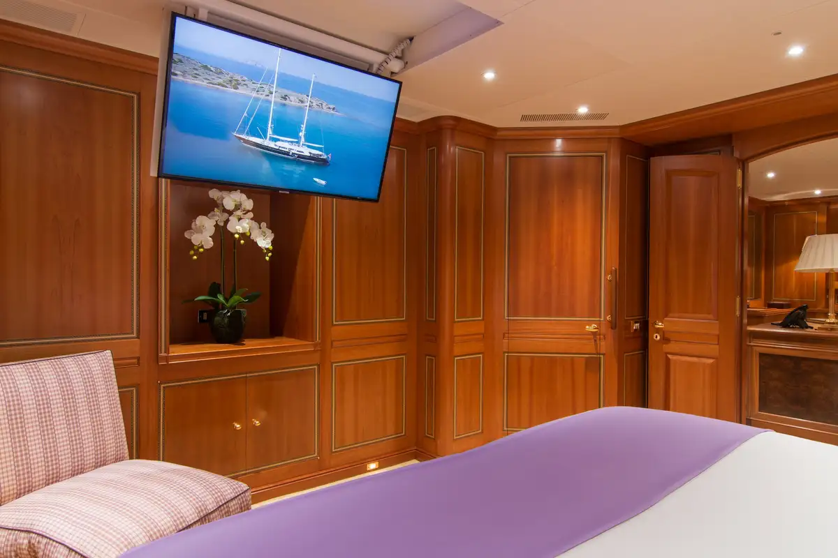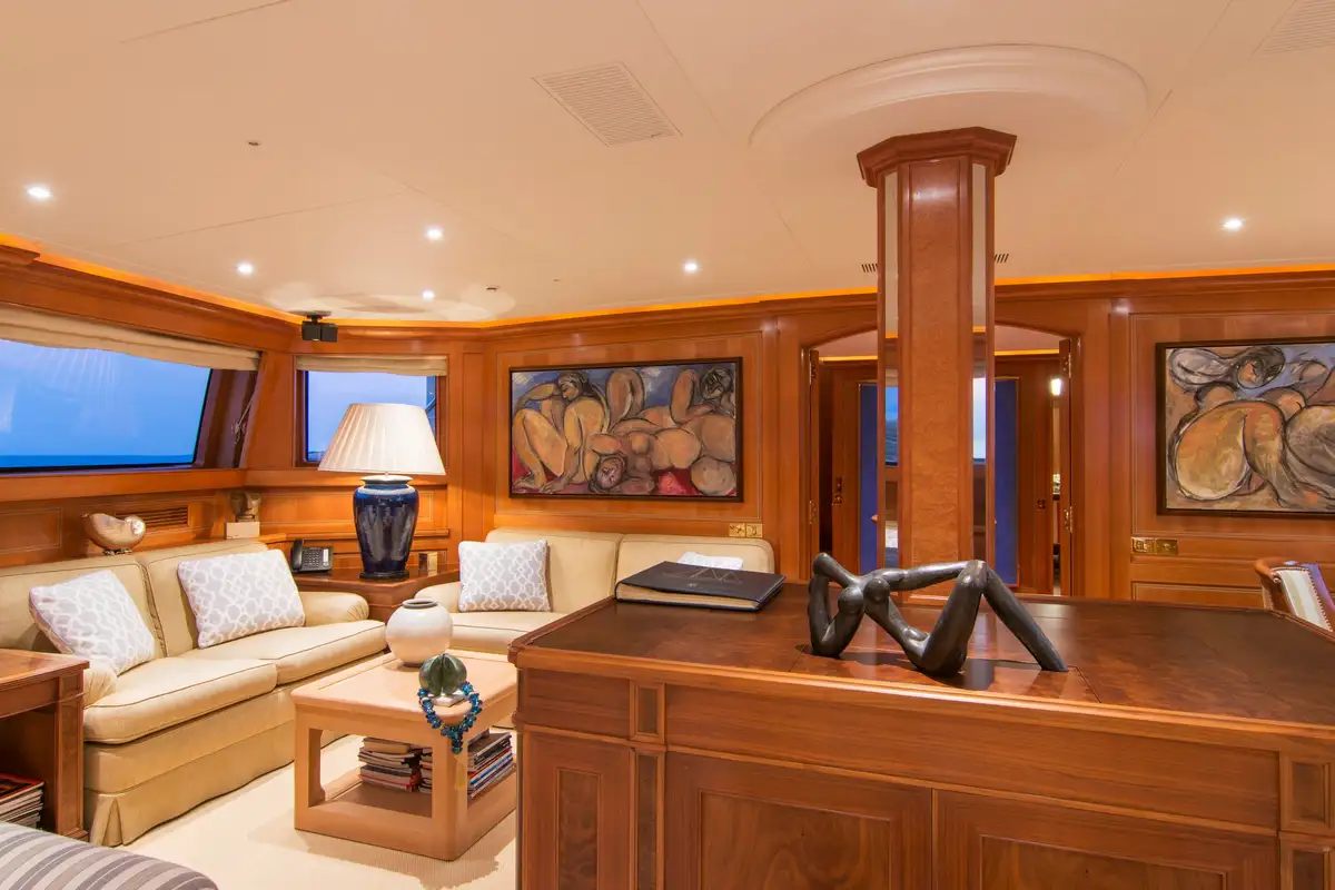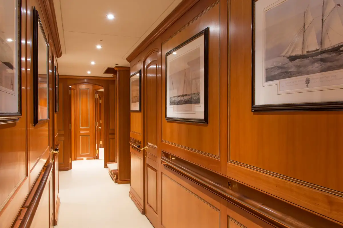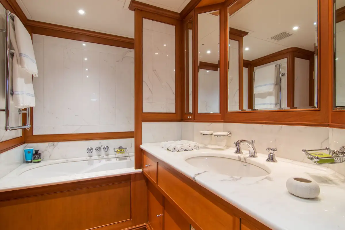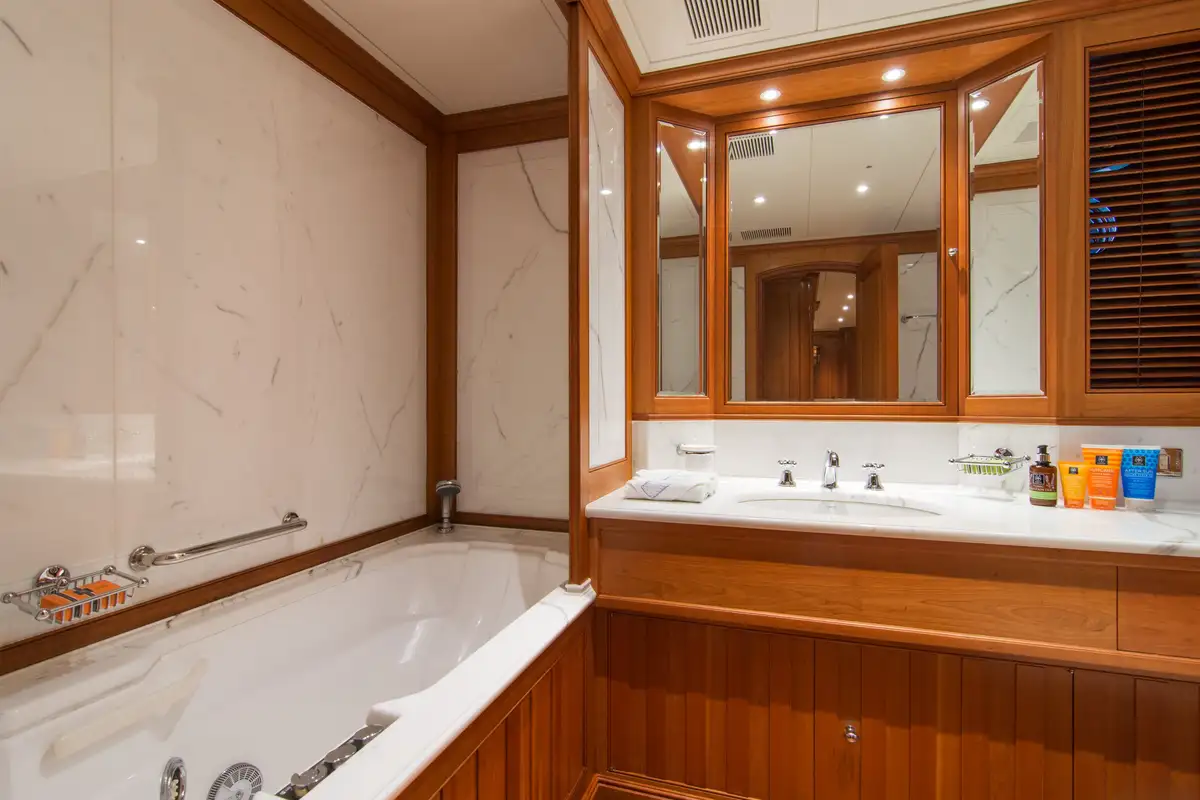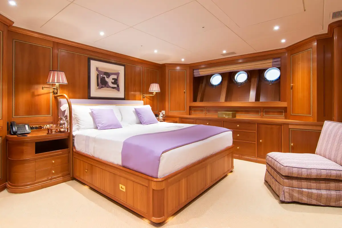 Five large guest cabins are located on the lower deck. The spacious full beam owner's suite has an adjoining lounge and study together with ensuite his/her bathrooms, one with a tub plus there is a sauna. Additionally there are two double and two twin guest cabins (both twins have additional pullman beds), all with en suite facilities.