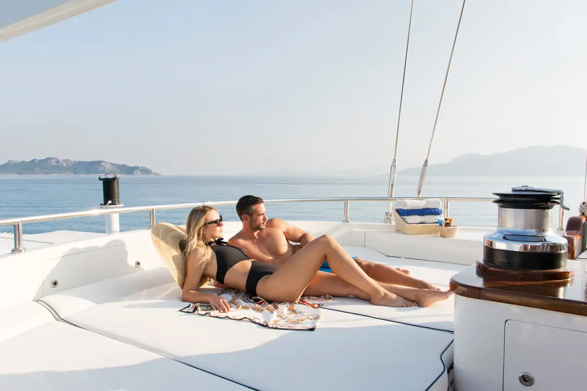 The flybridge has a generous sunbathing area, corner sofa seating and small dining table, making it perfect for guests who enjoy their chill out time.