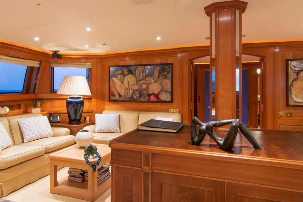 The spacious main saloon is tastefully decorated in contemporary style with top quality fabrics and with several seating choices. A separate dining lounge comfortably seats 12 guest for fine dining.