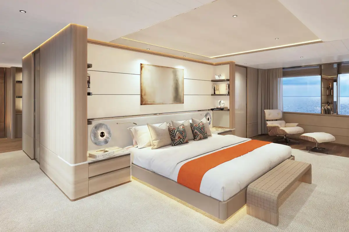 From the moment you step on board, you feel the owner’s vision brought to life – a yacht that dissolves the line between inside and out. RWD’s contemporary design immerses you in your surroundings: sunlight streaming through vast windows, sea breezes flowing through open lounges, and every detail drawing you closer to the ocean. A neutral colour palette is accented with pops of orange and blue that create a harmonious flow throughout XWAVE, while standout features add interest, from the bespoke Lasvit glass feature wall in the sky lounge to the Bocci lighting glass chandelier feature in the stairwell.