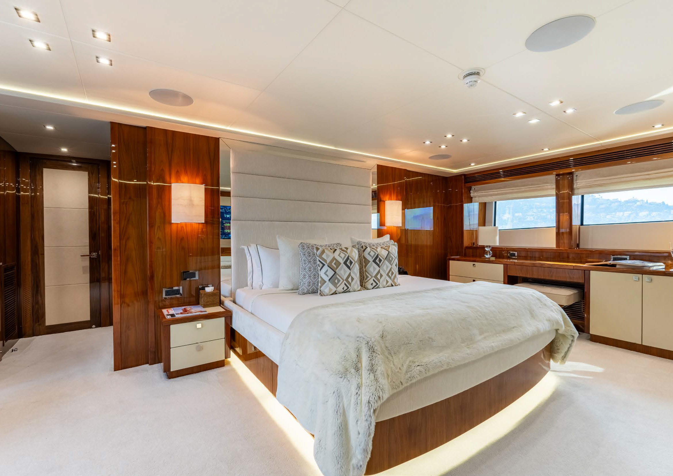 Inside, ANYA welcomes up to 12 guests in five cabins. The owner’s suite is full beam and forward on the main deck. Forward is an en suite with bath and shower room, three walk-in wardrobes and a large, four-panelled picture window to starboard. The lower deck is home to two double cabins and two convertible cabins, each of which has an additional berth. All lower deck cabins are en suite with shower rooms.