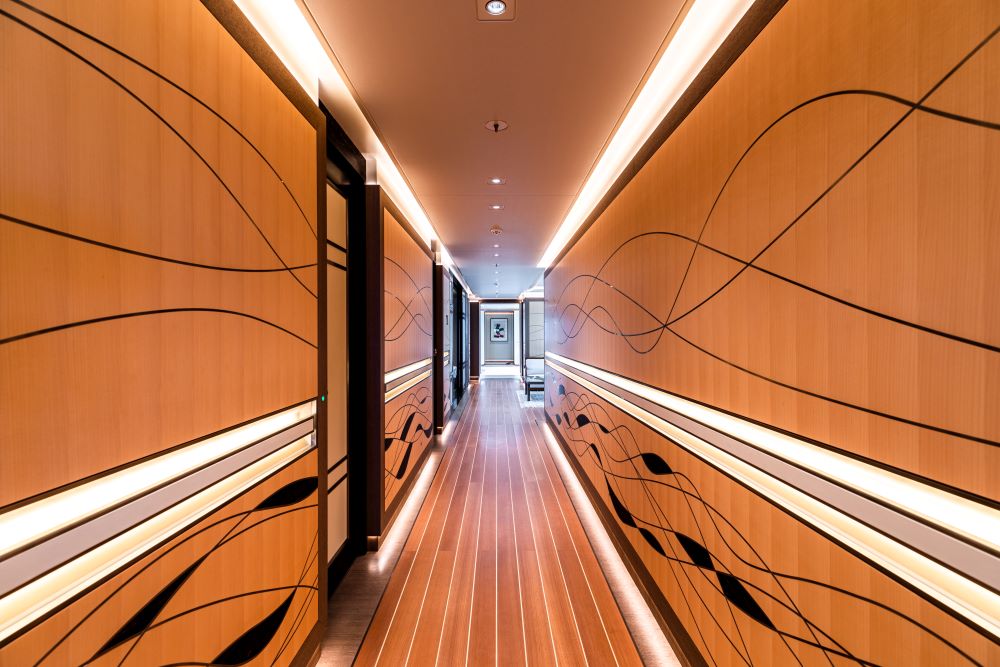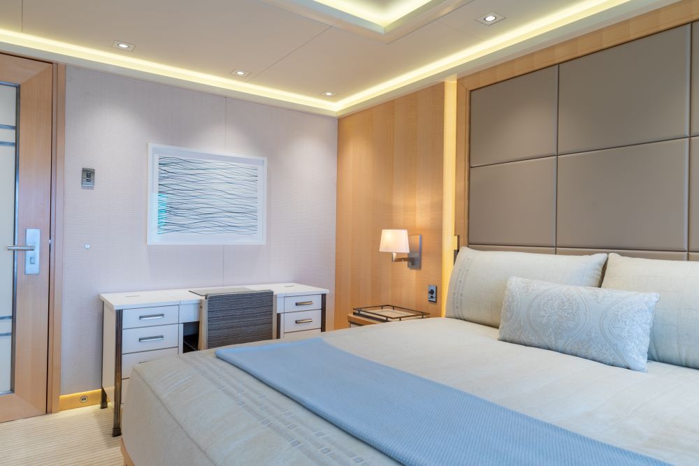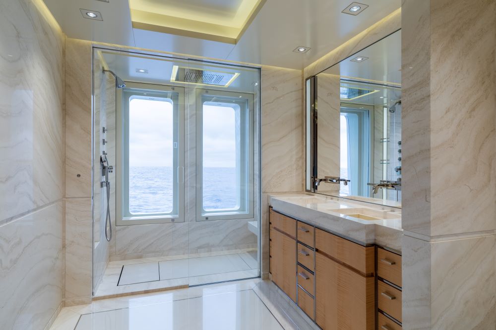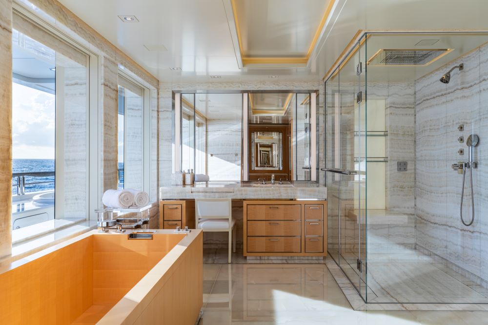 'When it’s time for bed, there are six guest suites on the main deck and the two furthest forward are VIP suites. The master suite, forward on the upper deck, is amazing, more like a luxurious apartment. Inside there is a bedroom with panoramic views, his-and-hers bathrooms with baths and shower rooms, his-and-hers walk-in wardrobes, a study and a lounge for exclusive use. Walk outside and there is a private lounge and jacuzzi, balconies on both sides and the whole foredeck is a private terrace.