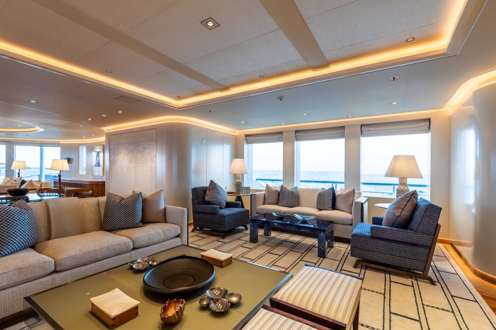 The big news is that this yacht has never chartered before, she's only ever been used privately - in fact these are the first ever glimpses of her Sinot interiors. They are deeply stylish with restful and welcoming earth tones, huge windows and wonderful recessed light features. She's in immaculate condition, she has flawless pedigree and Captain Daniel George and his crew can't wait to delight her first party of guests.