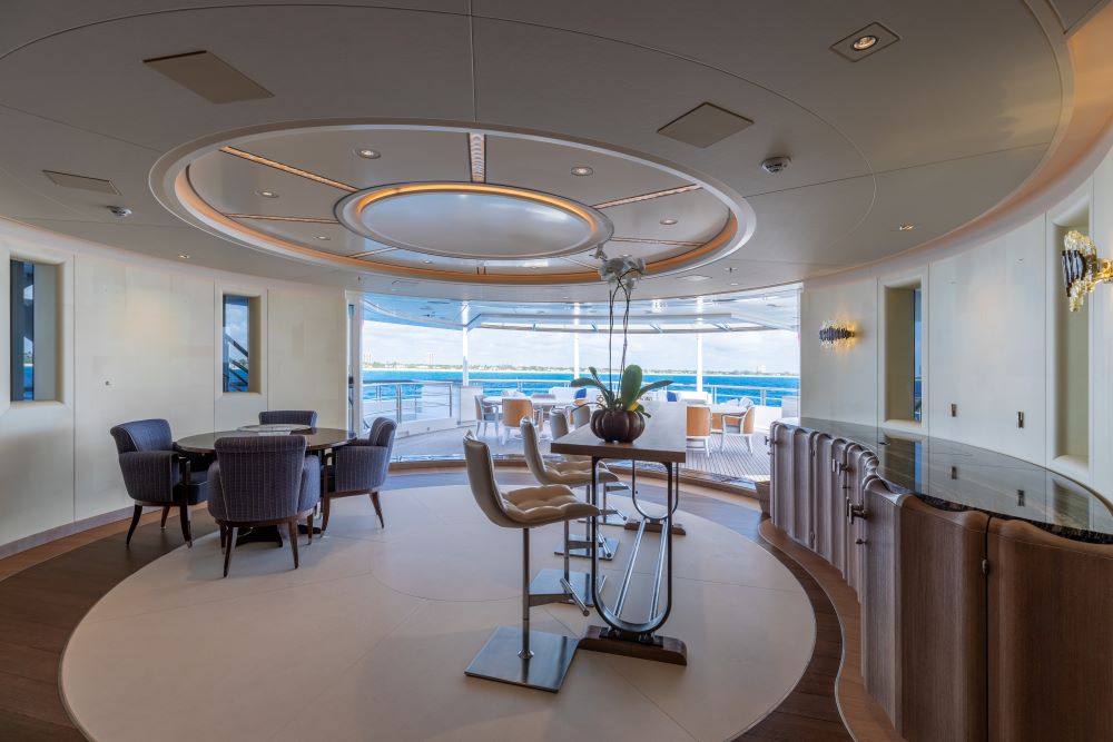 'The main deck aft is somewhere families can spend all day if they want to,' adds Caroline. 'There's the big circular pool, 5m wide is a good size for splashing about, and plenty of space to sit or lie in the sun or shade. Enjoy a coffee and a snack at the bar, get together with a drink as the music plays or relax on your own with a book. Whatever you want to do, there's a space for it. And there's a very big swim platform, easily big enough for sunloungers, seats and tables if you feel like dining by the water's edge. By day this is where the crew can help you enjoy the huge selection of watertoys that have always been a hallmark of CLOUD 9 yachts.