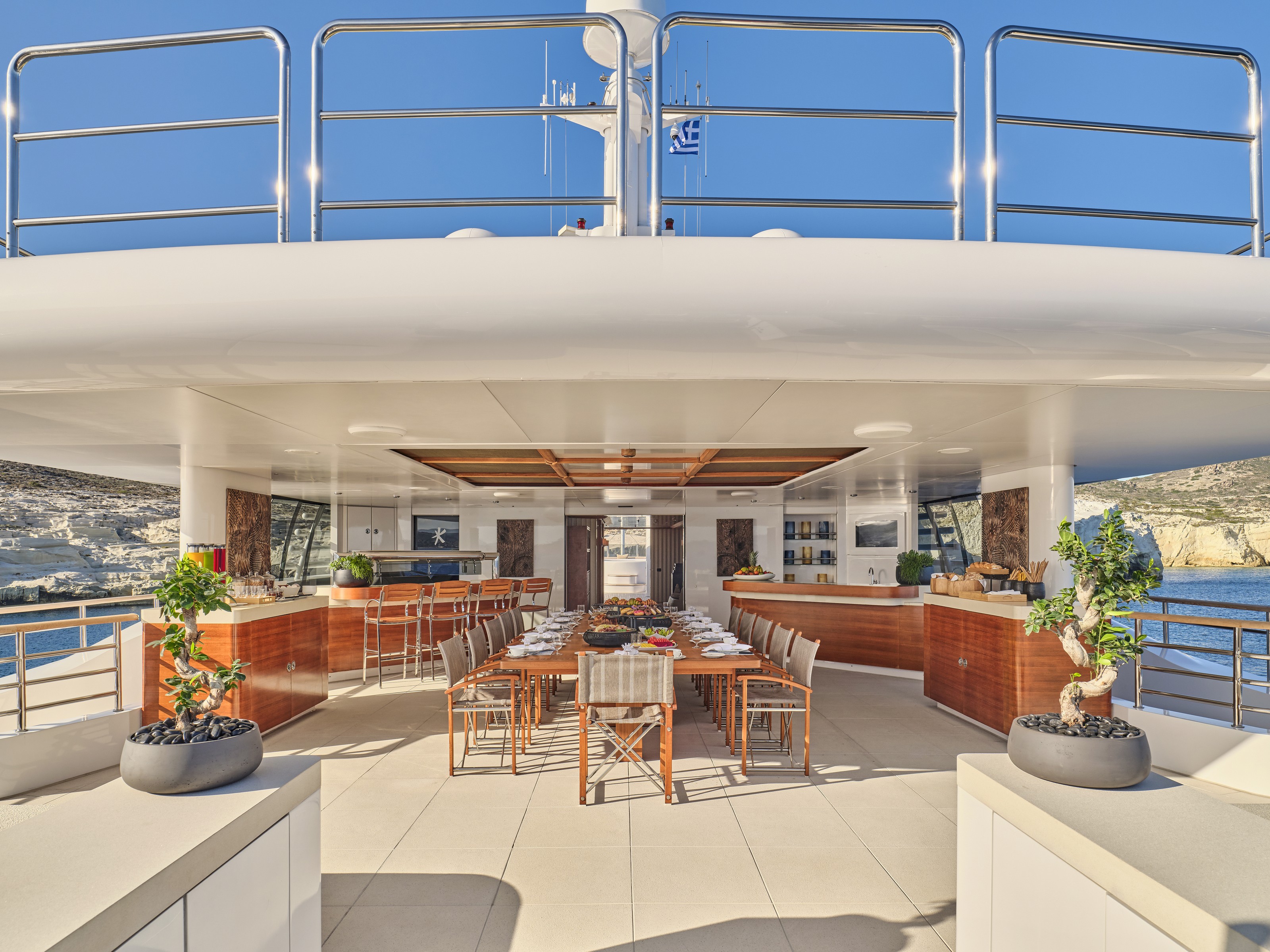 Light-filled interiors combine polished marble, rich wood and soft textures to create warm social spaces and serene private retreats. Out on deck, the expansive sun deck – complete with a raised jacuzzi, bar and lounging areas – invites sunny days and starry evenings, while the foredeck lounge is perfect for sunrise coffee or a sunset aperitif. With stylish accommodation for up to 12 guests across five cabins and plenty of toys and tenders for endless fun on the water, GIOIA is perfect for your next Grecian escape.