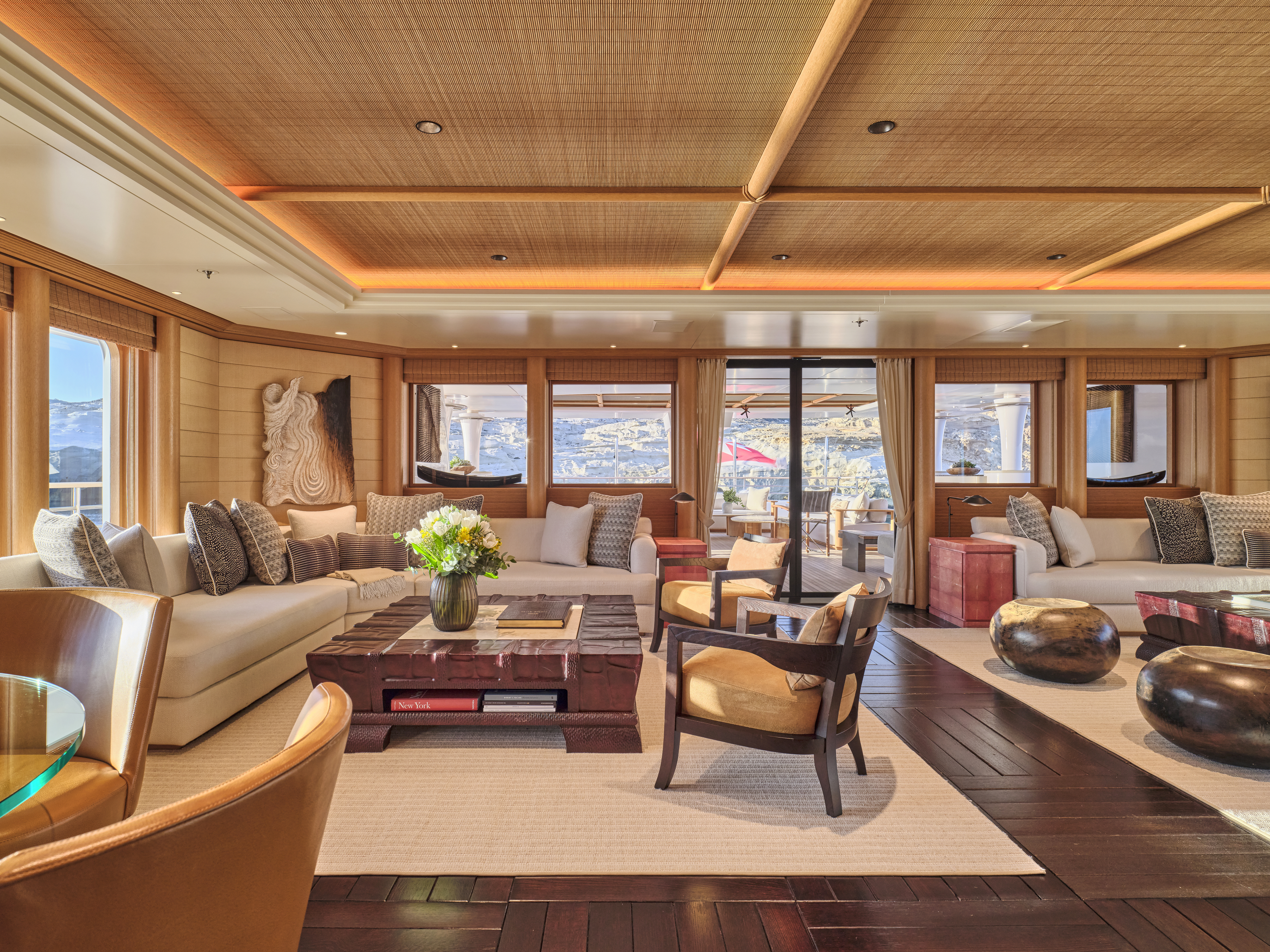 VICTORIA DEL MAR joins the charter fleet in style, unveiling a calm, contemporary interior by Claudette Bonville Associates that feels both effortlessly elegant and instantly welcoming. The light-filled main lounge flows into a formal dining area for 12, where refined woodwork, sculptural details and a striking blown-glass chandelier set the scene for memorable gatherings, day or night.