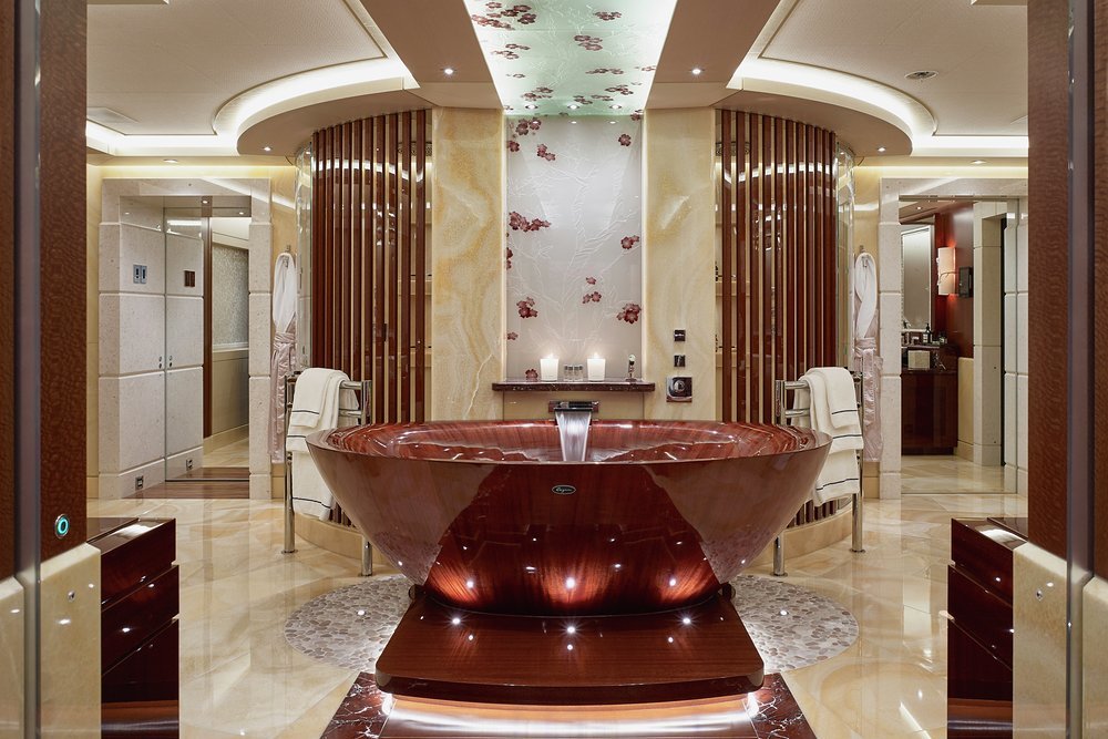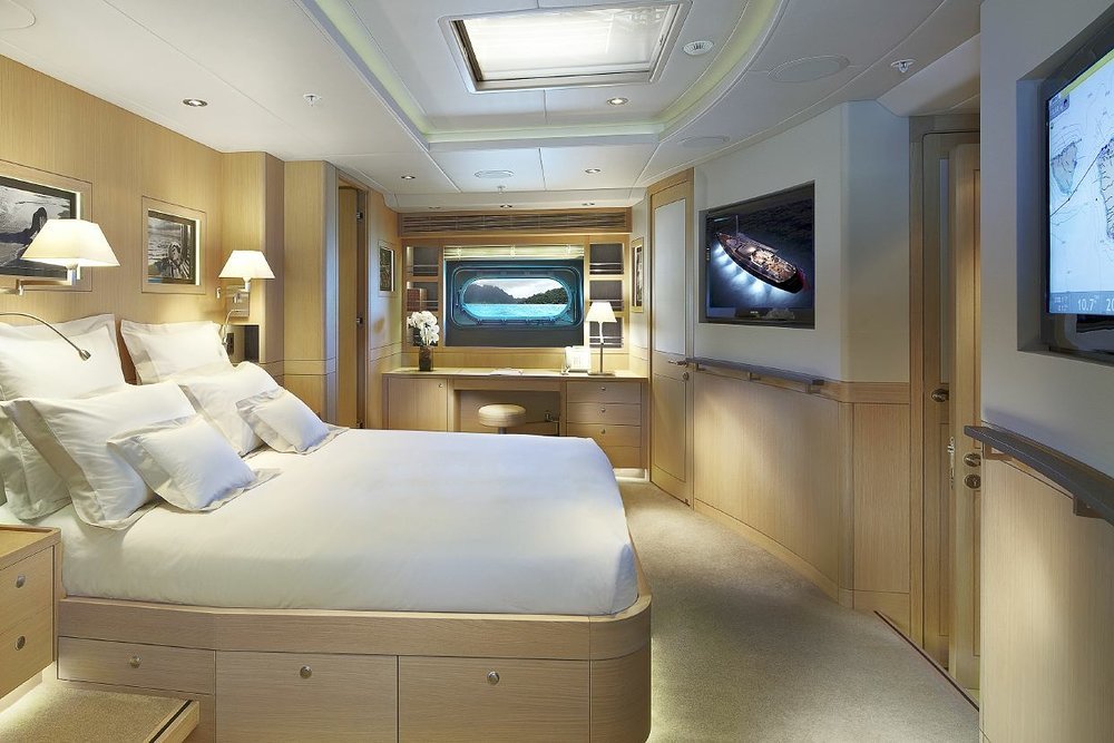 Offering vast deck space and lavish accommodation for 18-22 guests in 9-11 cabins, TRANQUILITY's substantial volume of 2,998GT is particularly apparent on the upper deck, where there is a huge owner's suite with private terrace and jacuzzi, a piano lounge, dining room and a huge circular pool and helipad on the aft deck. Amenities include a wellness spa, beach club and gym with a sea terrace on the lower deck with direct access from the guest lobby.