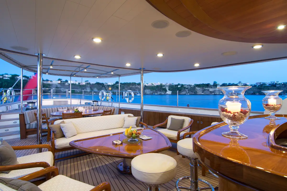 The flybridge is large and open with lounge seating port and starboard behind the helm station, a staircase spiralling around the mizzen mast and a hot tub aft surrounded by sunpads. The aft cockpit is shaded by the overhang and features a bar forward, informal lounge with armchairs around a coffee table and open-air dining aft featuring a curved banquette aft.