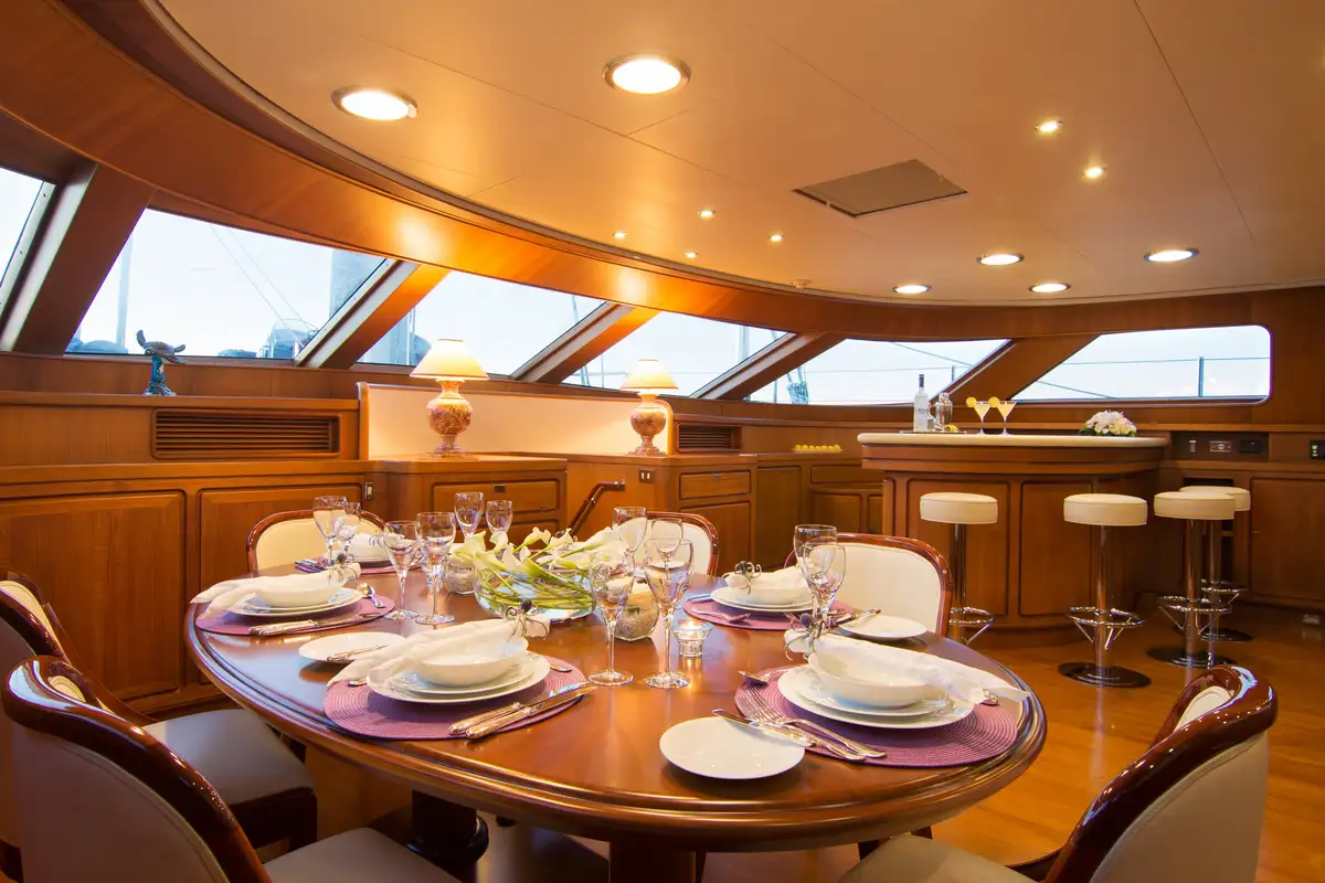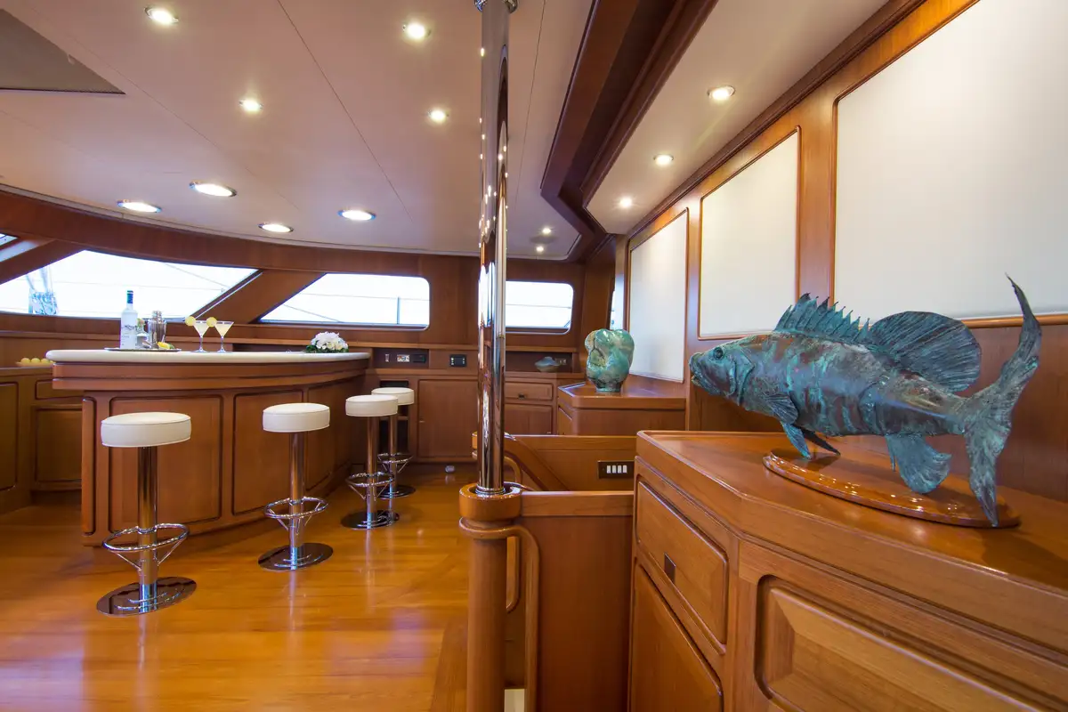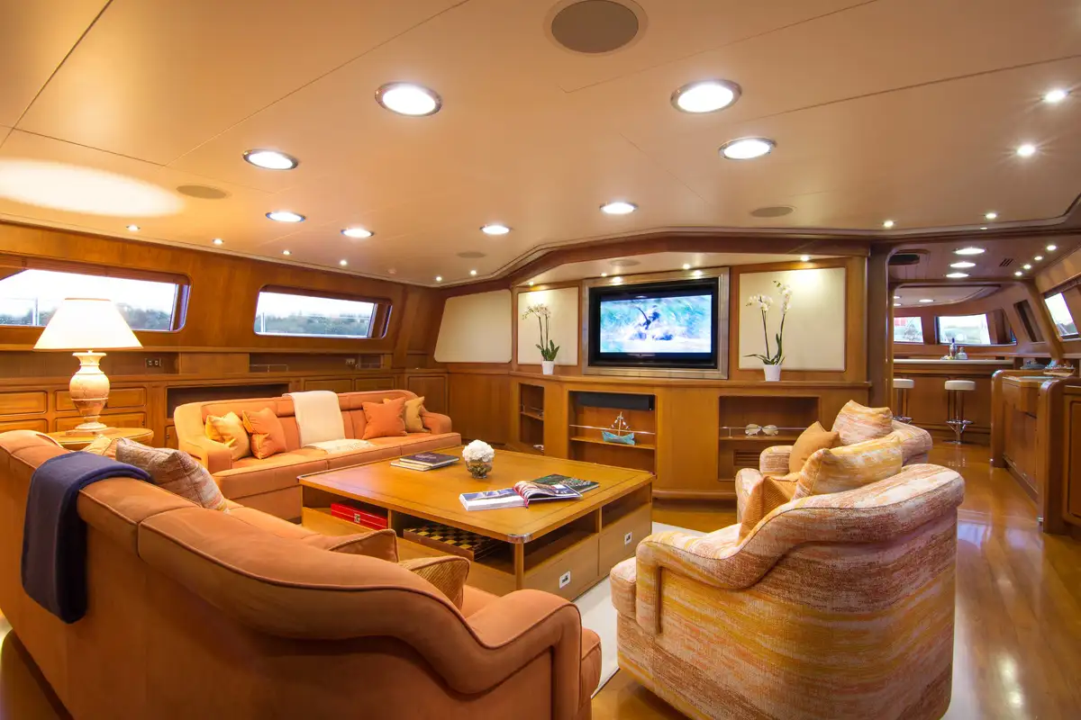 The interior main deck is bright and cosy and divided into the forward dining/bar area and the formal saloon aft, separated by a raised pilothouse. Large windows allow ambient light into the entire main deck. The saloon has two large sofas and several armchairs around a large square coffee table. The forward wall has a 50in TV hidden behind retractable artwork. iPads control the surround sound and Crestron controlled AV systems throughout the yacht.