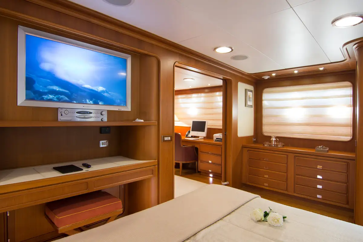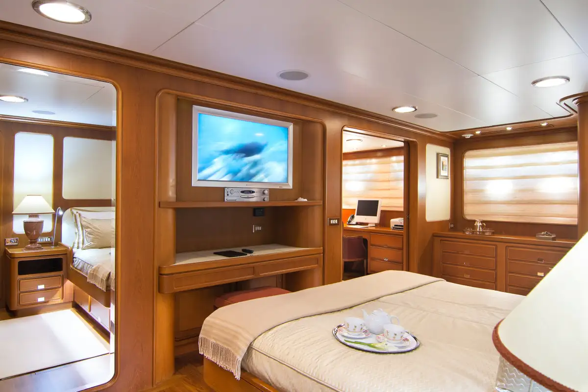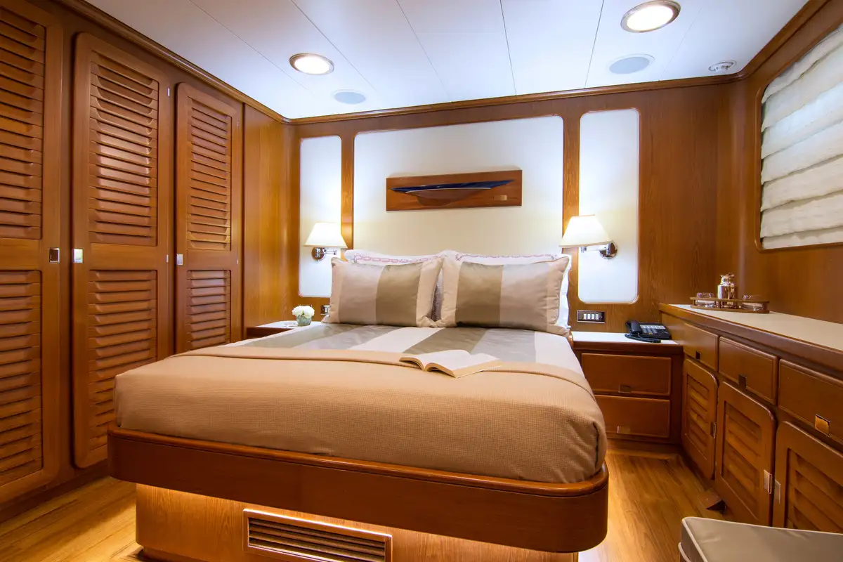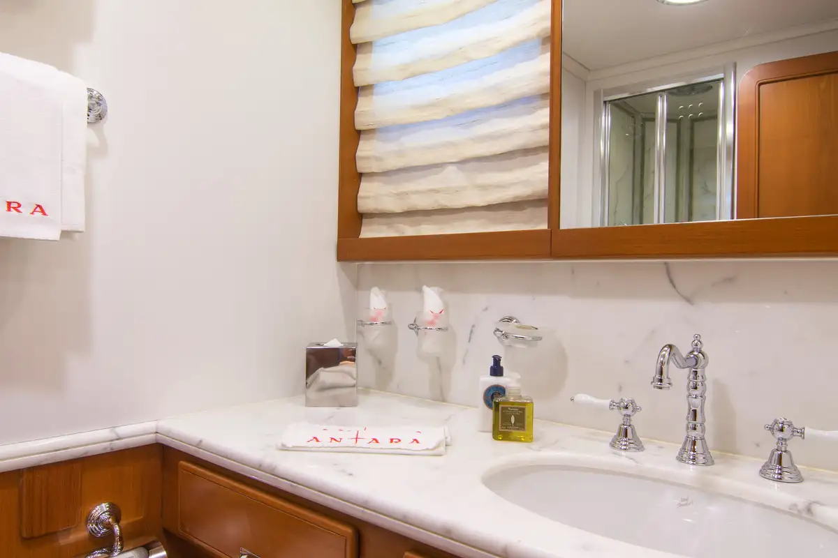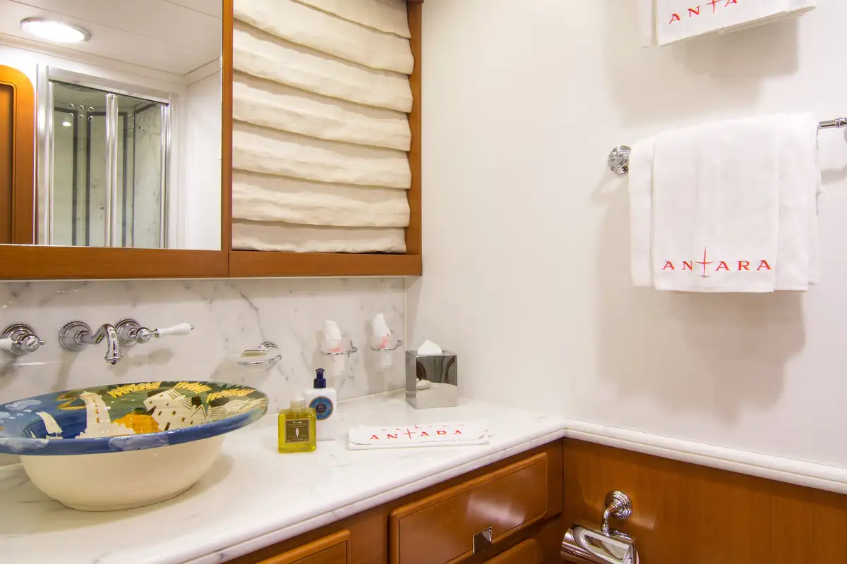 ANTARA can accommodate 10 guests in four satin-finished teak staterooms, all en suite. The full-beam owner’s suite has a king-sized double berth, his-and-hers basins, bath and new steam shower, a large office area and cleverly concealed private gym with a stationary bike and weights. There is a bulkhead-mounted TV and a drinks refrigerator.