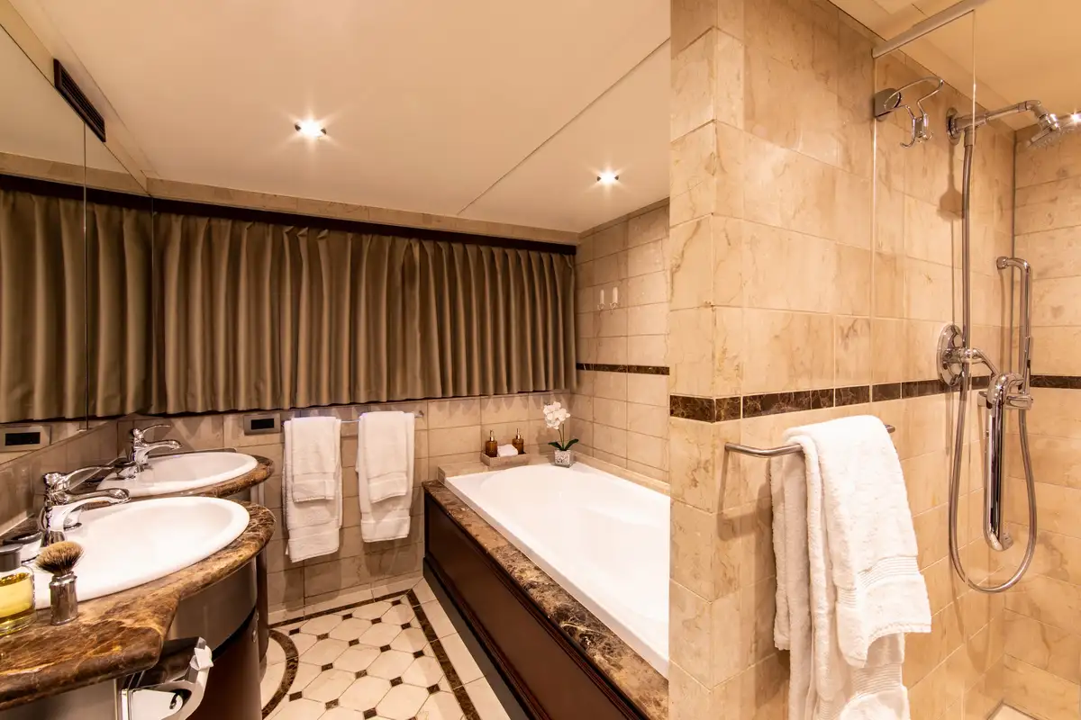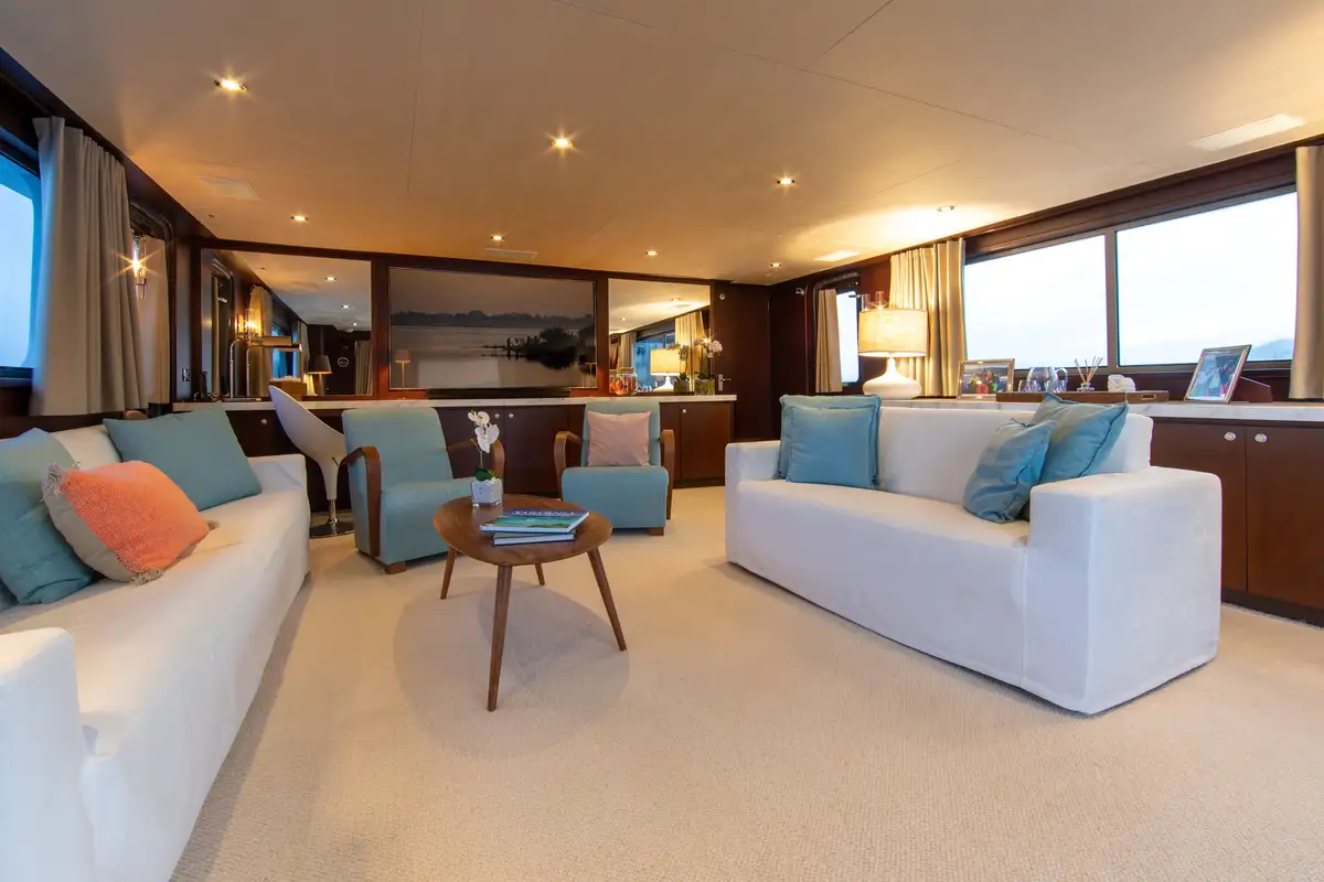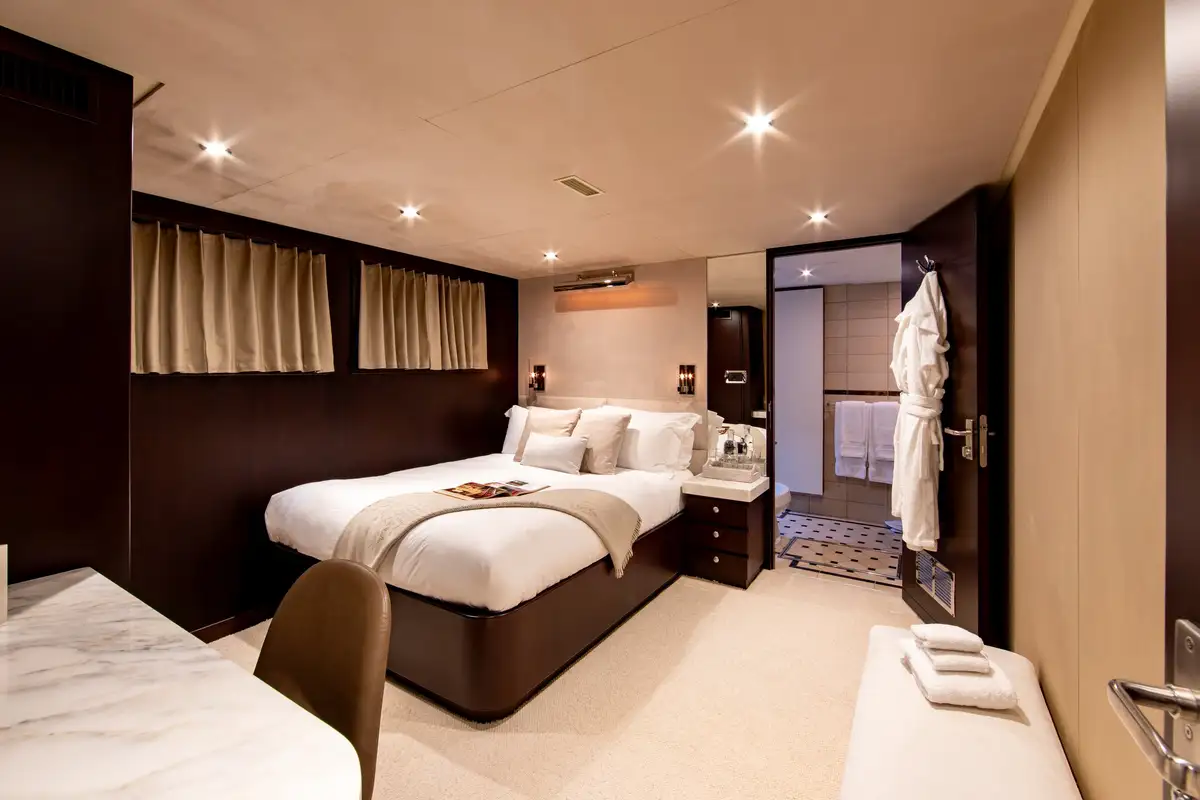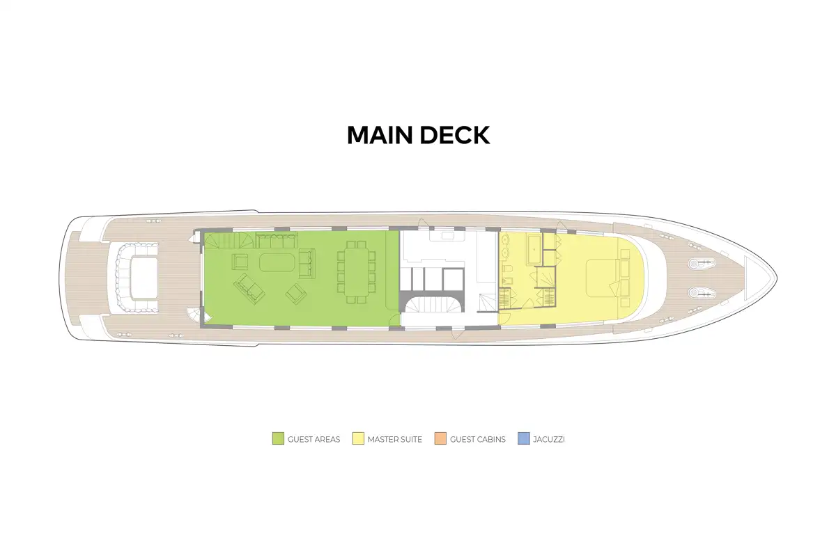 ATLAS can accommodate 10 guests in five cabins. The owner's suite is on the main deck, the guest accommodation is on the lower deck, aft of the midships engine room. Forward of the engine room, is the crew mess and accommodation. There are four guest suites made of one double VIP cabin, two double cabins and one twin-berth cabin. All guest suites have en suite facilities. On the main deck, the owner's suite is forward, it features a forward-facing king-sized berth with a large en suite bathroom with his and hers sinks. Aft of the owner's suite one finds the galley, day heads and entrance foyer. The Main saloon is aft if has a formal dining area, forward, with sofa seating aft. The upper deck has a forward wheelhouse with captain's cabin and sky lounge aft.