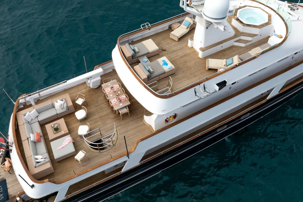 ATLAS’s sun deck has a raised jacuzzi forward of the radar and communications mast, there is seating outboard with more in an L-shaped beach seating configuration to port. To starboard is a sunpad. The upper deck has walkaround side decks with a boat deck aft, when not storing tenders and PWC the area can be converted to an al fresco lounge and sun lounger area. The main deck also has high-bulwarked walkaround side decks. There is forward-facing seating on the foredeck, while aft, is the cockpit with U-shaped seating around a large dining table that forms a shaded al fresco formal dining area.
