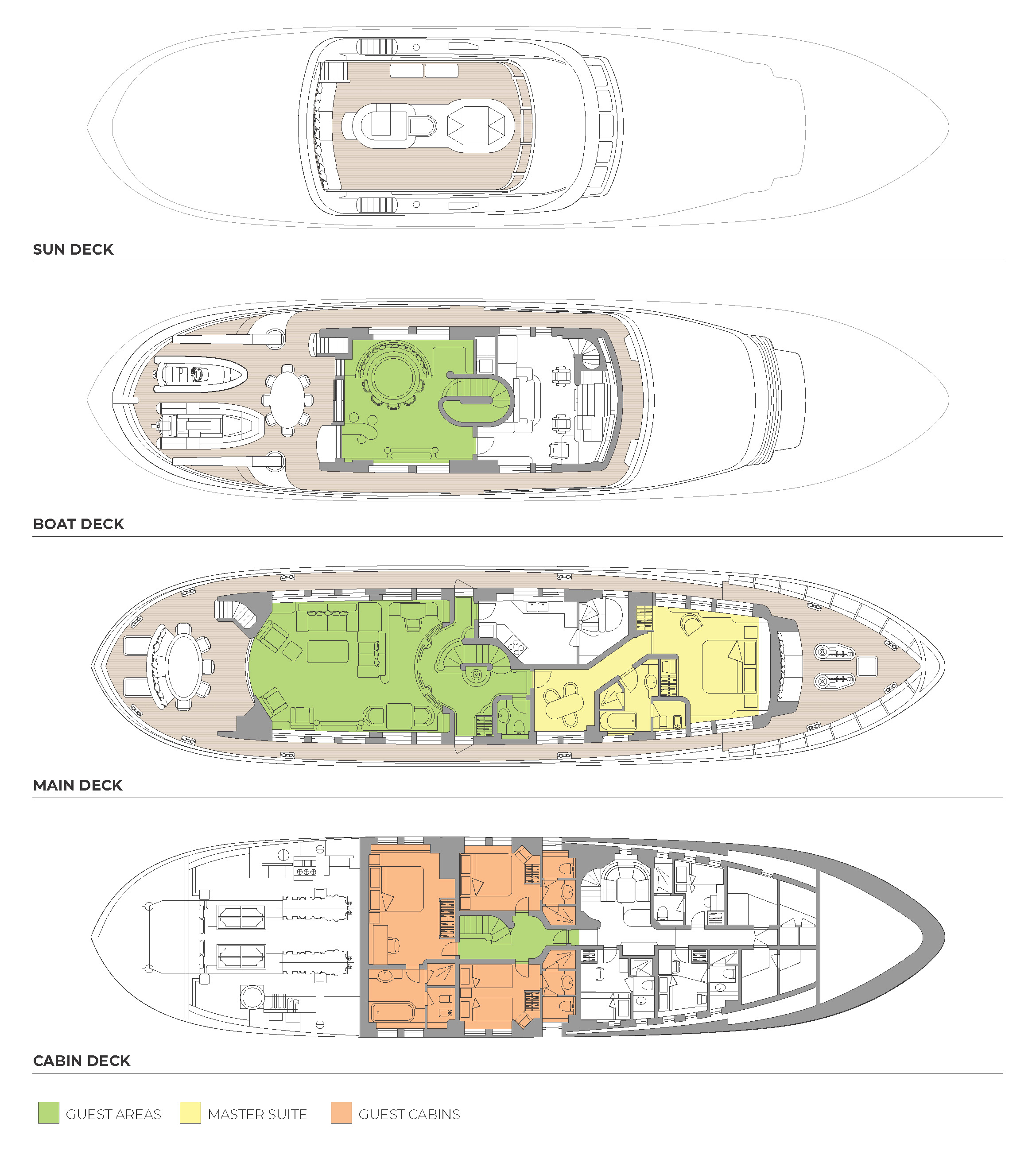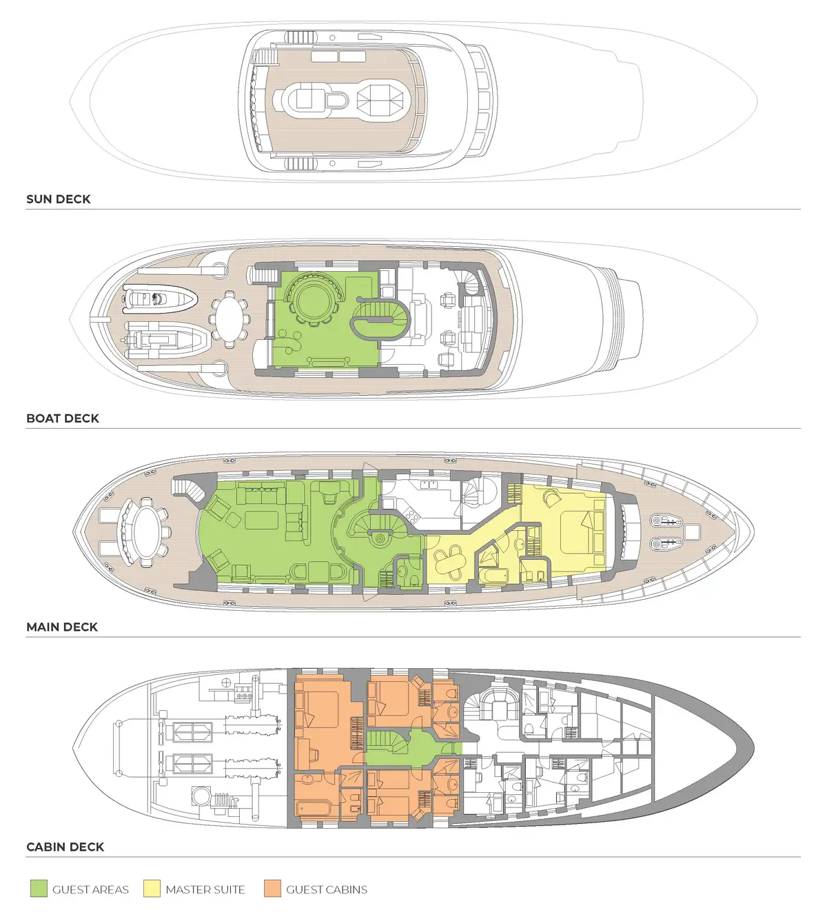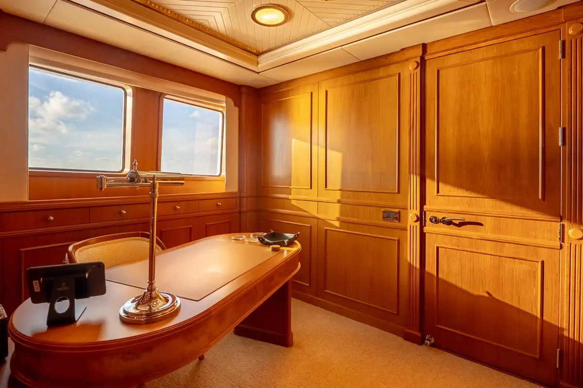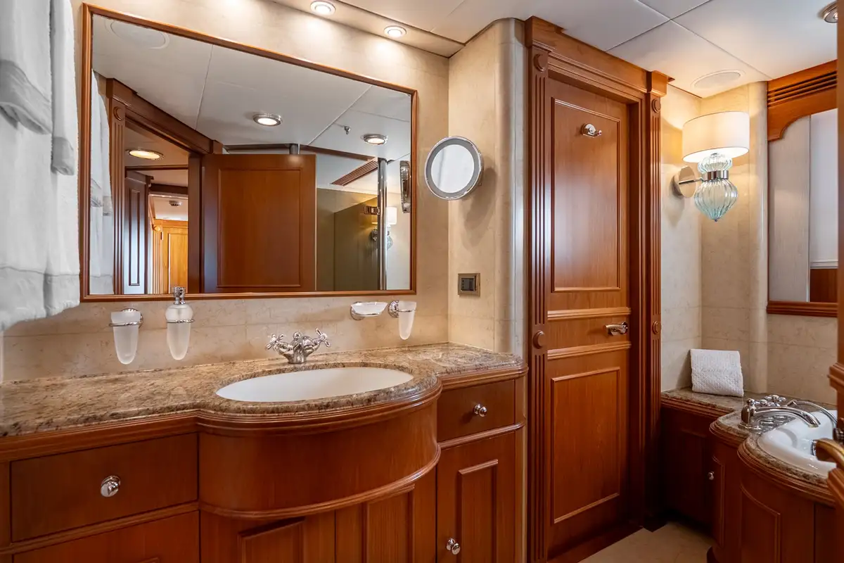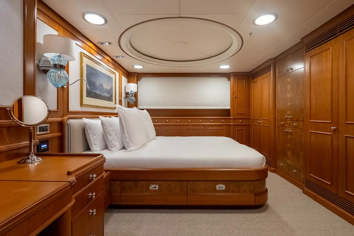 BEOWULF accommodates up to eight guests in four generously proportioned cabins, led by a full-beam owner’s suite that delivers exceptional comfort and privacy. This suite features a private office, abundant storage, and a spacious en suite bathroom with a bath, separate shower, and marble finishes. A luxurious VIP cabin mirrors this high standard, while two further guest cabins – one double and one twin – each include en suite facilities, ample storage, and entertainment systems. The yacht’s intelligent layout ensures discreet separation between guest and crew circulation, preserving a calm on board atmosphere.