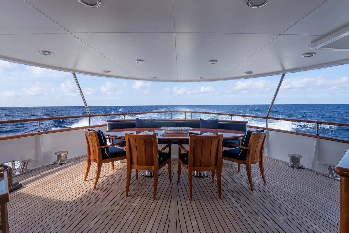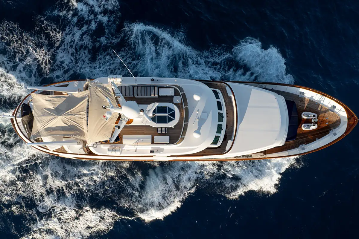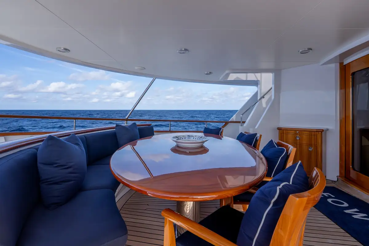 Crew accommodation is equally well considered, with three en suite cabins designed to provide comfort and privacy, supporting the high level of service expected aboard a yacht of this calibre. Externally, BEOWULF presents a timeless profile with classic lines, highlighted by an expansive aft cockpit that seamlessly connects the exterior living spaces with the interior. The upper deck is equipped with cranes for tenders and toys, shaded dining beneath a Bimini top, and carefully integrated safety and communication equipment.