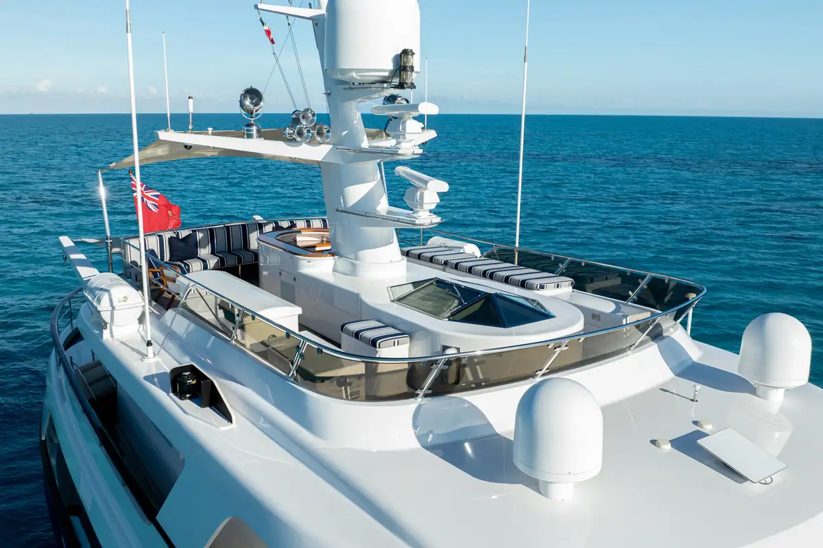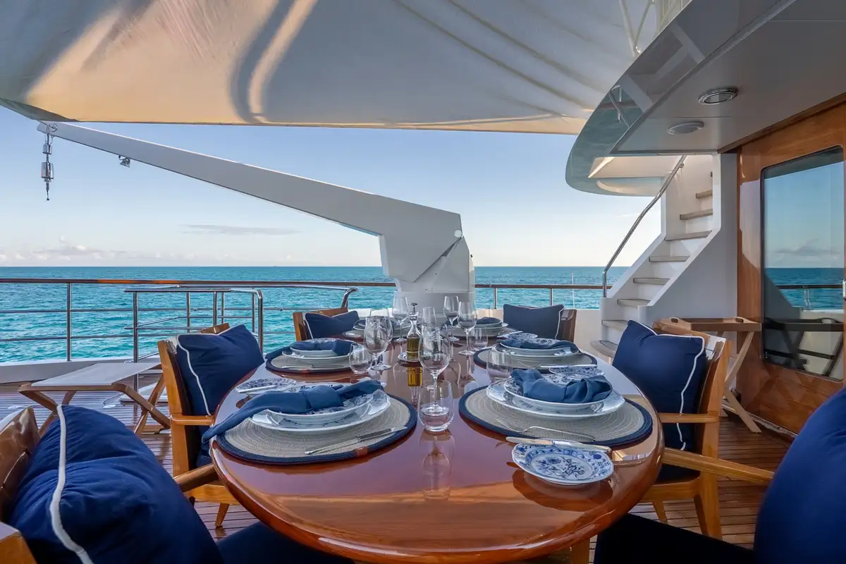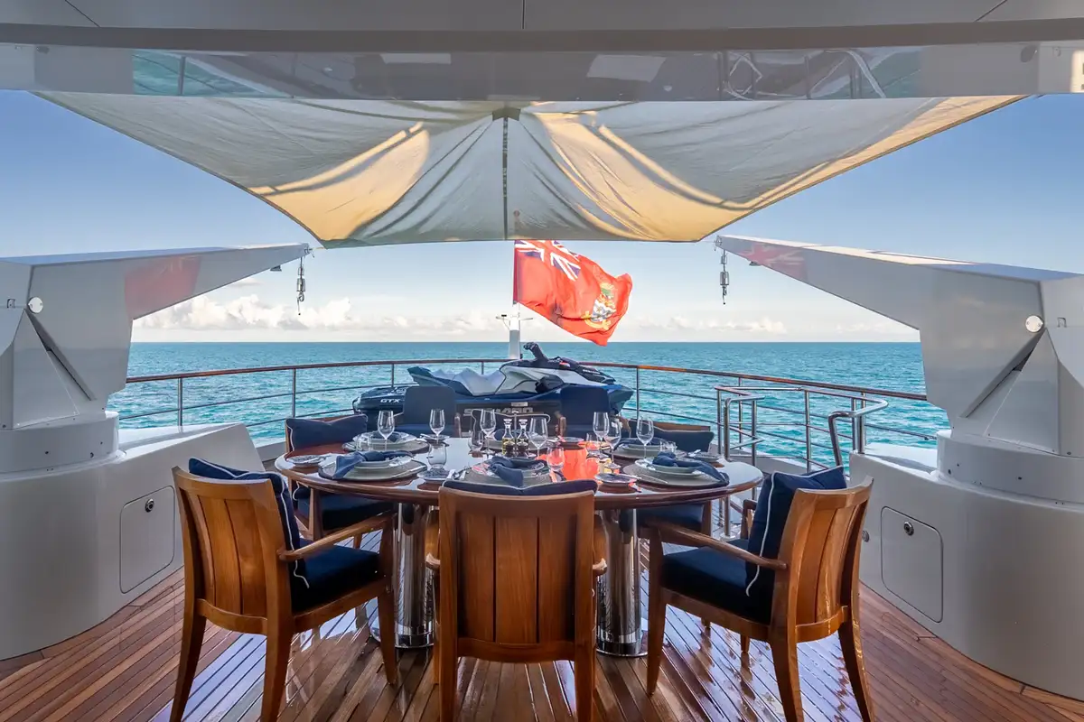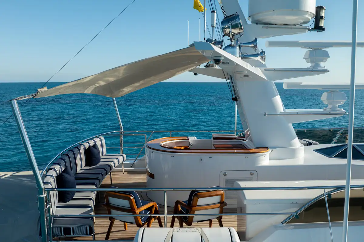 Crew accommodation is equally well considered, with three en suite cabins designed to provide comfort and privacy, supporting the high level of service expected aboard a yacht of this calibre. Externally, BEOWULF presents a timeless profile with classic lines, highlighted by an expansive aft cockpit that seamlessly connects the exterior living spaces with the interior. The upper deck is equipped with cranes for tenders and toys, shaded dining beneath a Bimini top, and carefully integrated safety and communication equipment.