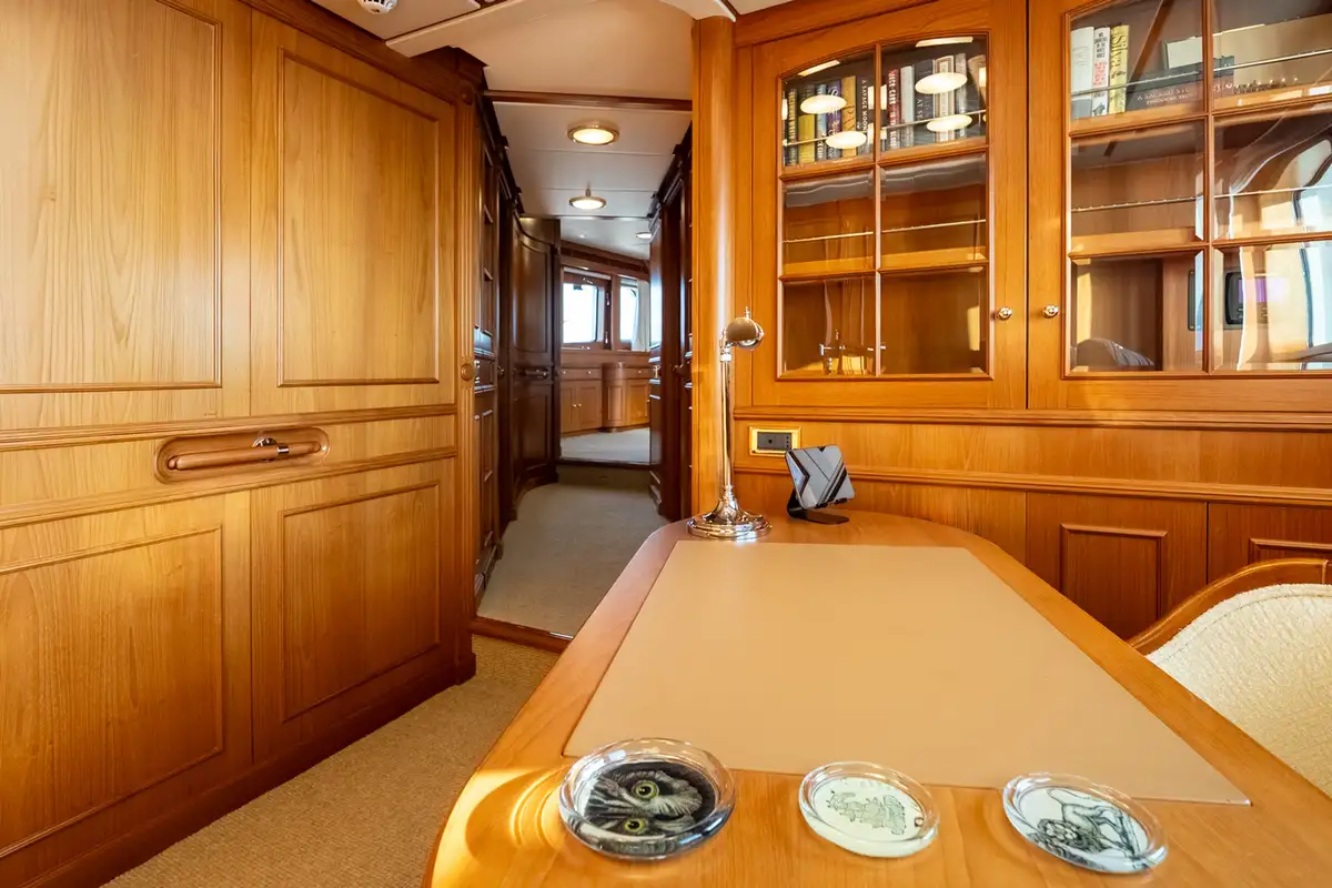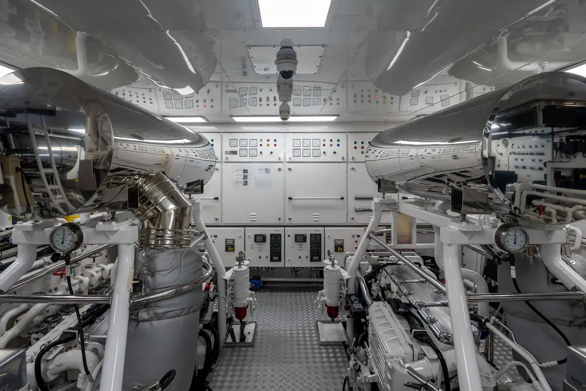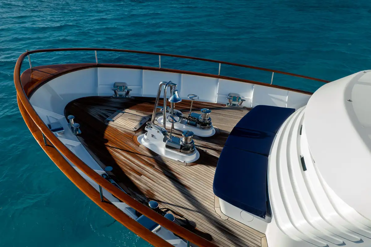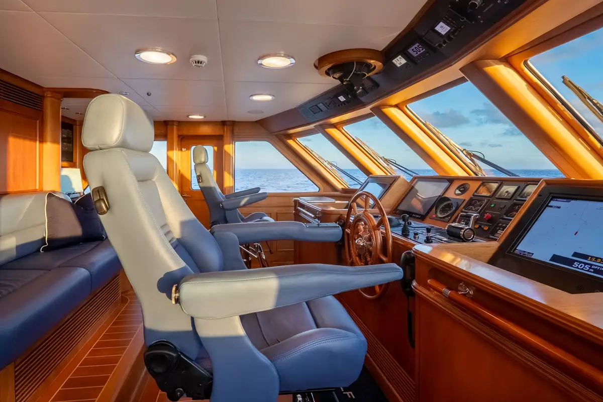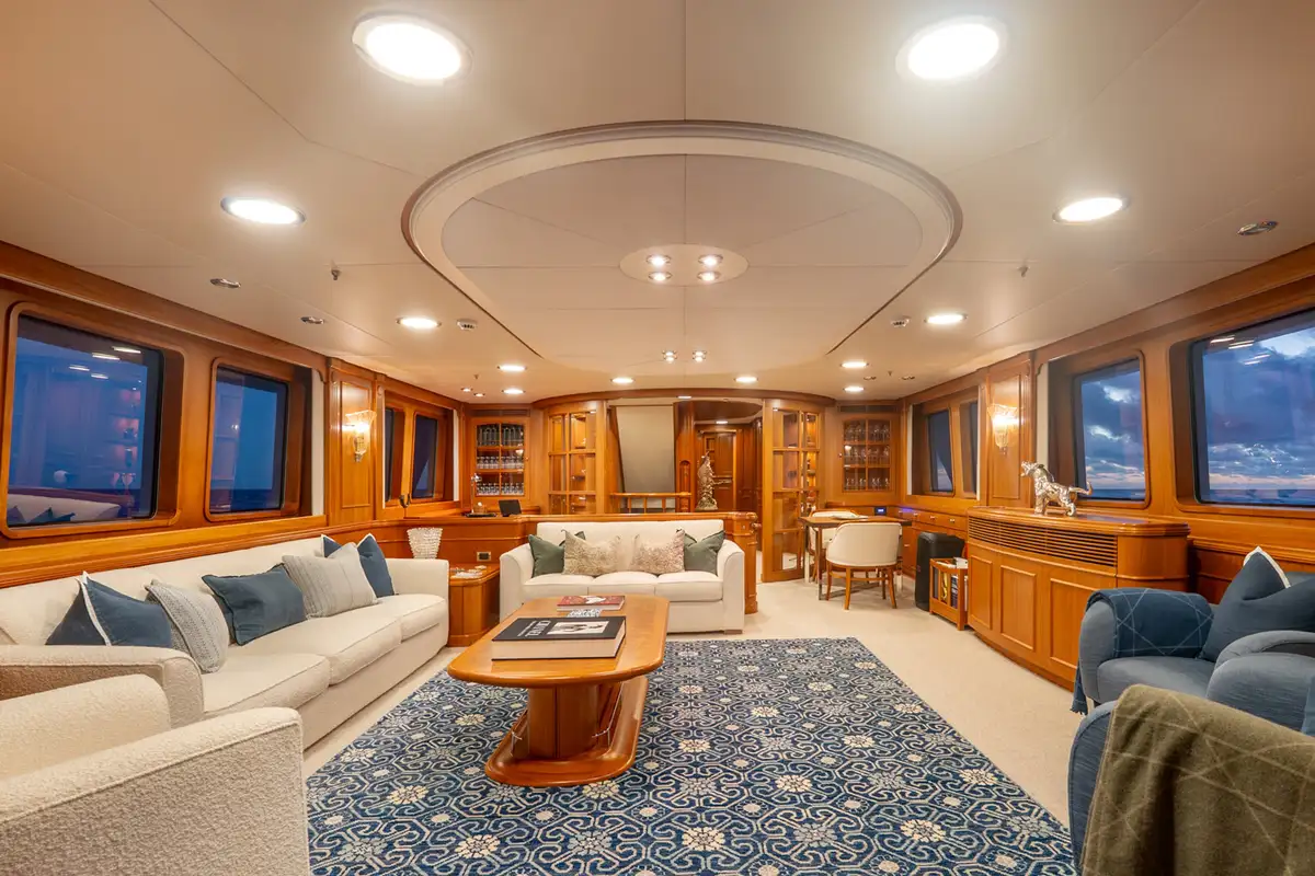 The sun deck serves as a serene retreat, offering both open sunbathing and sheltered relaxation beneath a glass atrium, while the bow provides a quiet seating area alongside practical anchor-handling equipment. Powered by twin Caterpillar 3406 engines producing 480hp each, BEOWULF cruises comfortably at 10 knots, prioritising smooth, efficient passage over speed. With a range exceeding 4,200nm, she is well suited for extended cruising, enabling long-distance exploration with confidence, comfort, and understated elegance.