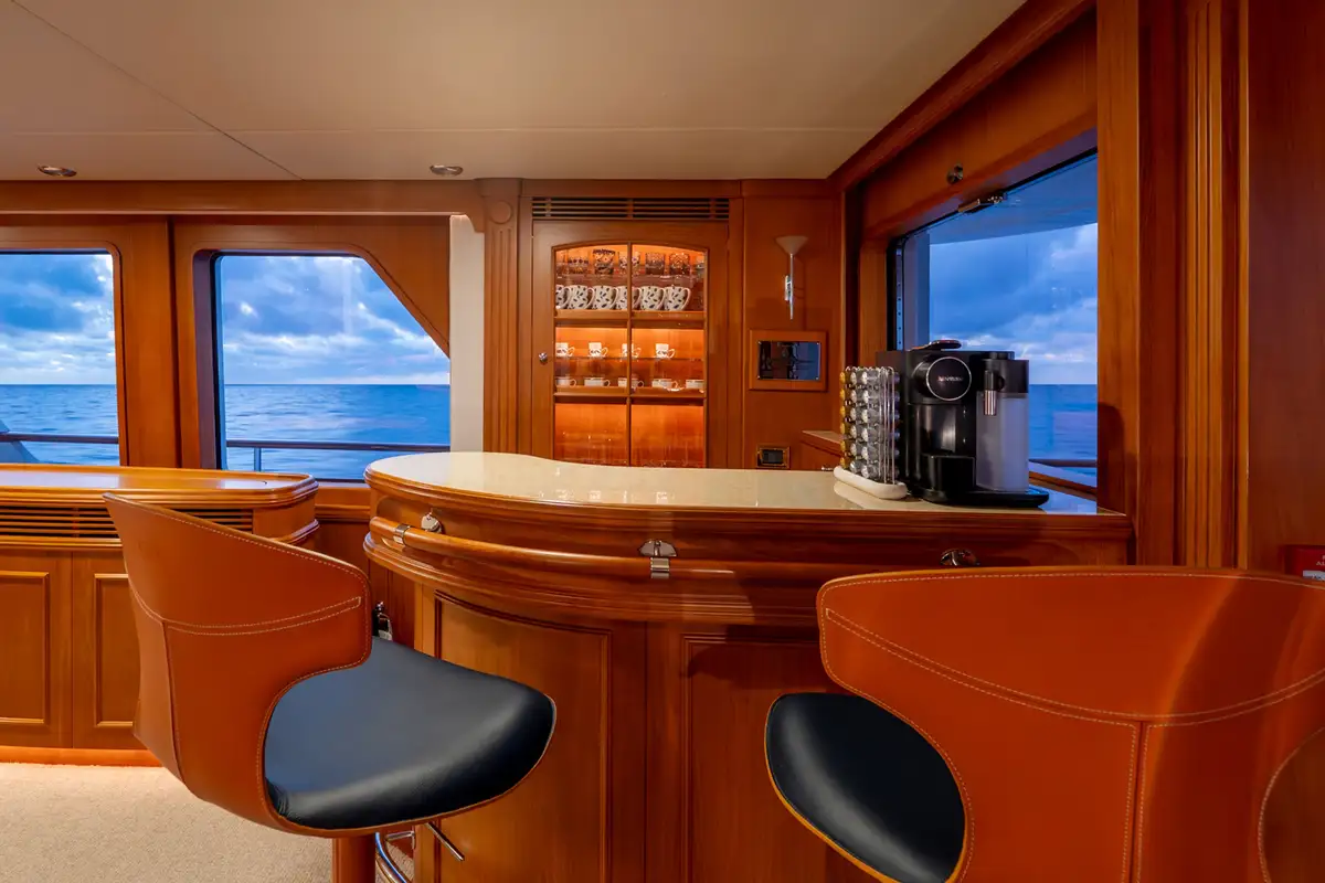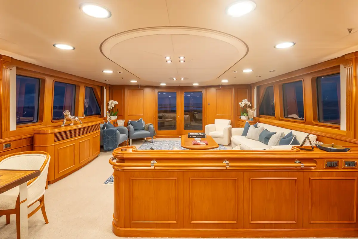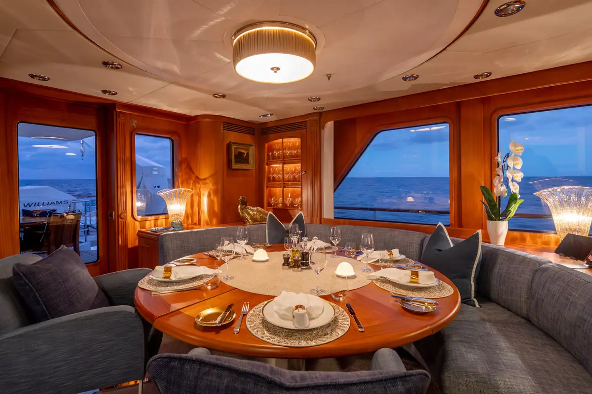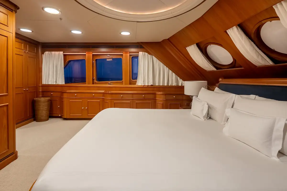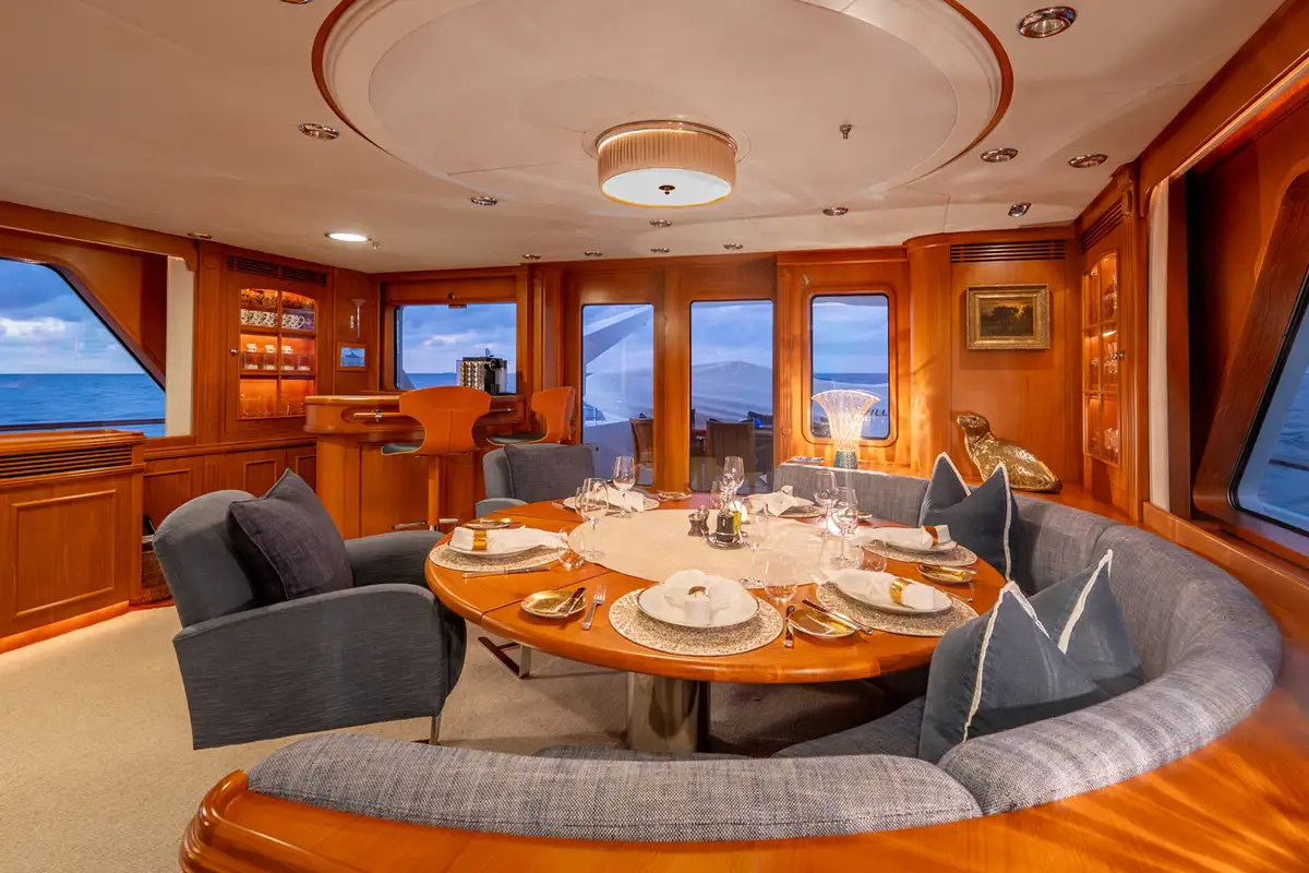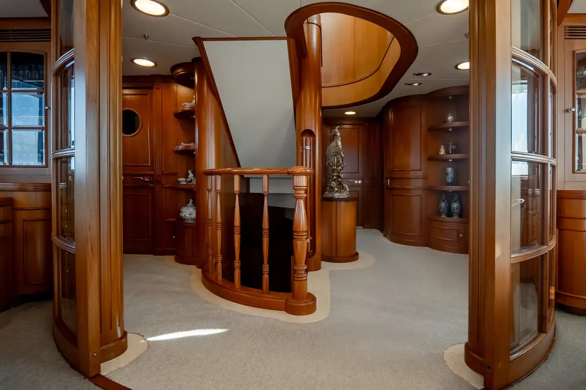 The sun deck serves as a serene retreat, offering both open sunbathing and sheltered relaxation beneath a glass atrium, while the bow provides a quiet seating area alongside practical anchor-handling equipment. Powered by twin Caterpillar 3406 engines producing 480hp each, BEOWULF cruises comfortably at 10 knots, prioritising smooth, efficient passage over speed. With a range exceeding 4,200nm, she is well suited for extended cruising, enabling long-distance exploration with confidence, comfort, and understated elegance.