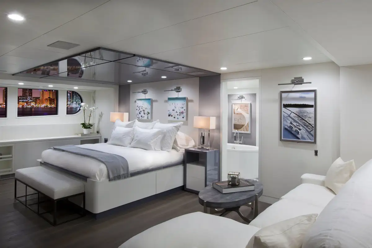 The “Hampton Beach House” interior can accommodate 12 guests is six spacious cabins including a full beam master cabin and VIP cabin on the main deck with four further guest cabins on the lower deck, all with full en suite bathrooms. The spacious main deck lounge has comfortable seating with sensational views and adjoins a dining area with a rosewood table and a wine cellar containing 120 bottles. A bright sky lounge can be found on the bridge deck with 180 degree windows and provides an additional lounge and entertaining area.