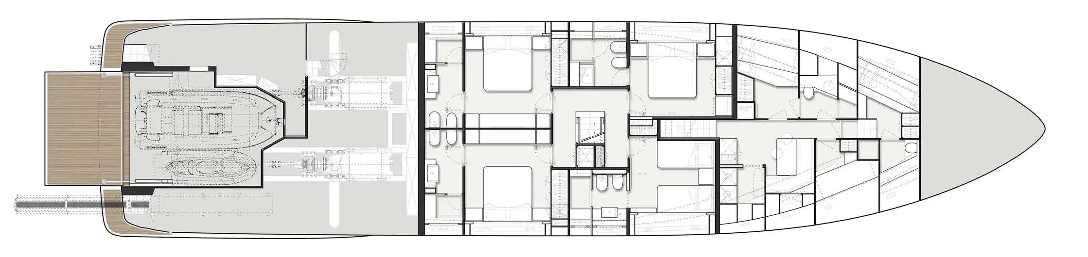 The full-beam owner’s suite is forward on the main deck. His-and-hers en suites share a single shower room as well as a walk-in wardrobe. On the lower deck, two double cabins and two twins complete the accommodation. There are also three crew cabins for up to five crew including the captain’s quarters on the upper deck.