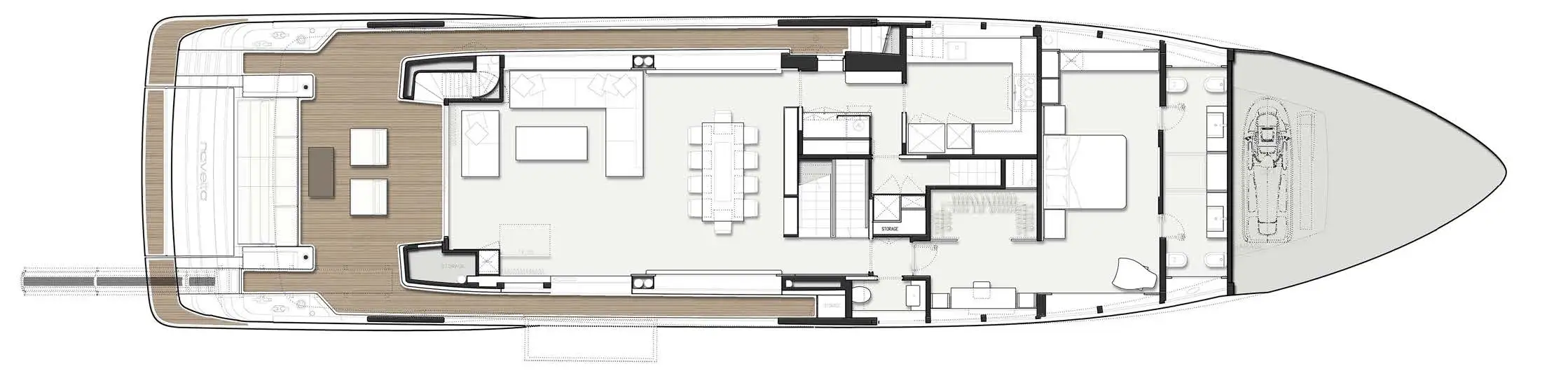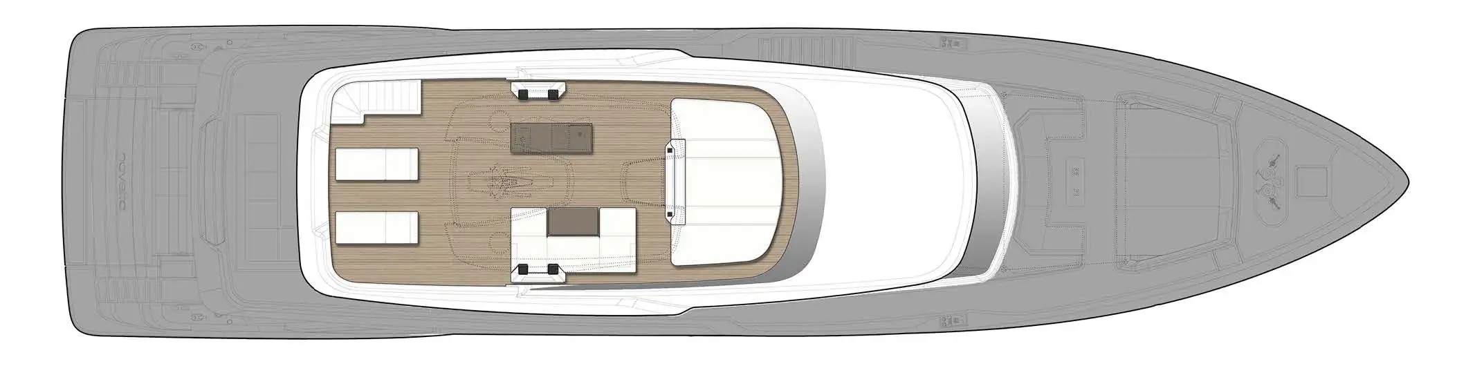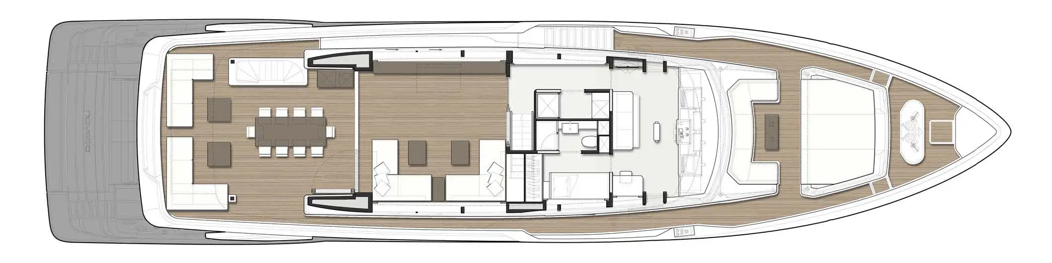 The upper deck aft has C-shaped sun lounge seating with open-air dining beneath the overhang. On the main deck aft is lounge seating and a covered dining area, while the port sidedeck leads to a substantial foredeck lounge area with an informal yet comfortable dining area and large sunpads.