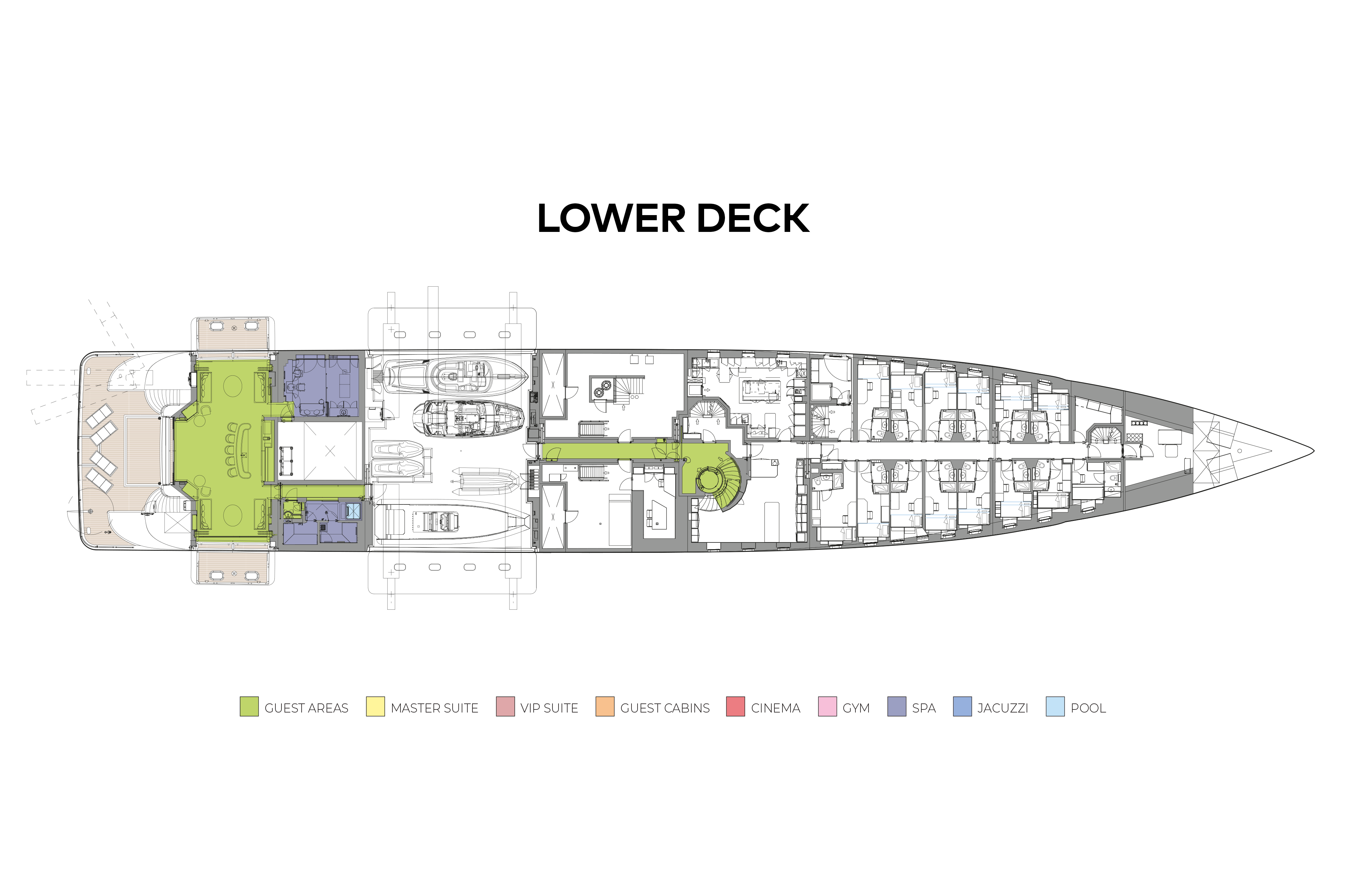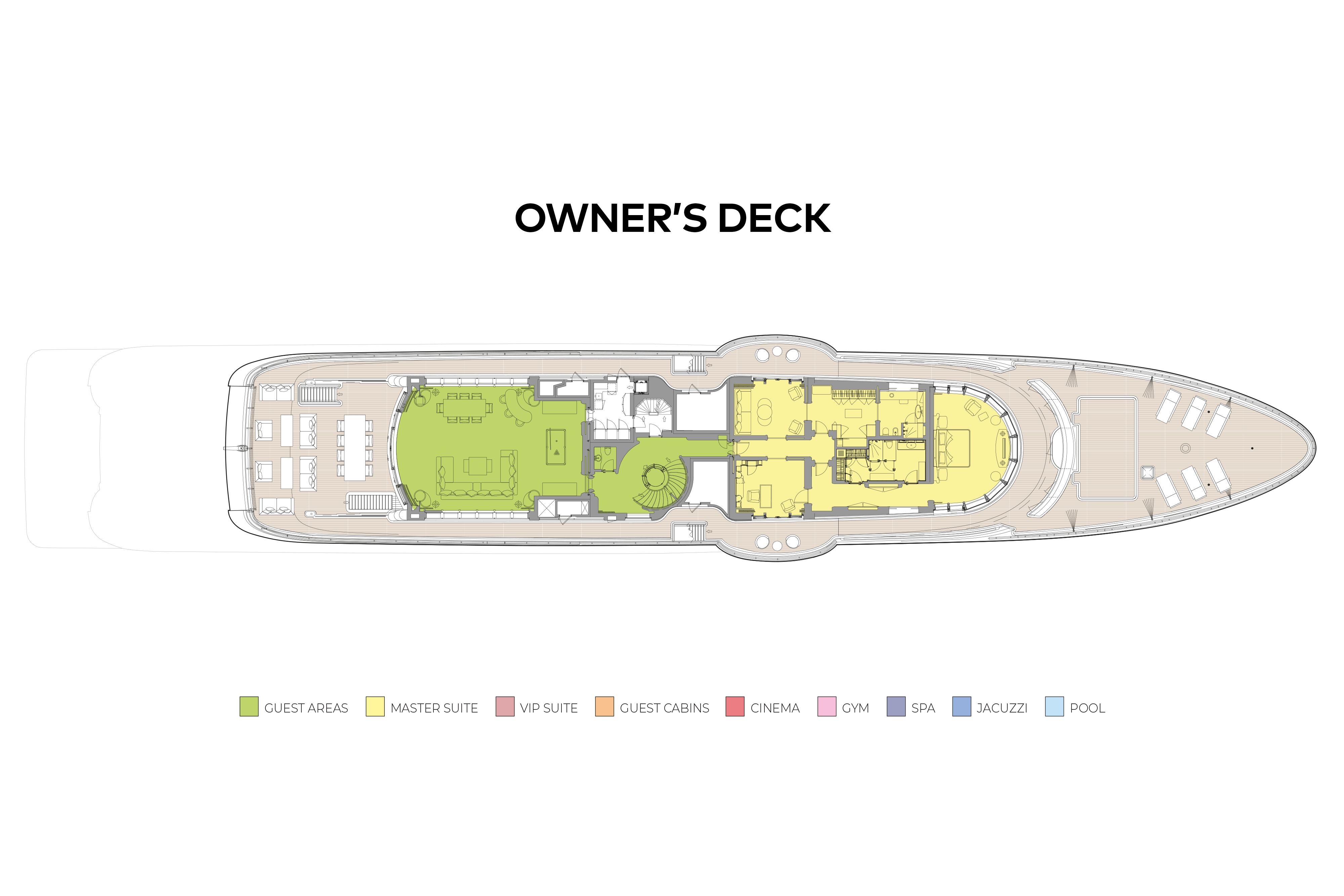Other features include a glass elevator serving lower to sun decks, and there is step-free access from the lower deck lobby to the beach club. A private owner’s deck has a bedroom forward with wraparound views and access to walkaround sidedecks and the foredeck. There are his-and-hers bathrooms and dressing rooms, and both the lounge and study have access to balconies. The saloon also has a bar and a dining room with access to the aft terrace.