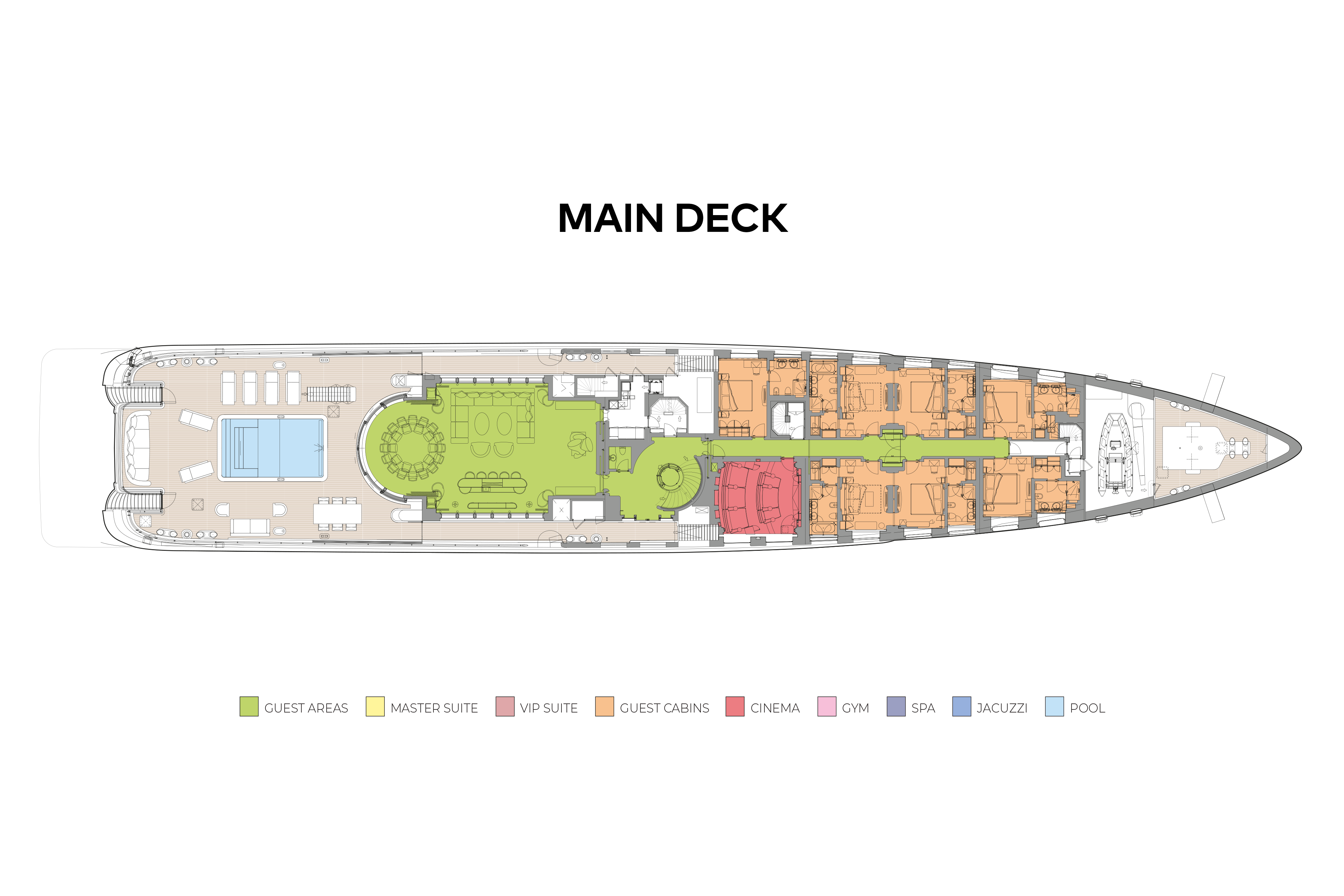 There are two new bridge deck VIP suites with 12m-long (39.4ft) balconies. She has a new 7x4m (23x13.1ft) counter-current pool on the main deck aft, flush with the deck to preserve the views, with the bulwarks lowered and handrails added for the same reason. The sun deck was extended aft to create a helipad for a Bell 429 or H145, and she also has a foredeck touch-and-go helipad.