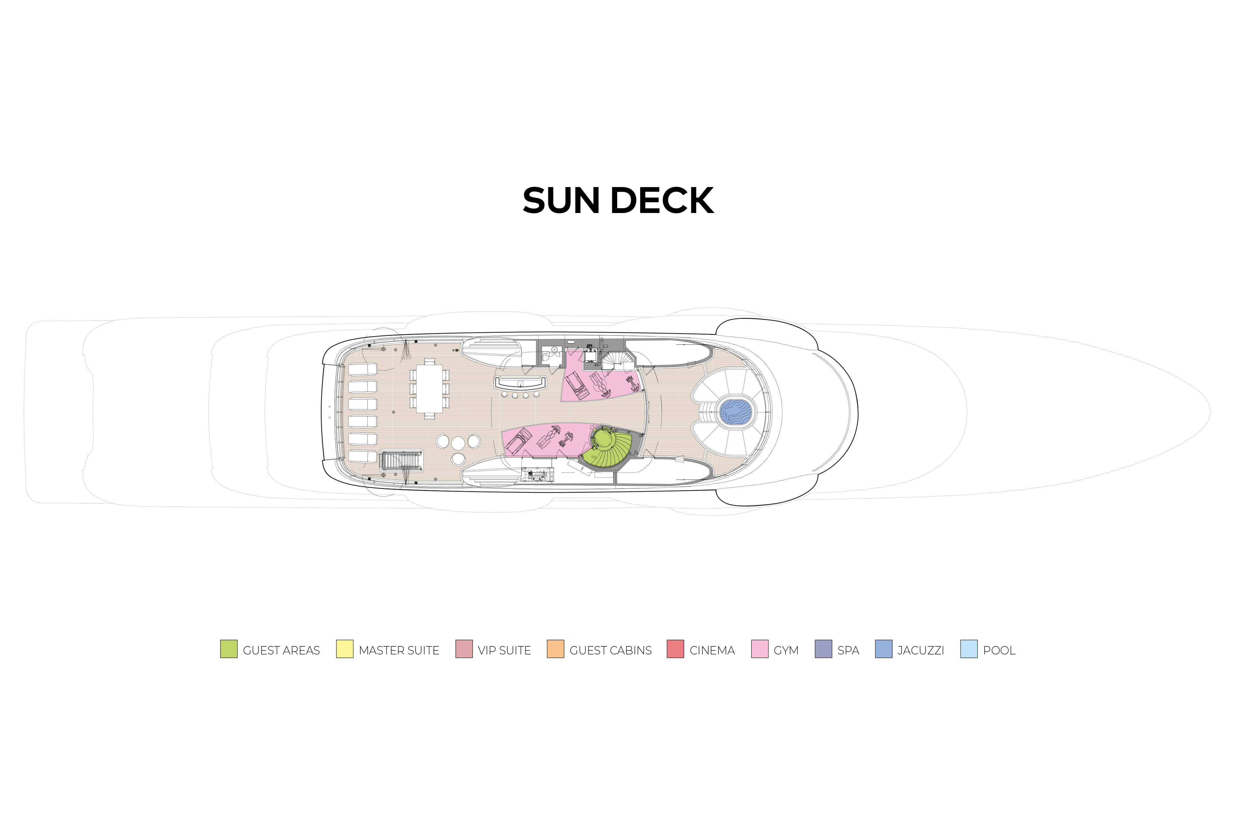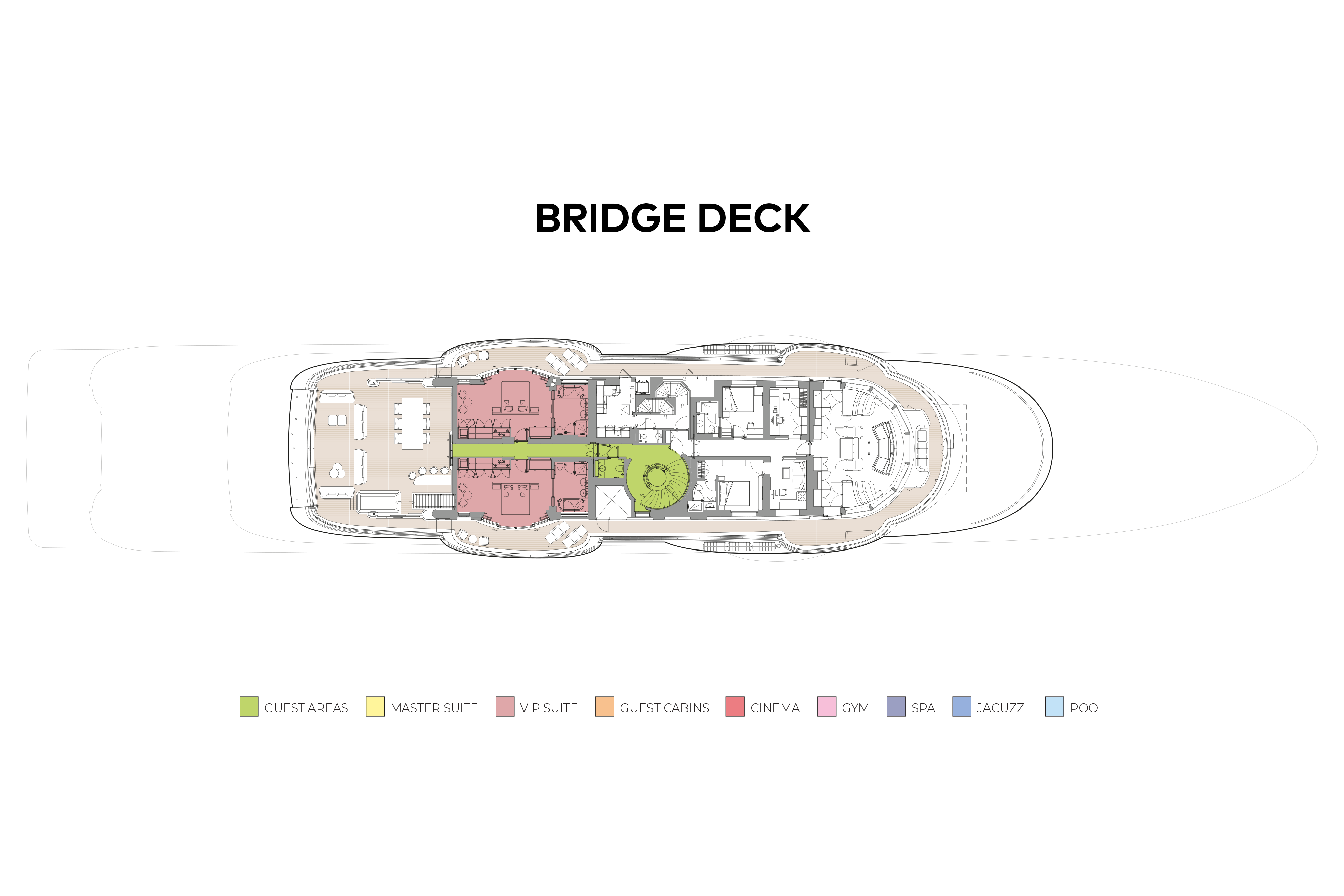 Up on the sun deck there is a raised jacuzzi flanked by sunpads and beneath the hardtop there is a sit-up wet bar, dayhead and a good selection of gym equipment. The main deck is home to the yacht’s dedicated cinema and seven of the yacht’s guest suites, four of which can combine to create two VIP sites. All of the aft deck spaces on main to bridge decks have glass windbreak panels for guest comfort.