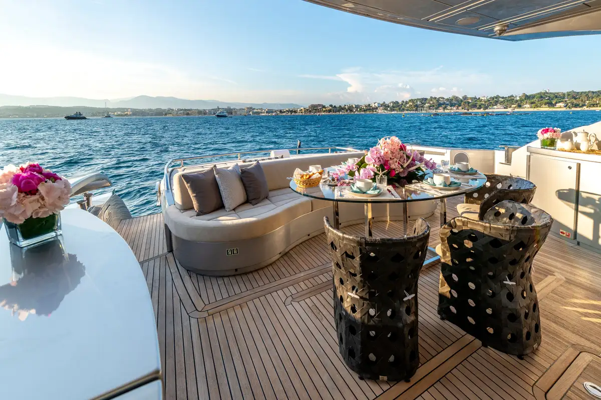 LEVANTINE II has walk-around side decks that lead forward to a lounge area with banquette seating, offering privacy in ports and another exterior guest space. This seating area has an awning for shade and there is a large raised sunpad here as well.