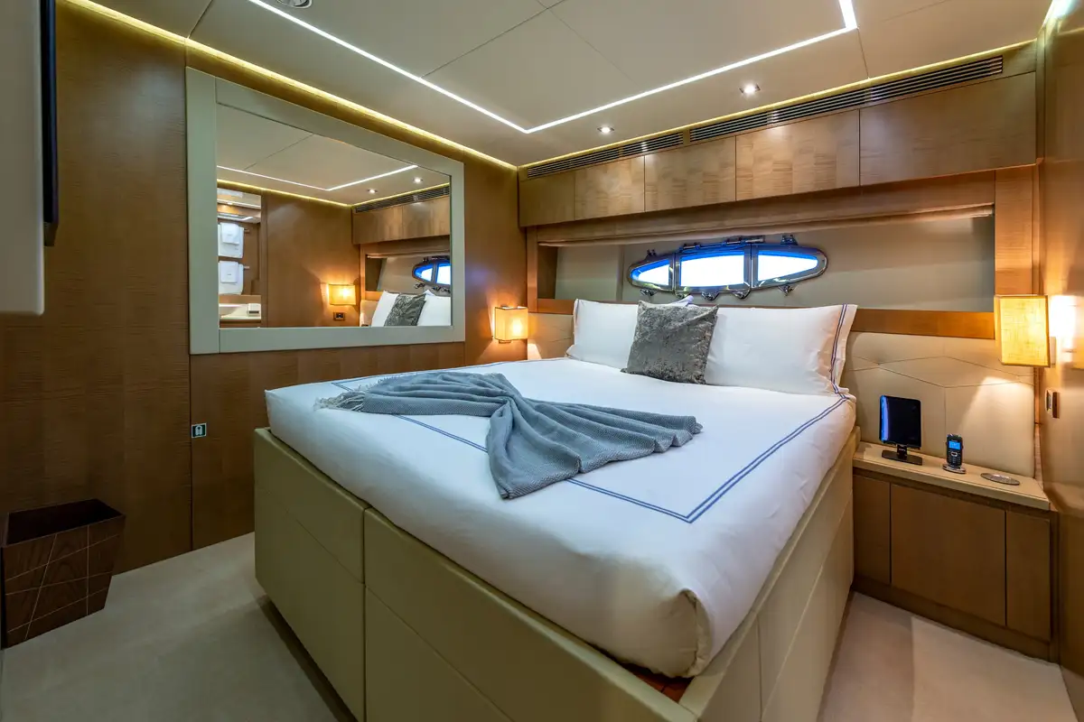 This yacht can accommodate eight guests in four cabins on the lower deck. Access via a staircase from the main deck lounge. On the right is the entrance to the spacious owner's suite, which is made up of an office area, full-beam cabin with a forward-facing bed and large en suite bathroom.