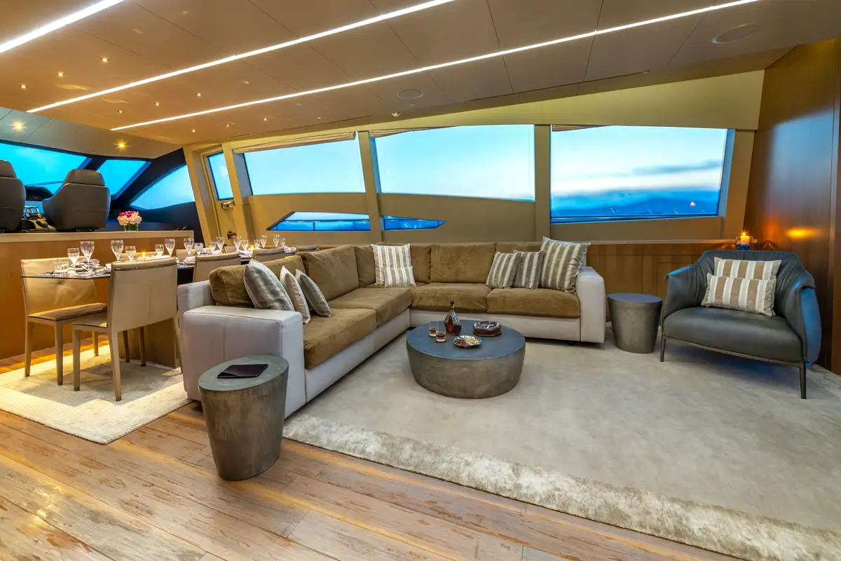 On the main deck below is an al fresco dining area that leads into a lounge-dining space inside that can also open aft with sliding doors. Her interior is as elegant as her exterior, with luxury finishes and clean lines. There is another large sunpad to the rear, above the swim platform, perfect for admiring scenery while cruising.