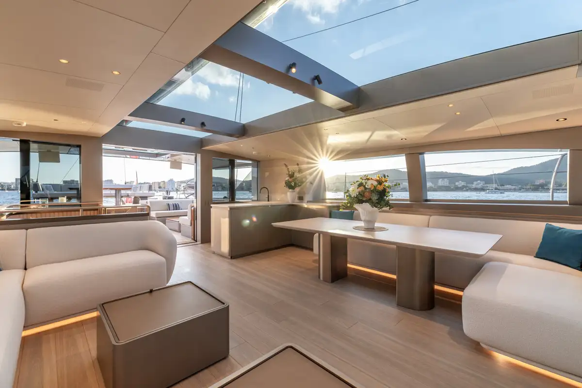 On the main deck, the lounge has comfortable U-shaped seating opposite a formal dining table to port. Blending inside and out, expansive glass doors aft open out to the recessed aft cockpit. Furnished with the best of everything, a warm colour palette perfectly pairs with modern furnishings.