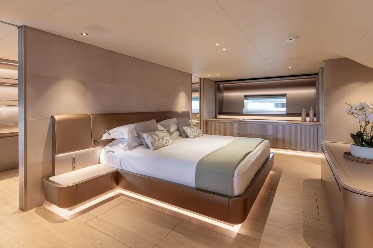 MAGIC hosts 10 guests across five cabins, with a spacious full beam owner’s suite located in the stern complete with an en suite bathroom, his-and-hers walk-in wardrobes, and an office. Two additional guest cabins are situated aft of the engine room, with one guest and one children’s bunk cabin positioned forward of the engine room.