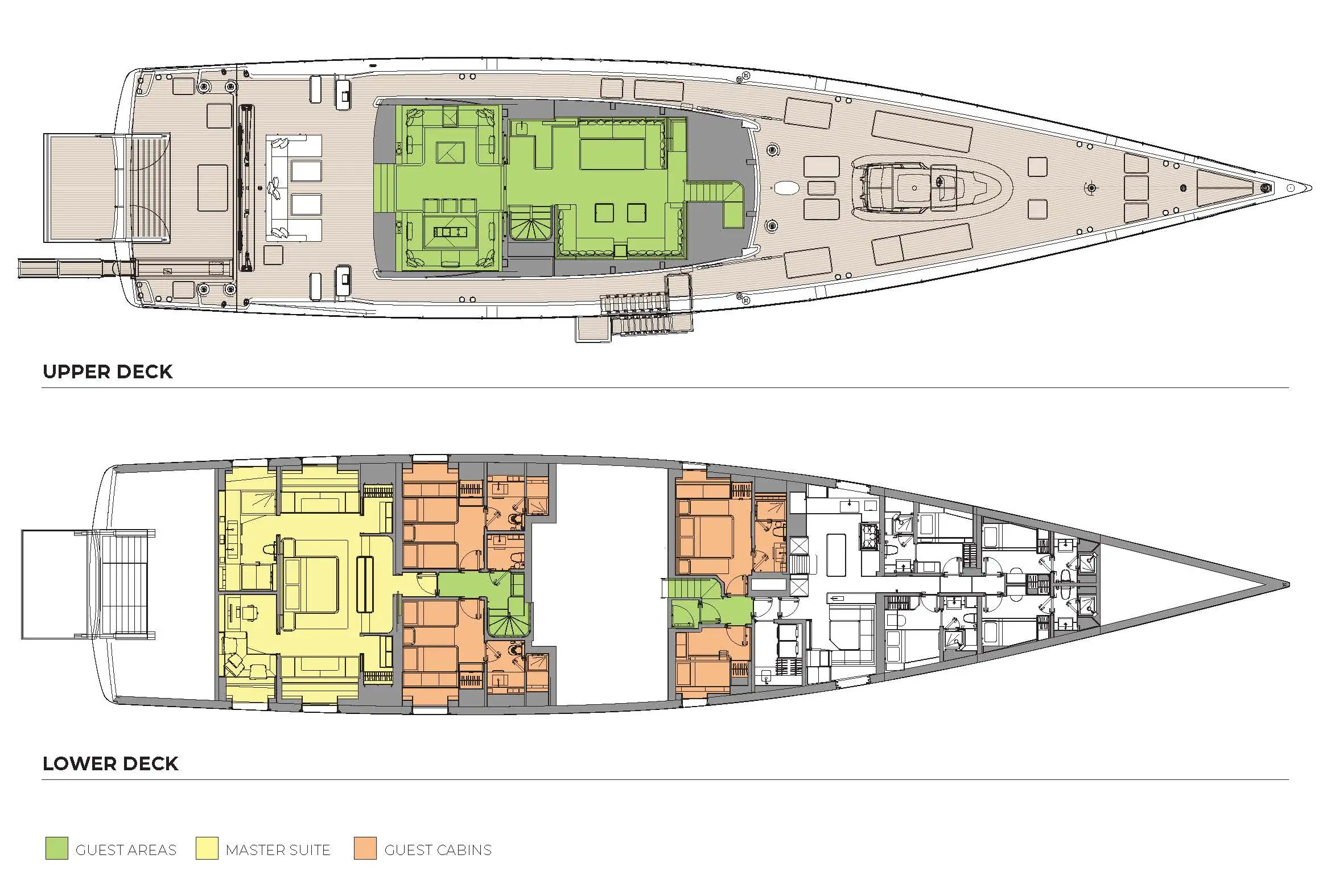 - Five cabins with spacious owner’s suite located in the stern