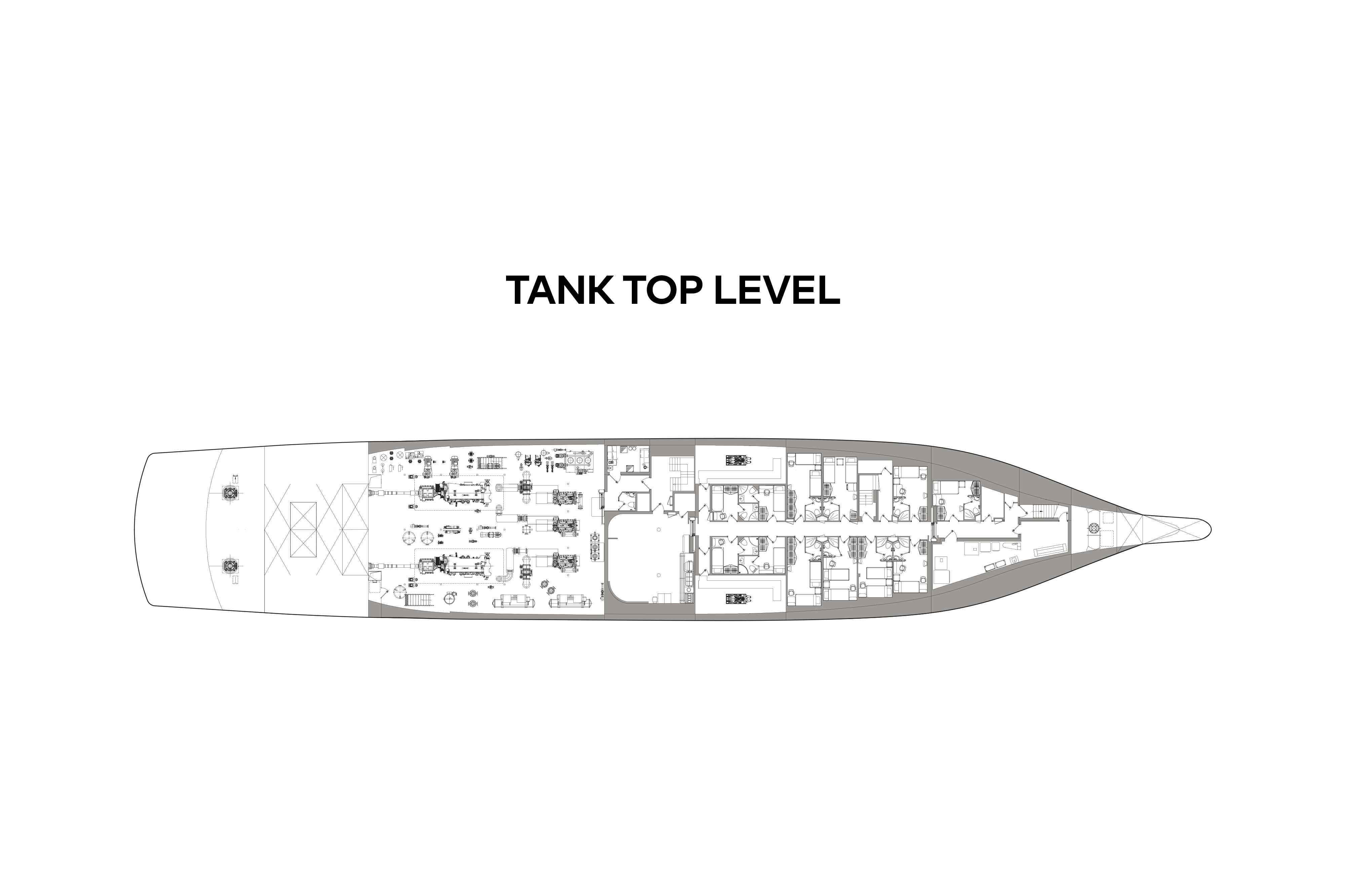 The owner’s suite is forward on the upper deck and features panoramic views forward, over the owner’s private raised jacuzzi nestling amid sunpads, his-and-hers en suites and walk-in wardrobes, and an owner’s office. Adjacent is a twin cabin for the owner’s guests, children or staff. The upper deck is also home to two double suites and two twin suites.