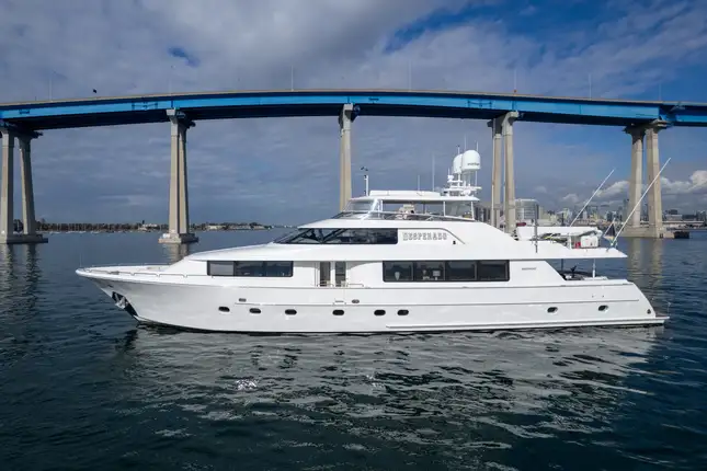 Twin 1,400hp Caterpillar C32 diesel engines give her a top speed of 22 knots and a range of 3,500nm at her passage speed of 10 knots. Humphree fins and interceptors ensure guest comfort underway and at anchor and the sale includes a custom 28ft Munson Packcat landing craft tender, 5.5m Zodiac RIB, Hobie cat, electric bicycles, scuba diving equipment, two SeaDoos and more.