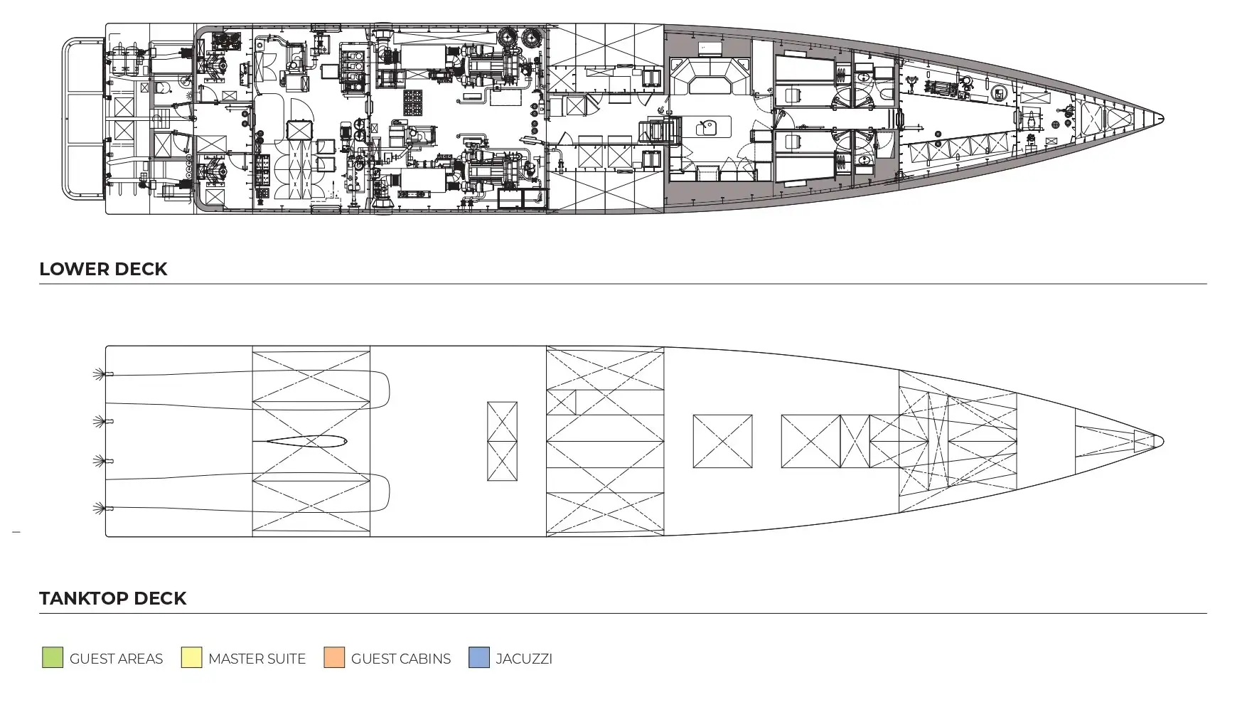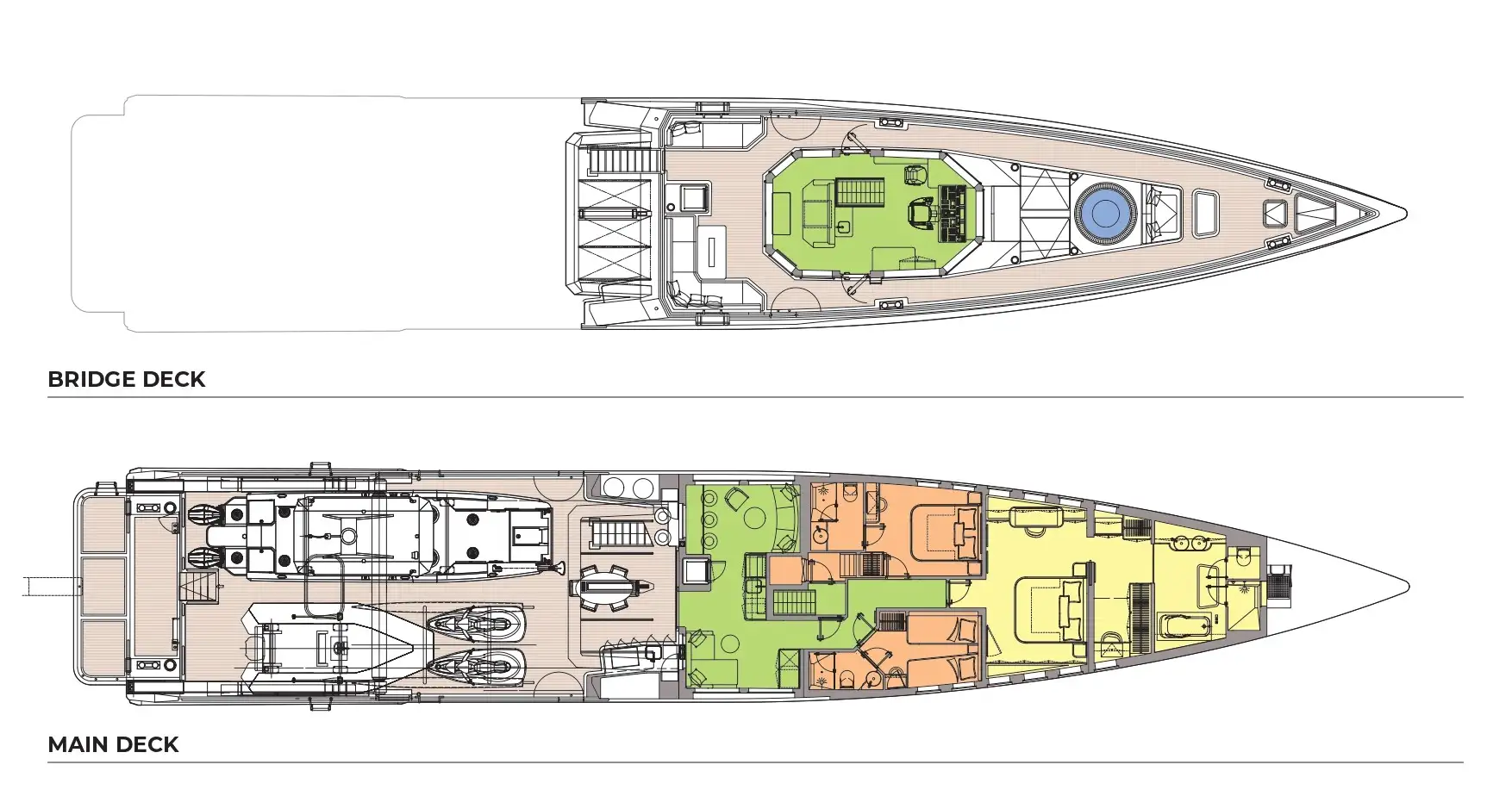 NO DESTINATION delivers incredible views from her foredeck sun lounge with jacuzzi and on the bridge deck aft there is a lounge that doubles as an open-air dining area. On the main deck aft there is a second al fresco dining option with BBQ shaded by the overhang, overlooking the tender and toy storage. When the tenders are in the water, this versatile space can be used in a variety of ways depending on the owner’s desires.