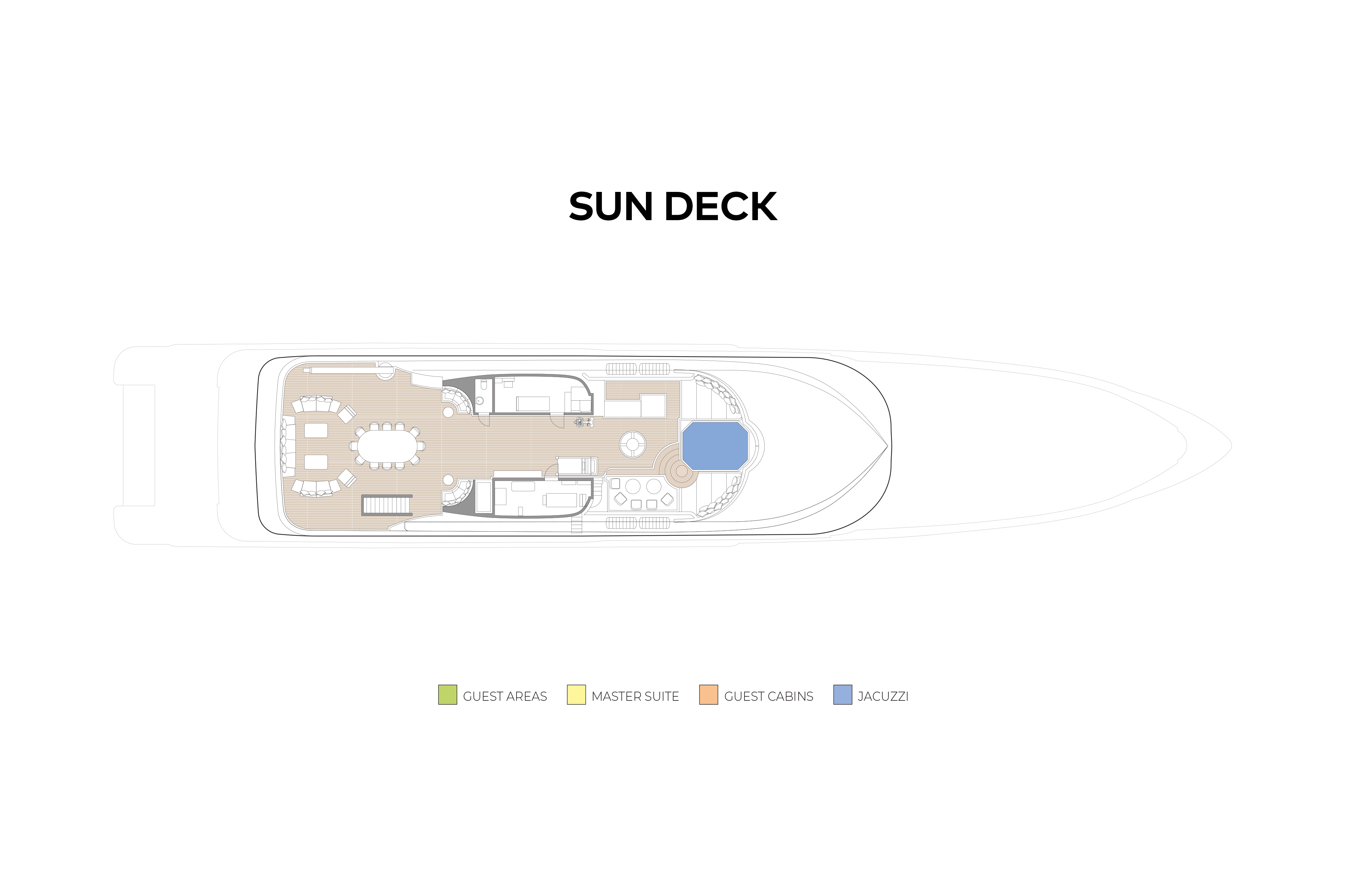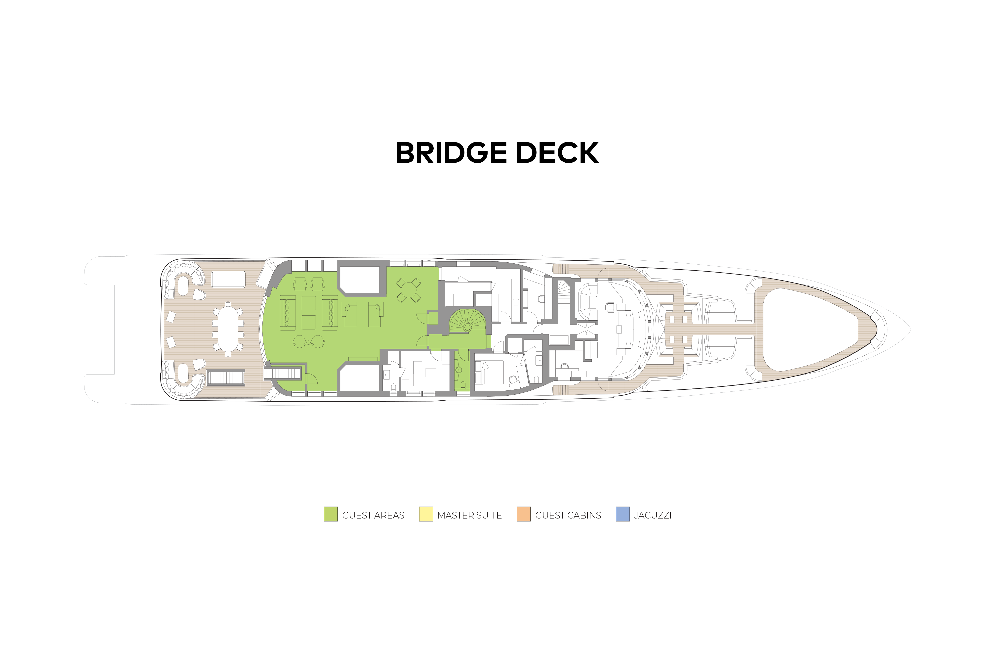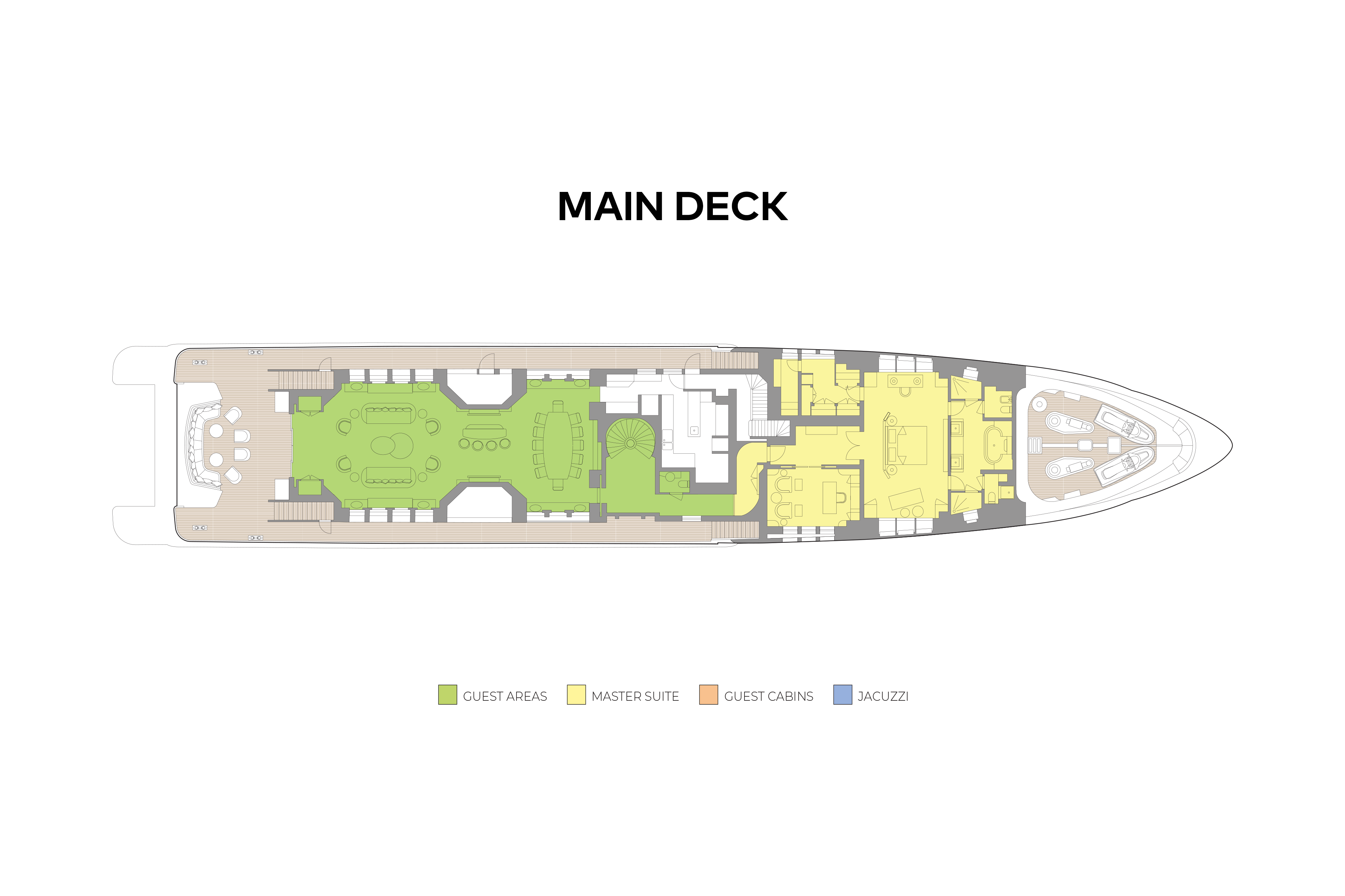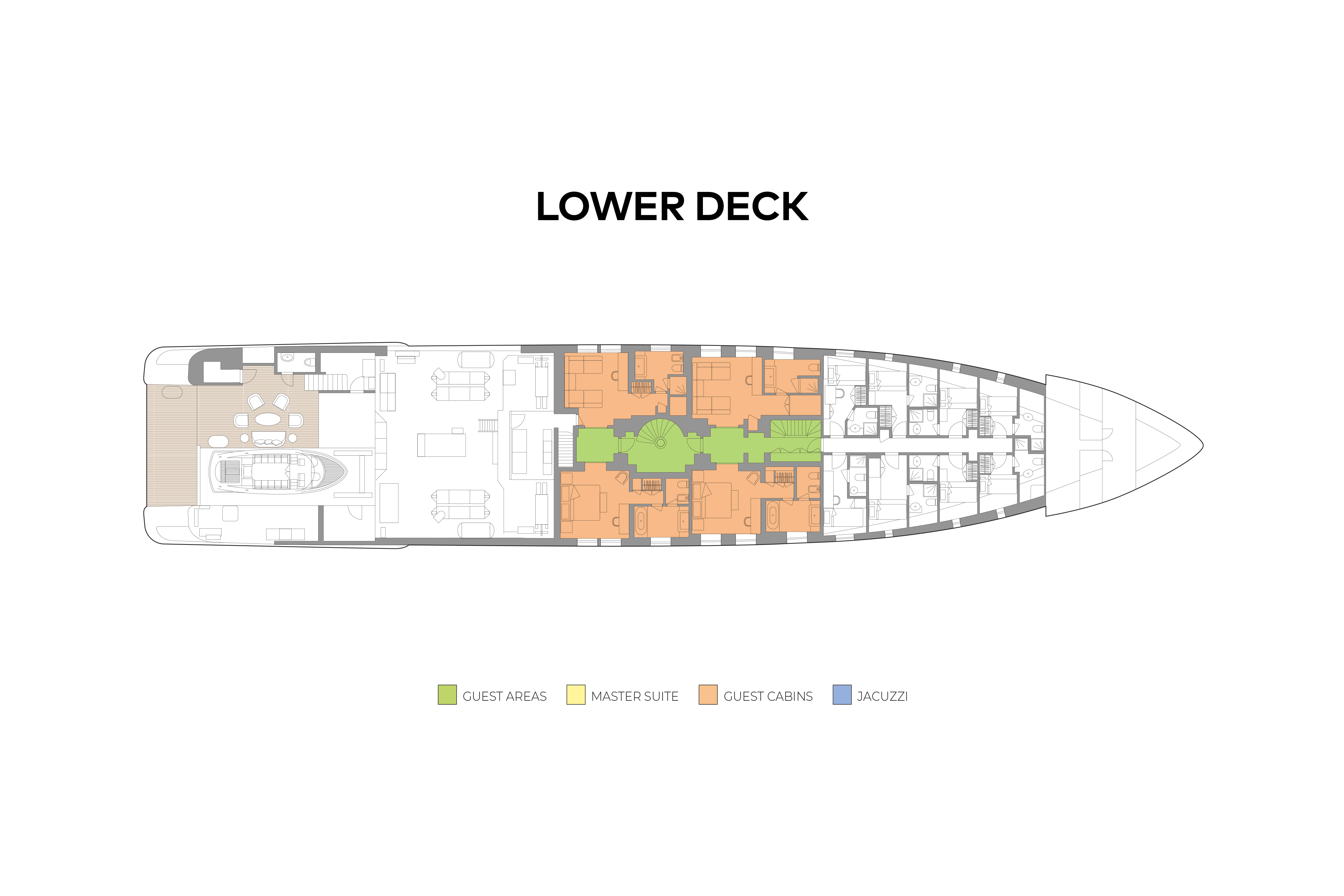 SCOTT FREE can accommodate 12 guests in six well-appointed cabins. Her interior is a bold mix of contemporary design and comfort, featuring striking textures, vibrant accents, and a curated collection of unique artefacts. The main saloon features a neutral cream palette with citrus green highlights, a full-size cocktail bar, and a flowing layout that leads to a glass-topped dining table for 12. The expansive sky lounge encourages relaxation with its open plan, whimsical lighting, advanced AV systems, and another full-size bar—perfect for casual gatherings or movie nights. Her Art Deco-inspired master suite, located on the main deck, includes a private study, walk-in wardrobe, and a central spa bath with separate his-and-hers showers. Four guest cabins on the lower deck (two convertible into full-beam suites) and a multi-purpose bridge deck cabin offer versatile accommodation. A stunning silver spiral staircase connects the decks, serving as both a design statement and a functional centerpiece.