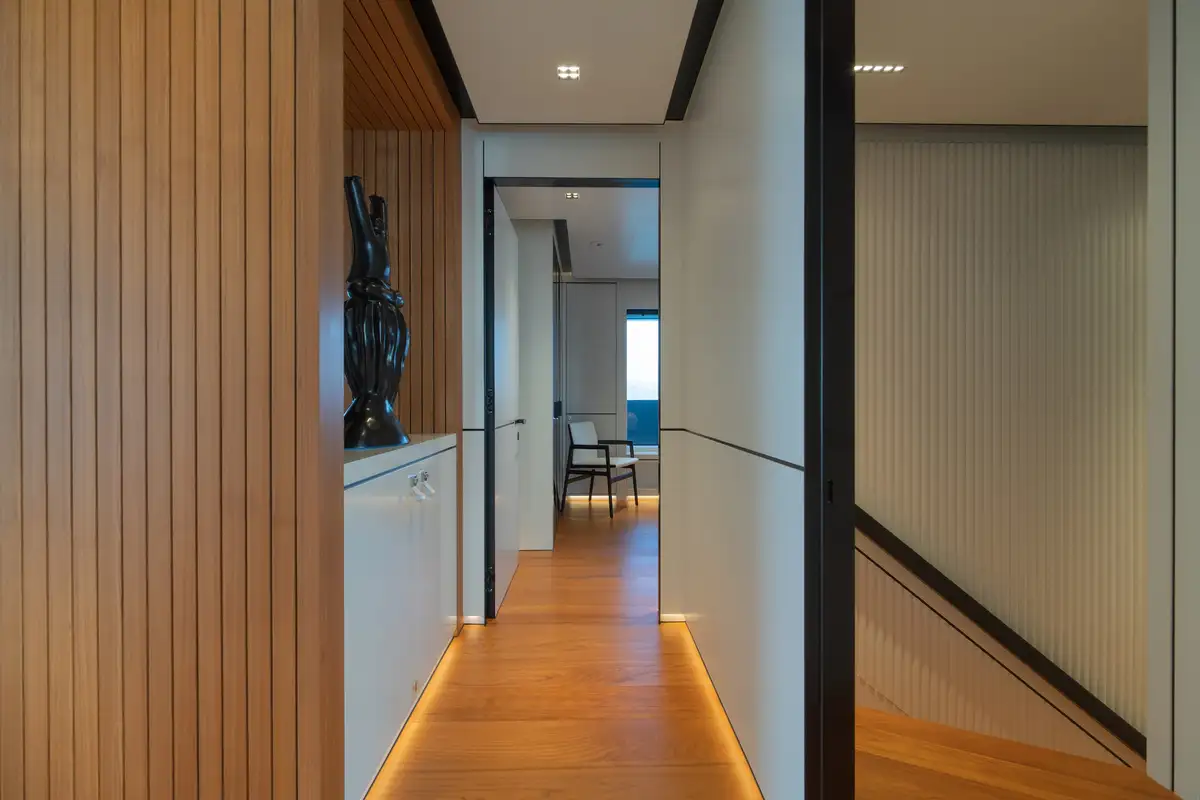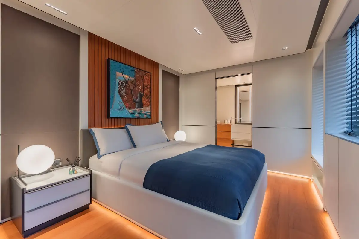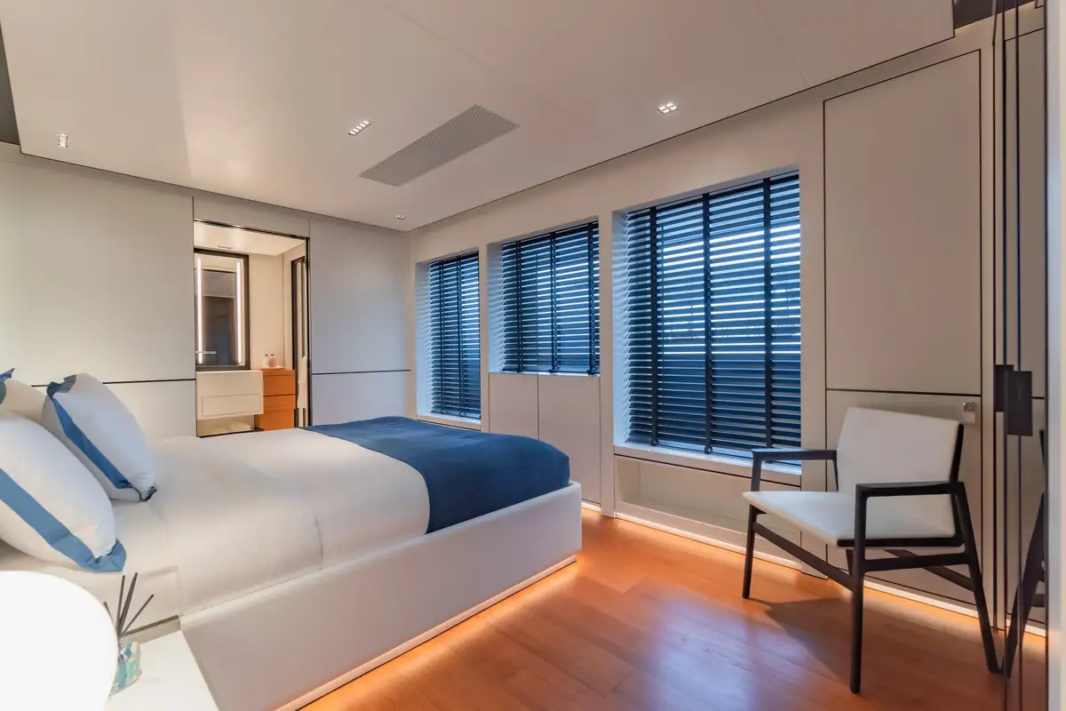 SPACECAT accommodates up to 8 guests across four cabins, with the main deck owner’s suite being the most impressive. Full beam, it boasts a seating area, desk, en suite, and direct access to a private foredeck terrace. There are two additional double cabins located on the upper deck and a twin aft of the master on the main deck.