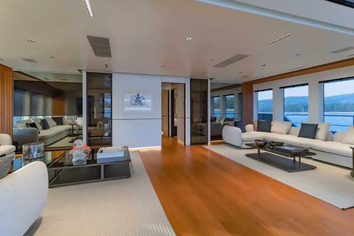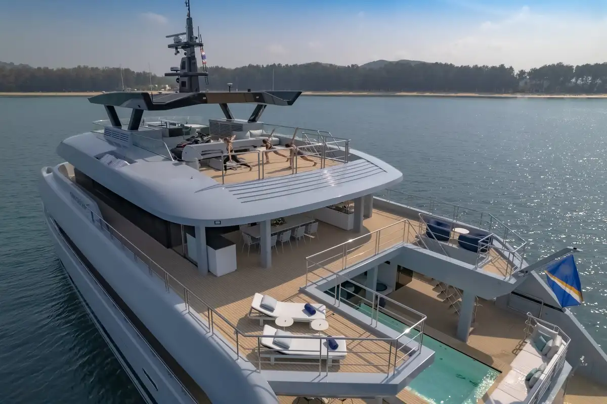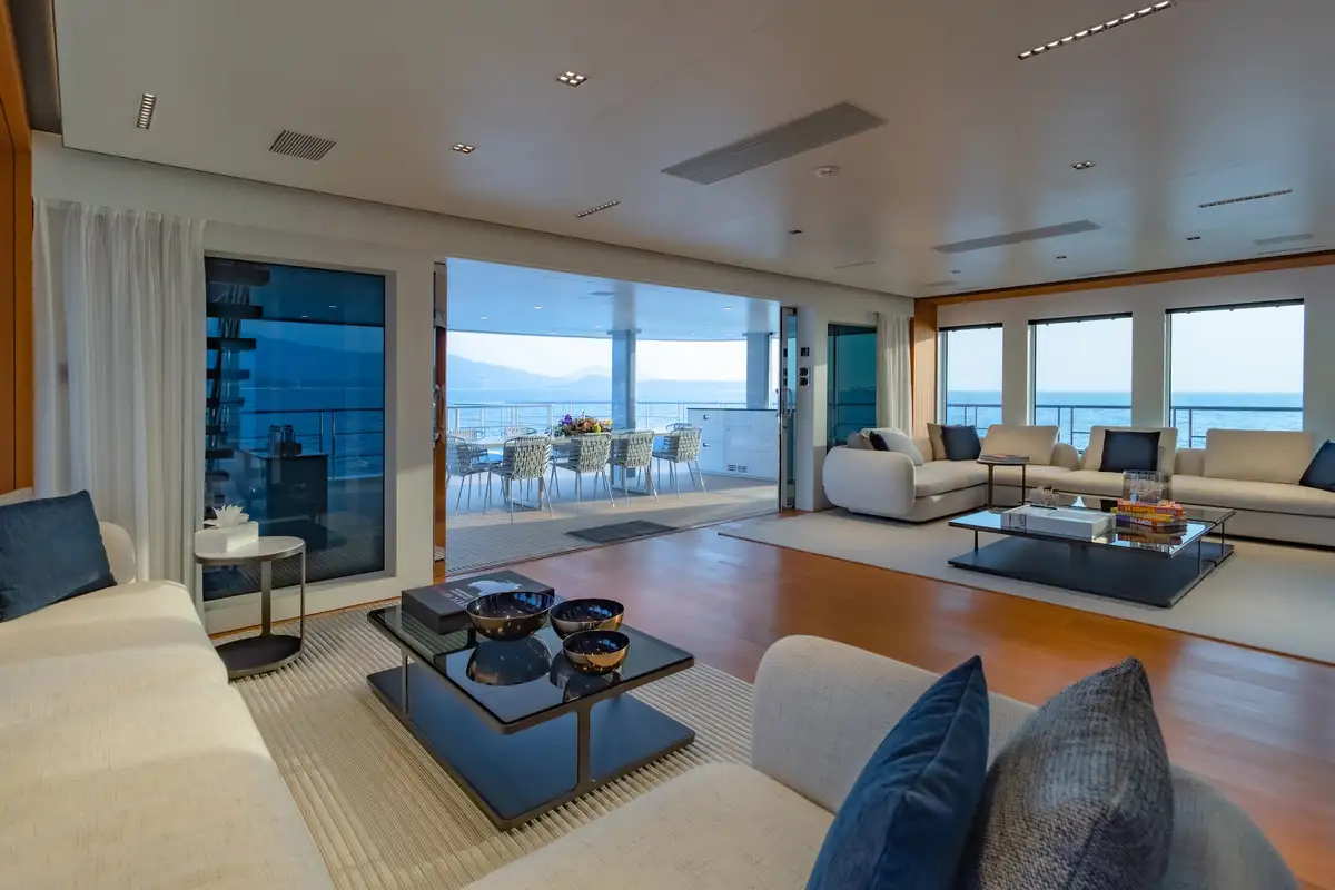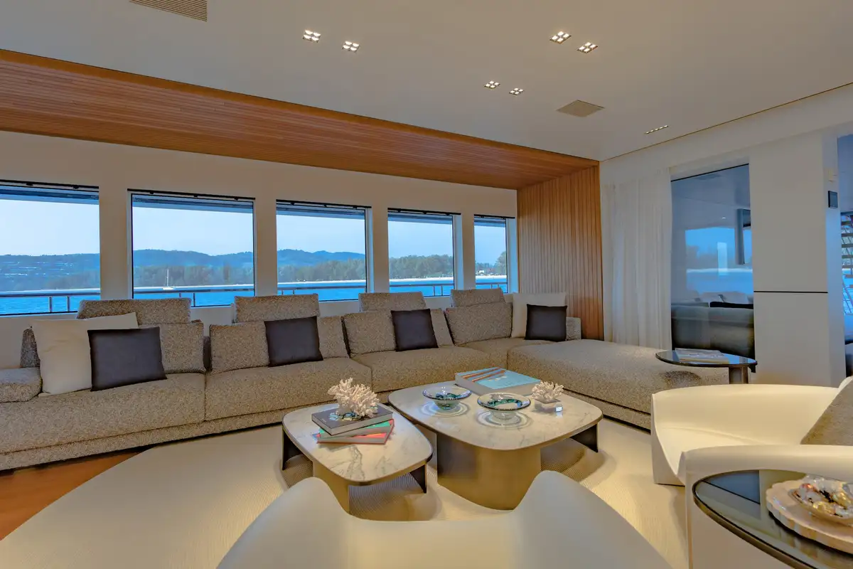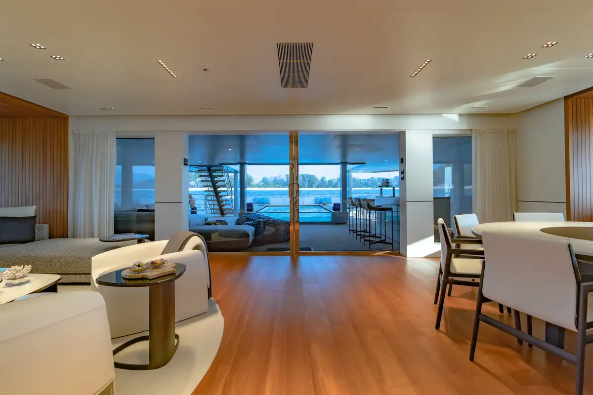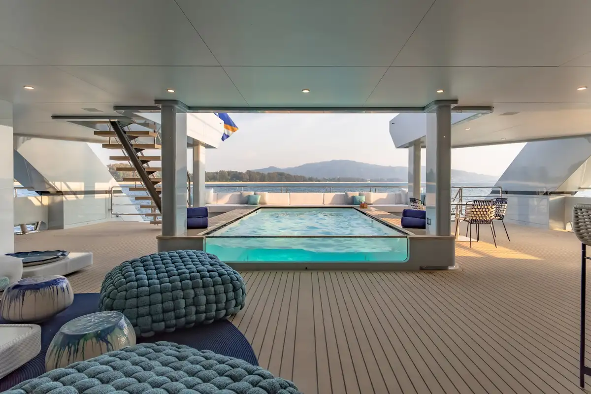 Interiors by Pulina Exclusive Interiors are warm and inviting, with a modern and polished finish. The main deck lounge is bright and spacious, with light pouring in through large windows. Sliding glass doors open out onto the main deck aft which is the standout space, boasting a swimming pool, shaded sofa seating, and a bar.