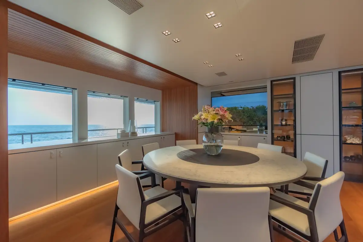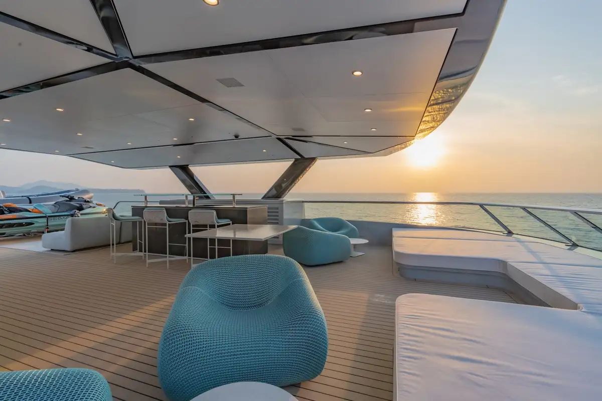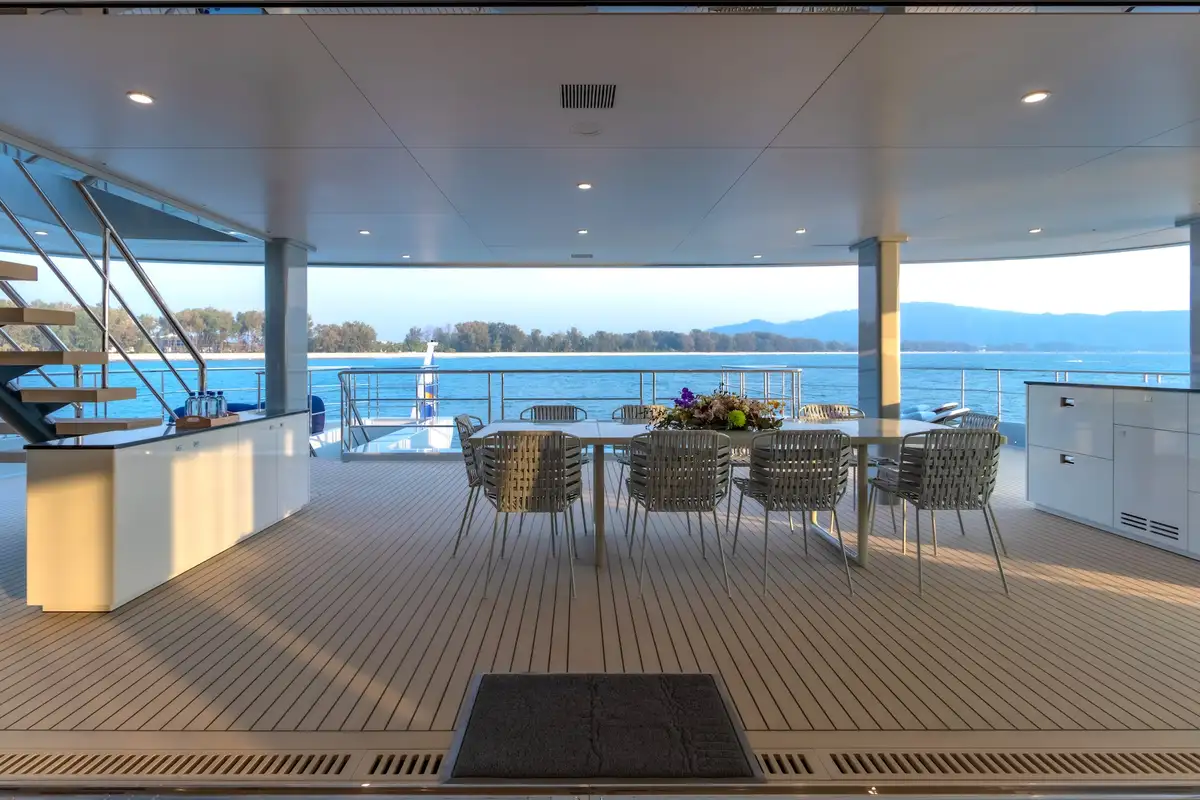 Above, the upper deck is the home of al fresco dining with ample space for all guests to come together, while the sun deck has sunpads forward and sofa seating all serviced by a bar.