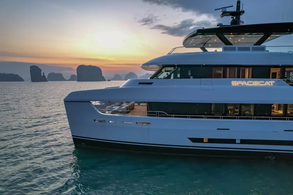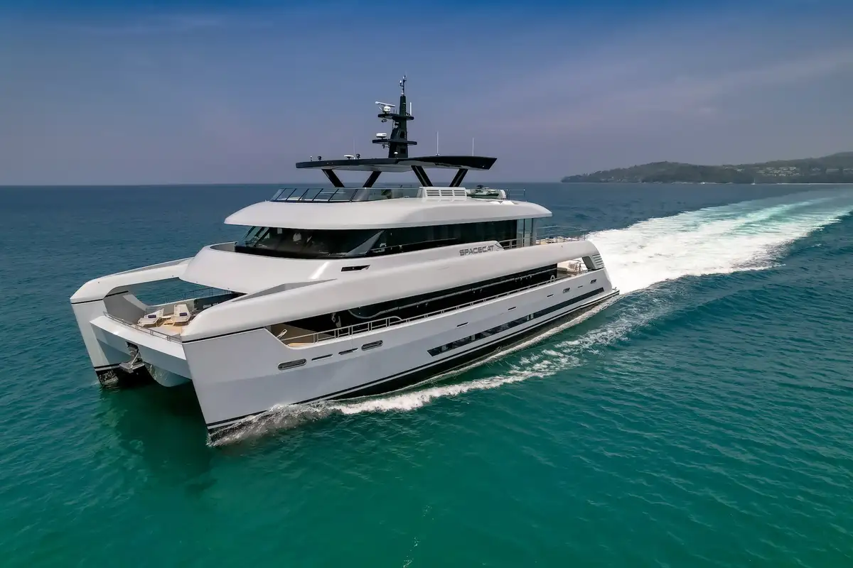 The 35.9m (117.9ft) catamaran SPACECAT was delivered in 2022, a collaboration between Australian shipyard SilverYachts and renowned designer Espen Oeino. The aim of the build was to redefine the modern sustainable yacht, and SPACECAT does just that through its slender and efficient design, offering vast deck spaces, astonishing interiors and unmatched stability.