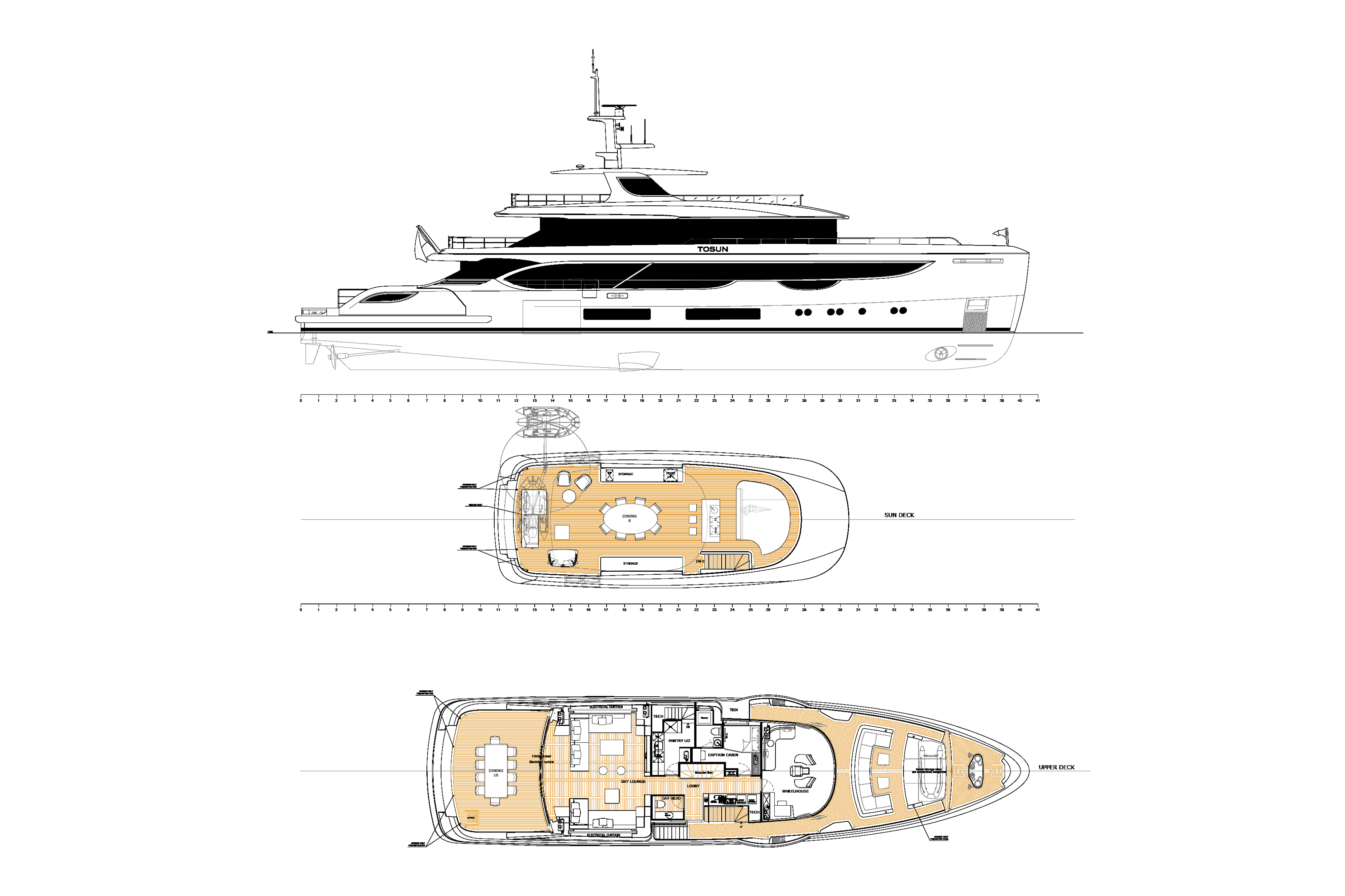 Not just for private use, TOSUN is also charter compliant and is a proven popular charter platform. Her GRP hull is built to RINA rules for classification of pleasure yachts. She is equipped with twin 1,400hp MAN engines that cruise at 14 knots and have a maximum speed of 16 knots. Her range at 11 knots is 4,000nm. She also features zero-speed stabilisers for comfort at anchor and underway.