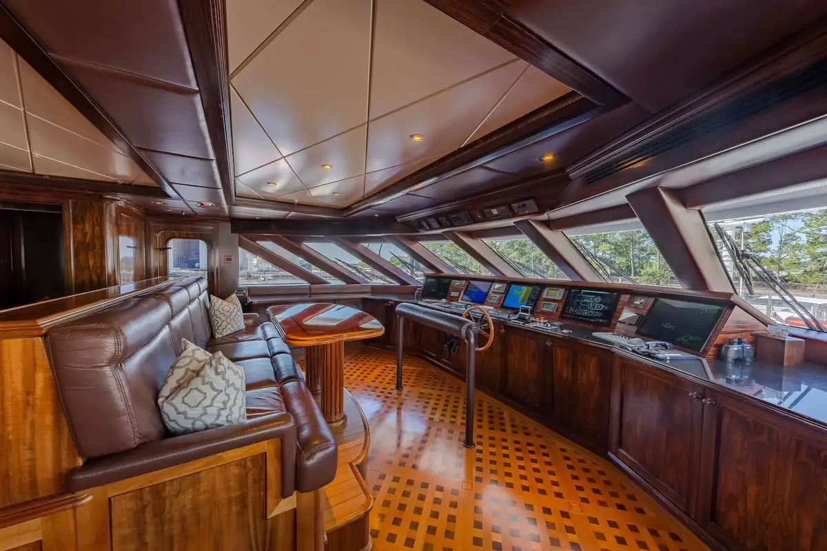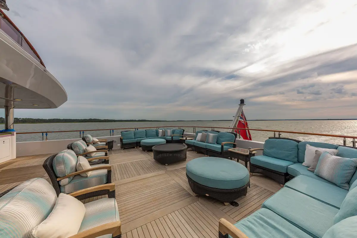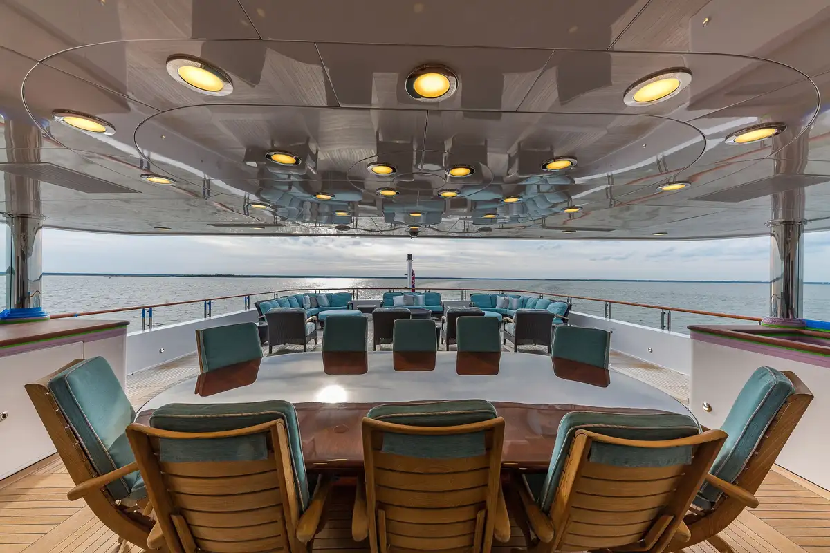 Her elegant main saloon leads into a separate formal dining area, and her expansive sky lounge features a bar, lounge area and game tables. Al fresco dining is available on the bridge deck aft along with a large seating area. Her large sun deck offers an array of areas for entertainment and relaxation with sunpads, a bar, exercise equipment and an oversized jacuzzi.