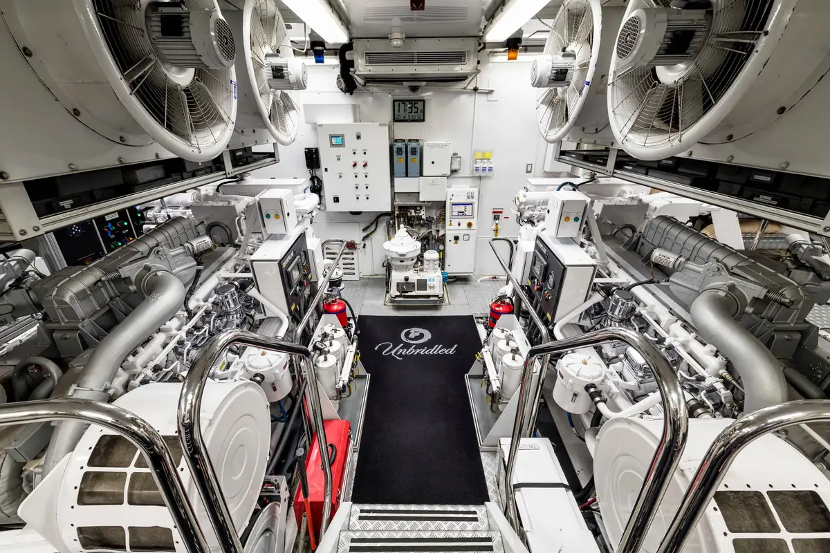 UNBRIDLED is a proven global cruising platform and comes with an enviable charter record. Her six adaptable cabins include a full beam master on the main deck with a private study, a convertible cabin also on the main deck and four additional guest cabins on the lower deck. Two are VIP cabins with double beds while the other two cabins have double beds along with a single bed and pullman. All guest cabins have en suite bathroom facilities. In total the yacht can accommodate up to 16 guests comfortably.