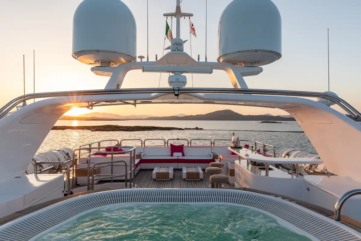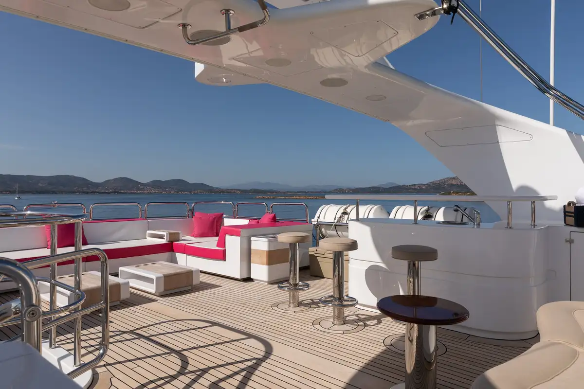 - Sun deck packed with amenities including a jacuzzi, wet bar, and viewing chairs fixed forward