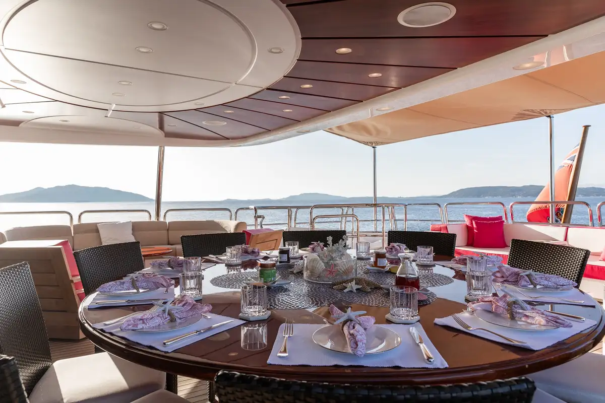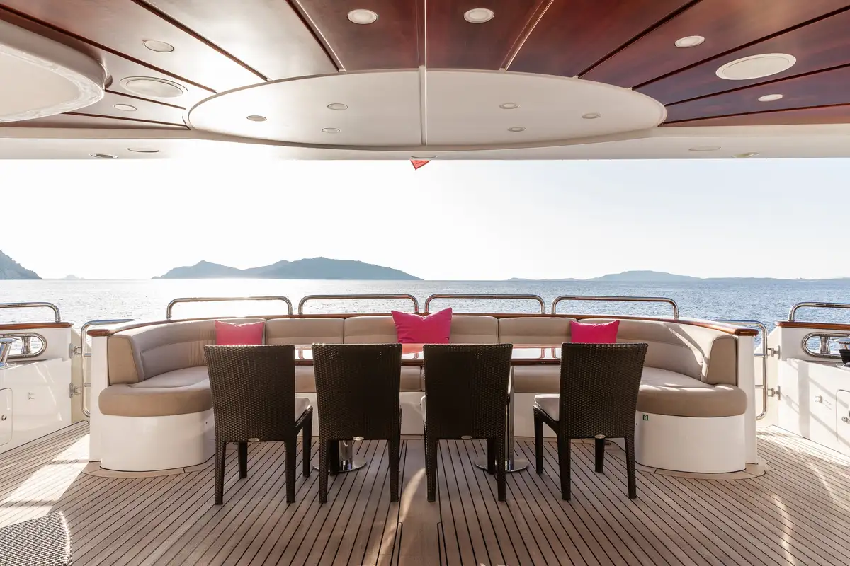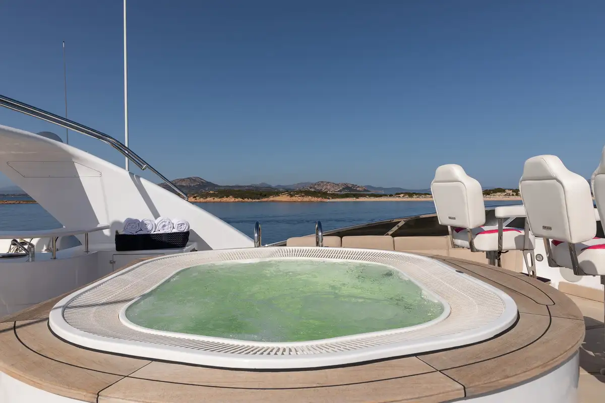 Outdoor living is equally impressive. The aft deck is configured for al fresco dining and entertainment, featuring built-in bench seating, a dining table, and chairs. The expansive sundeck offers panoramic views and is equipped with a jacuzzi, gym equipment, sun pads, and a bimini top aft for shade and comfort.