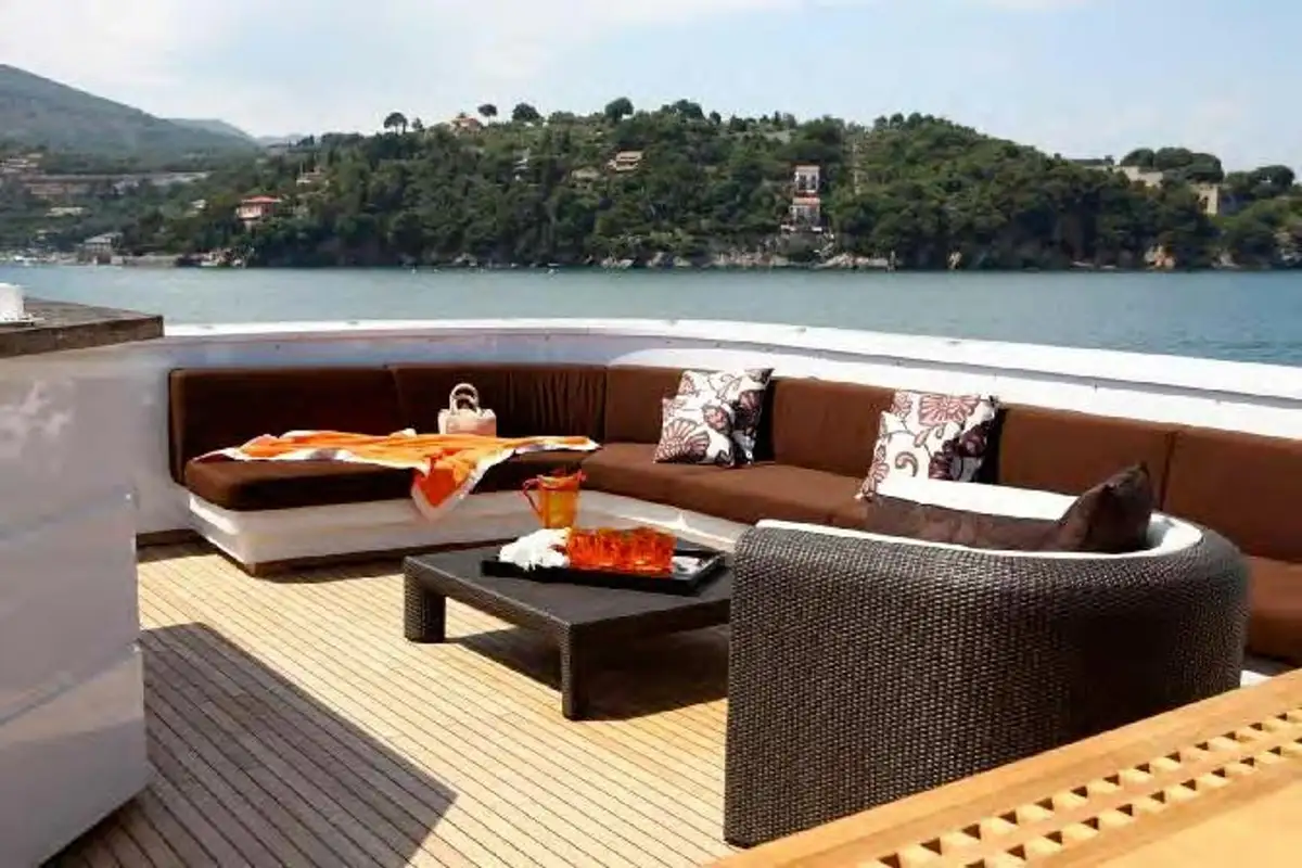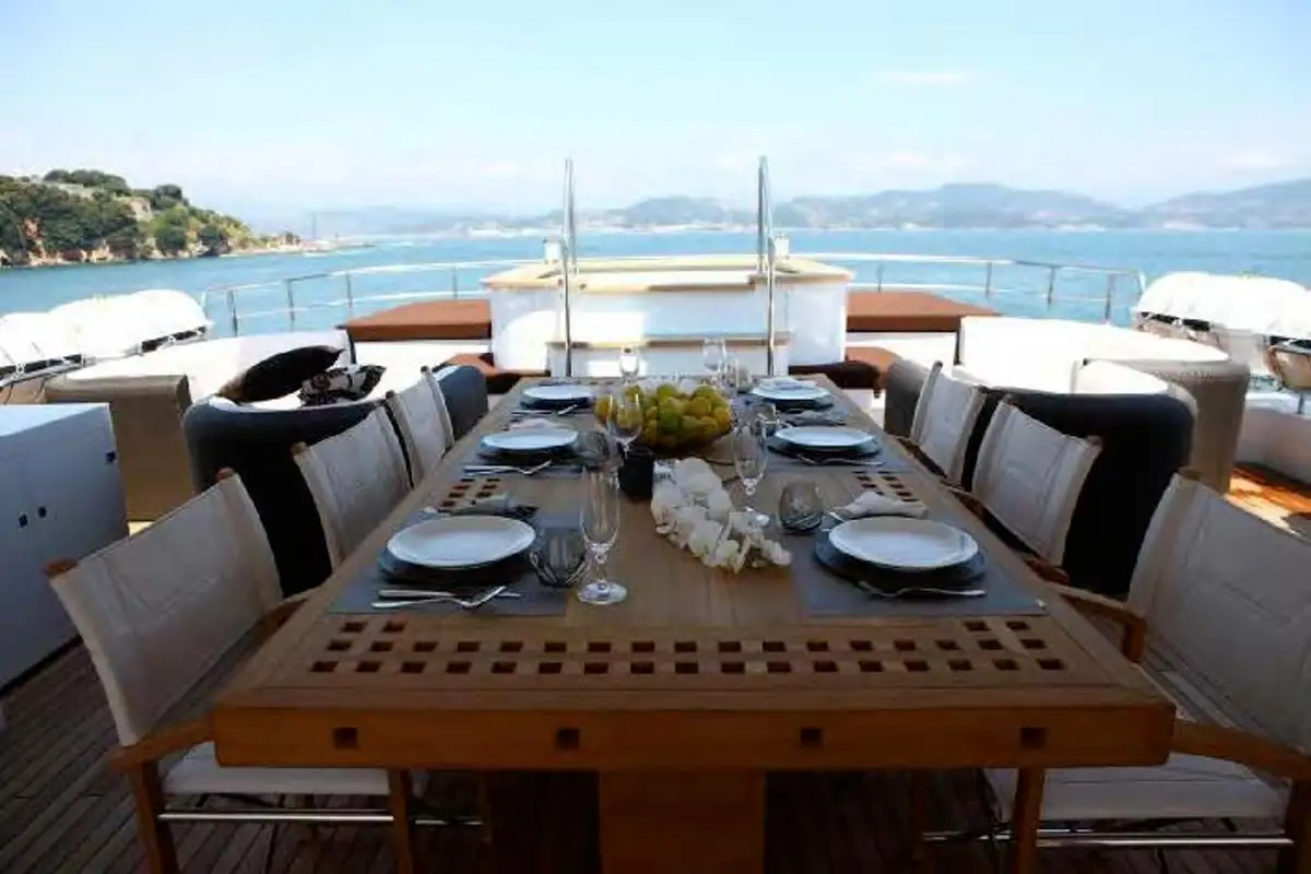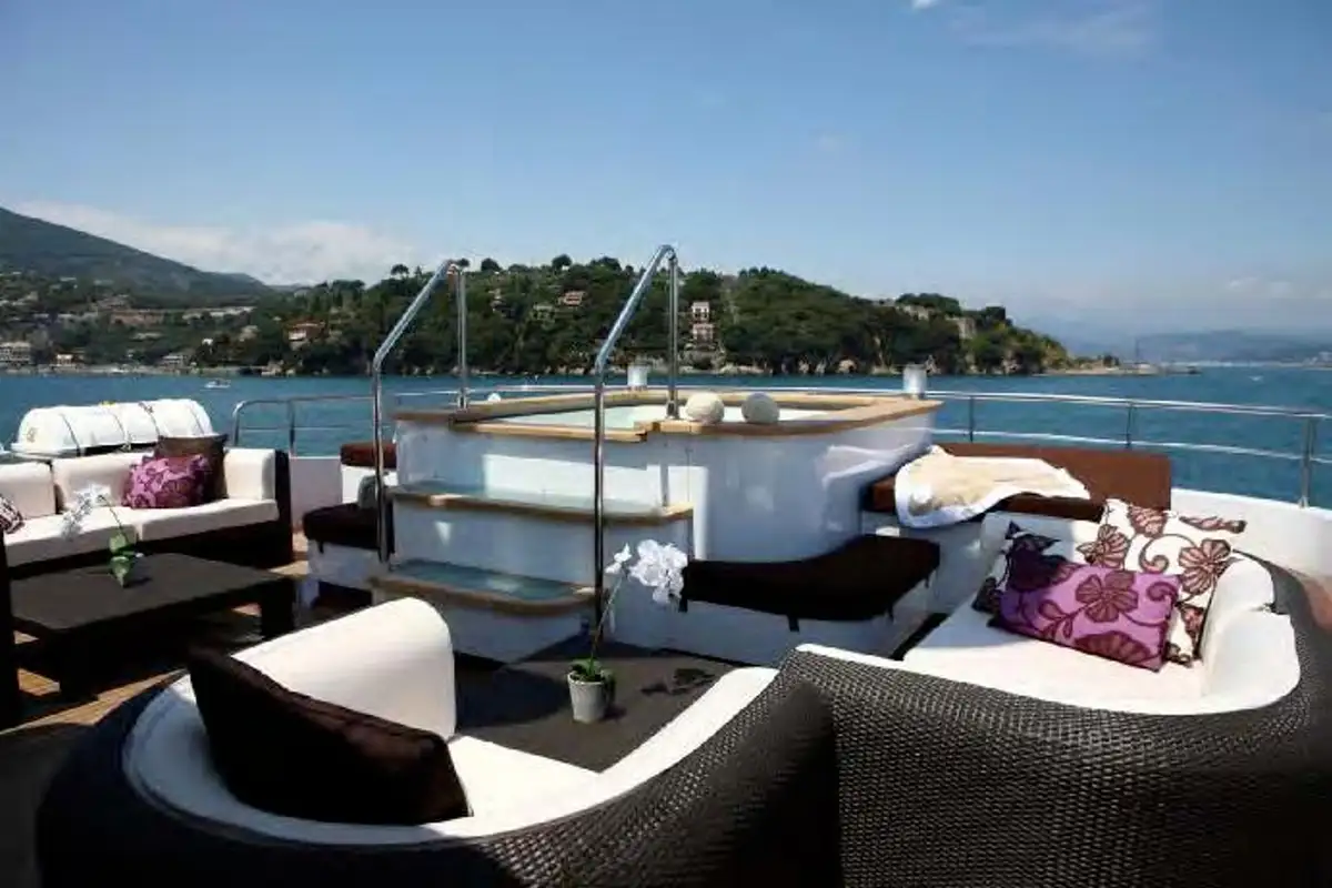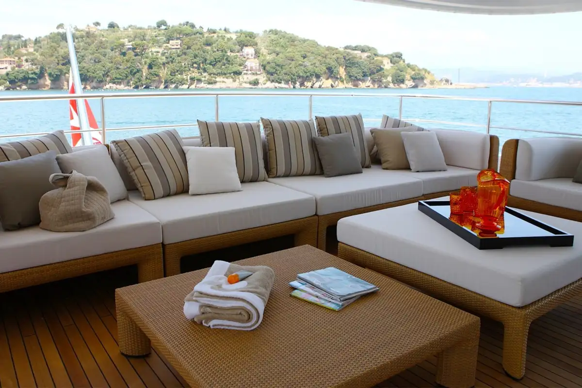 ZALIV III offers plenty of exterior space on three decks; the main deck features a large shaded aft deck with comfortable seating on three cushioned settees with coffee tables, the upper deck offers many options for sunning and relaxing on the various comfortable seating choices and sunpads, the deck also includes a large pool and an alfresco dining option. While the second deck is reserved for the exclusivity of the master cabin and features a private seating area.